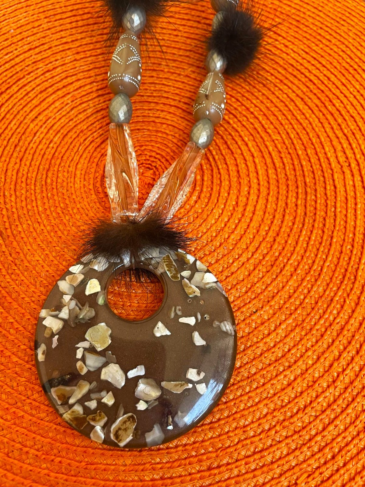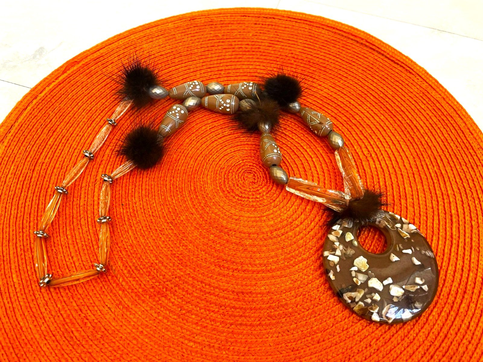 zaujímavý a nevšedný náhrdelník,super k hrubému roláku alebo pletenému svetru,top stav, s kožušinkovými detailami...