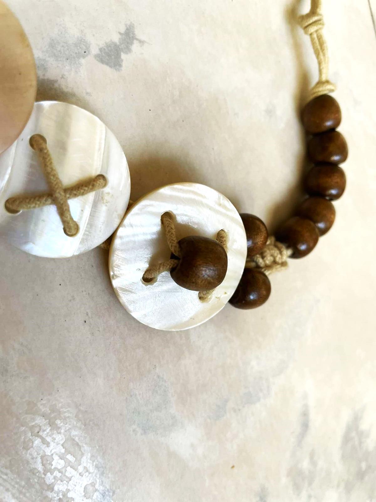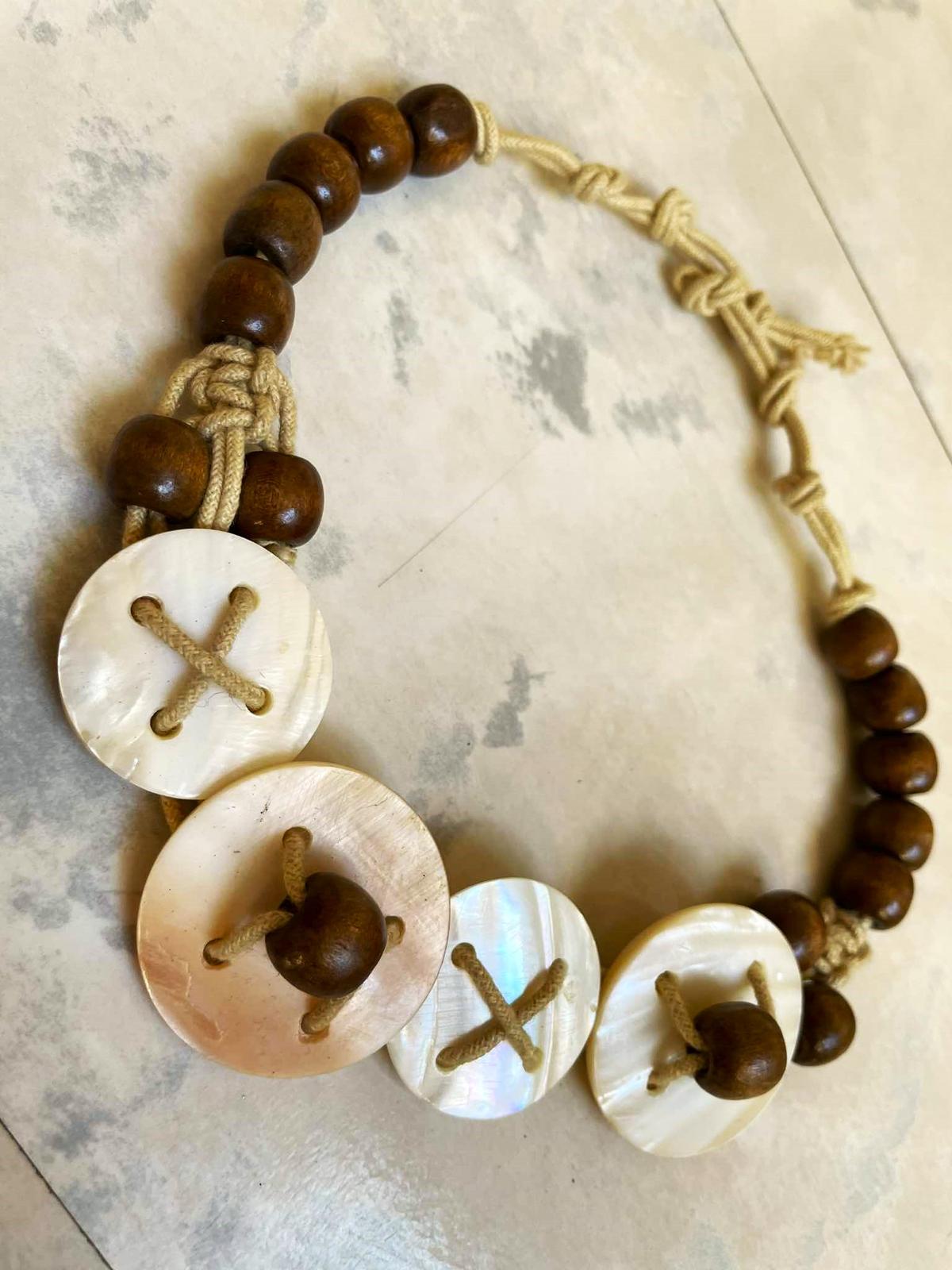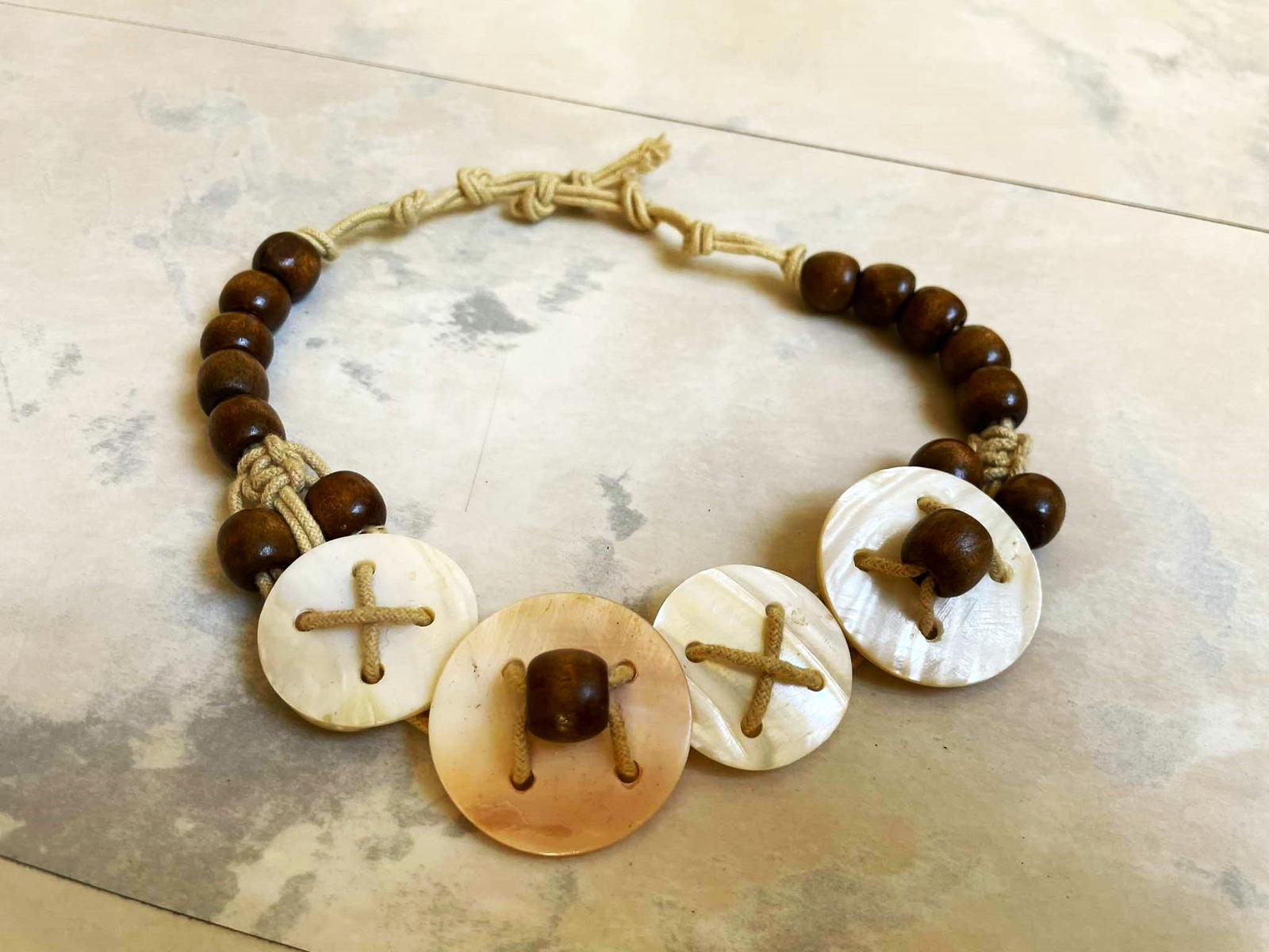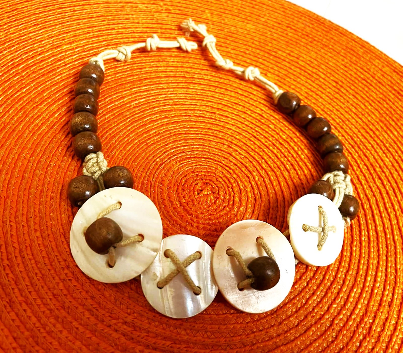 nezvyčajný obojok na krk dovezený z Talianska,z naturálnych materiálov,juta,perleťové gombíky,drevené korálky,top doplnok,dlžka = 43/44 cm, priemer najväčšieho gombíka = 4 cm