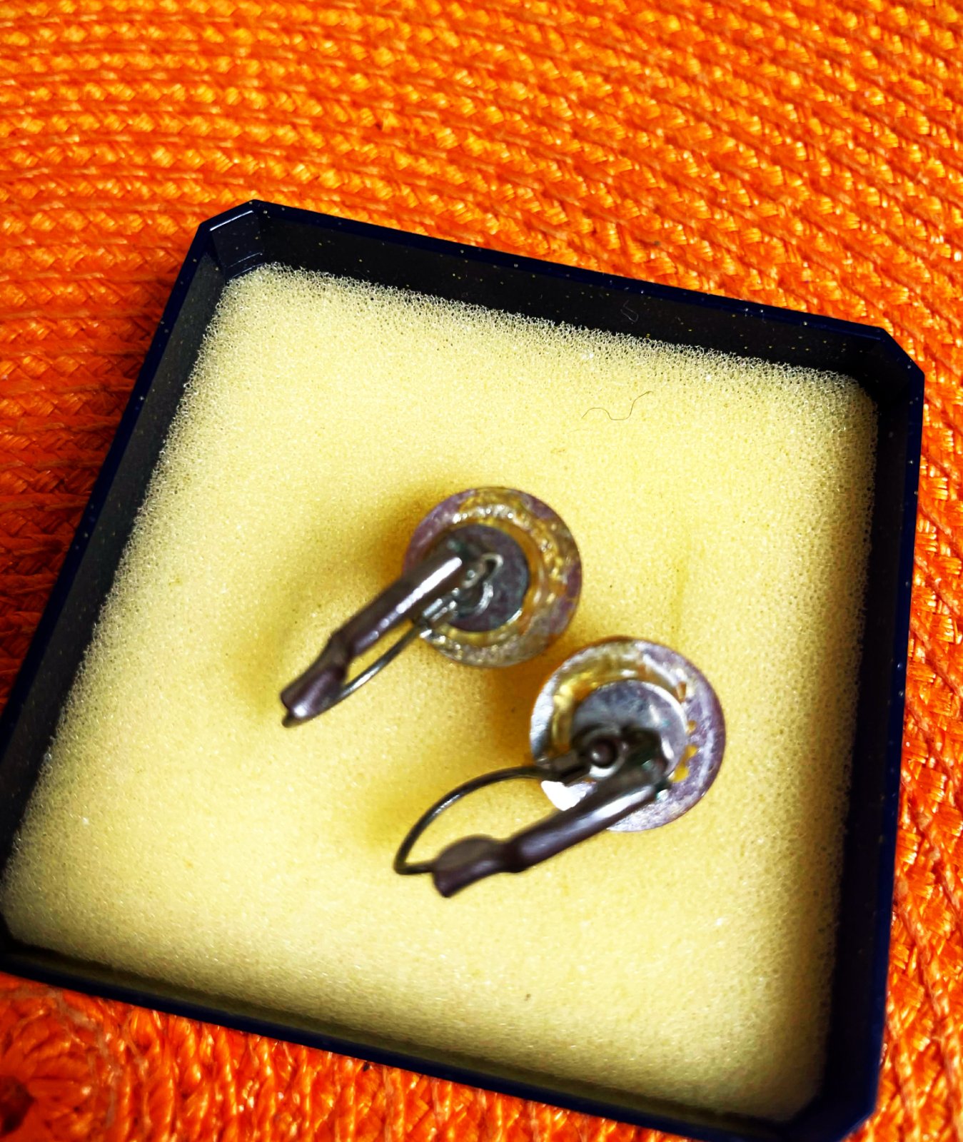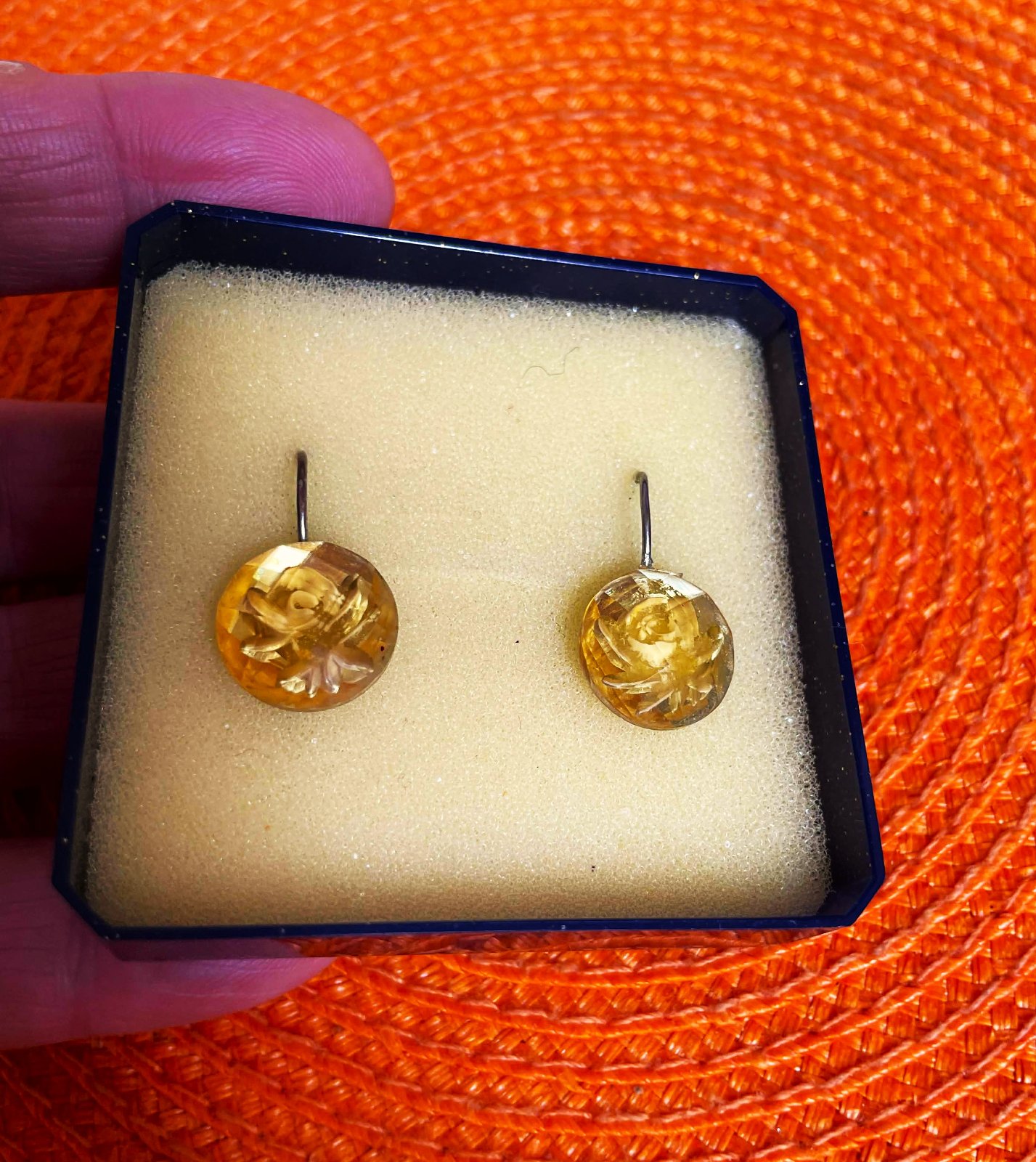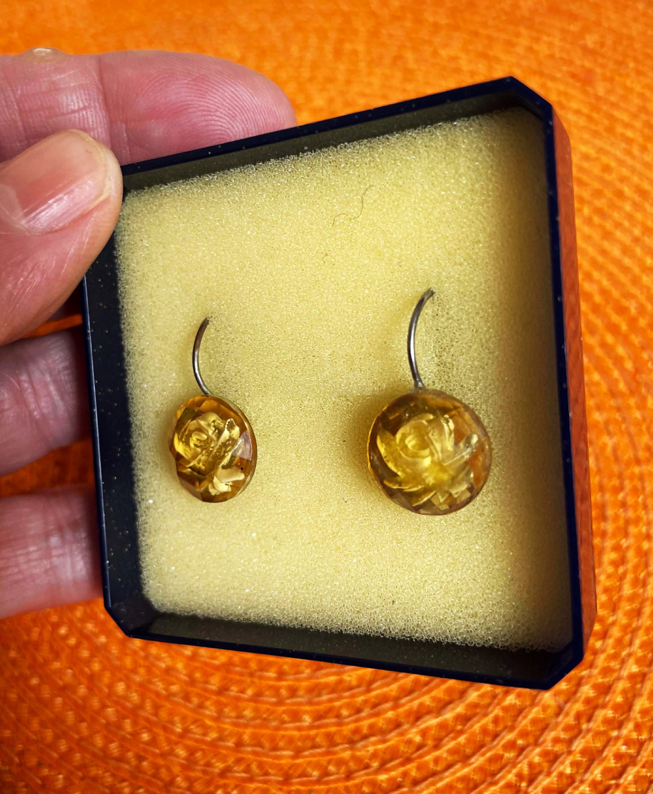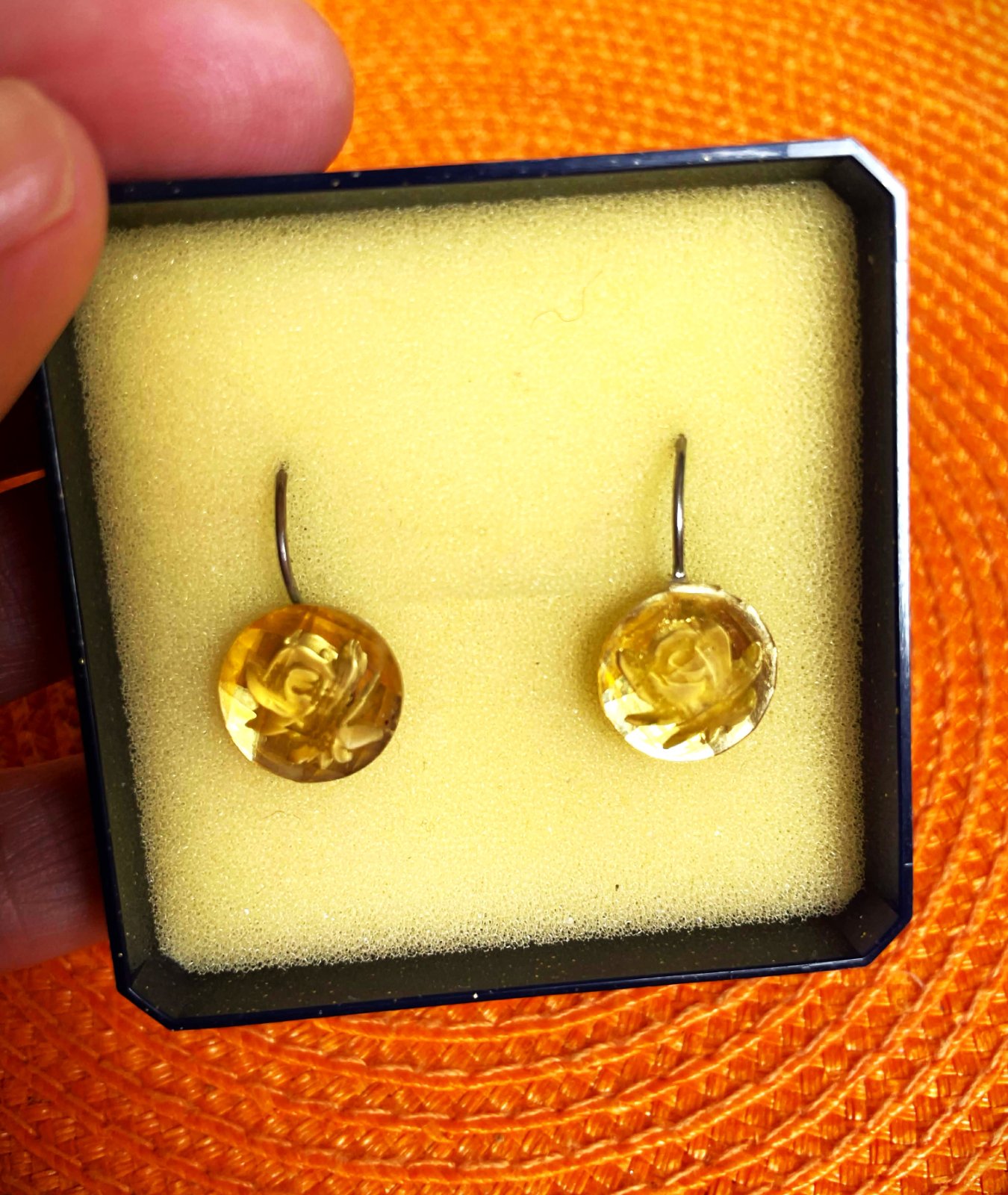krásne zaujímavé náušnice s imitáciou syntetického baltského jantáru, s motívom ruže,brúsenie kamienka vytvára krásny trojrozmerný efekt,na zadnej strane sú jemne poškodené - lepená plocha háčiku,ale nie je to pri nosení vôbec vidno - ale upozorňujem,viď foto