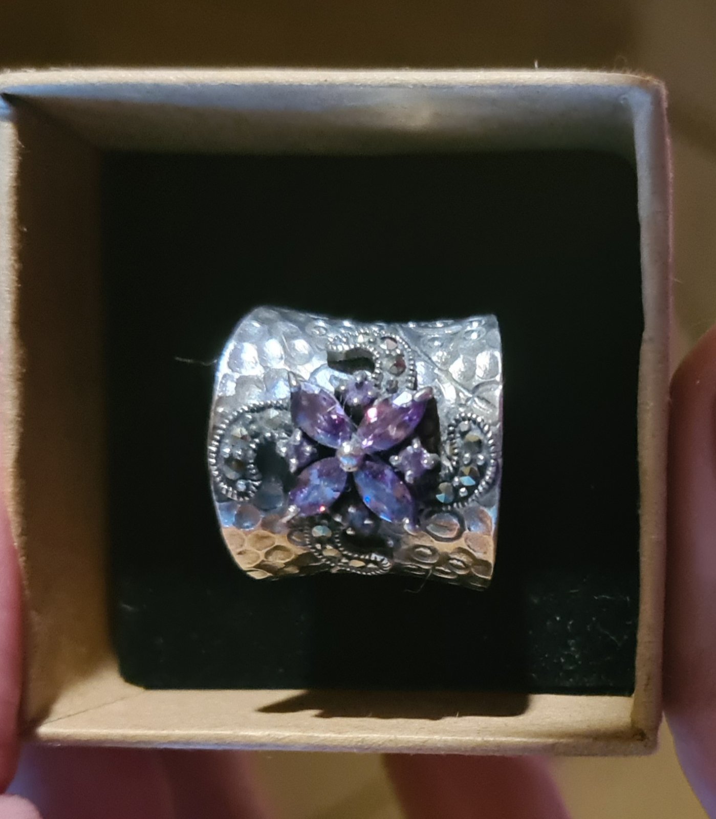 Predám masívny strieborný prsteň s polodrahokamom, pravdepodobne ametyst a markazity. Nastaviteľná veľkosť. Len mi leží v šuflíu... Ag - pravé striebro.