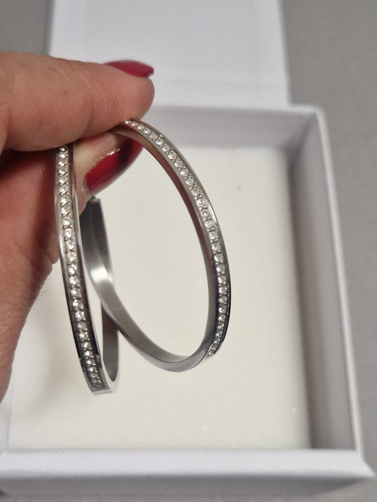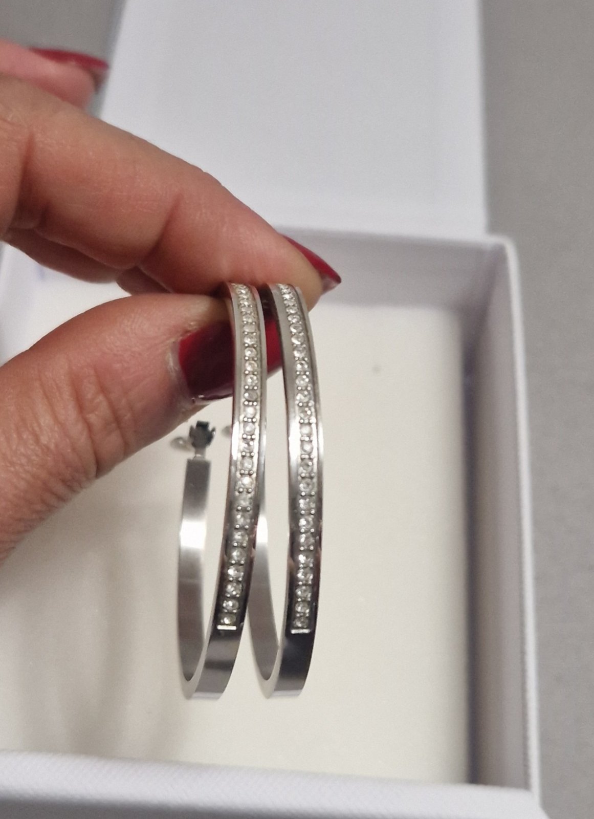 predám náušnice Guess, priemer 5 cm, vyrobené z kvalitnej chirurgickej ocele s trblietajúcimi čírymi kryštámi prednej polovice náušnice, málo nosené, bez poškodení