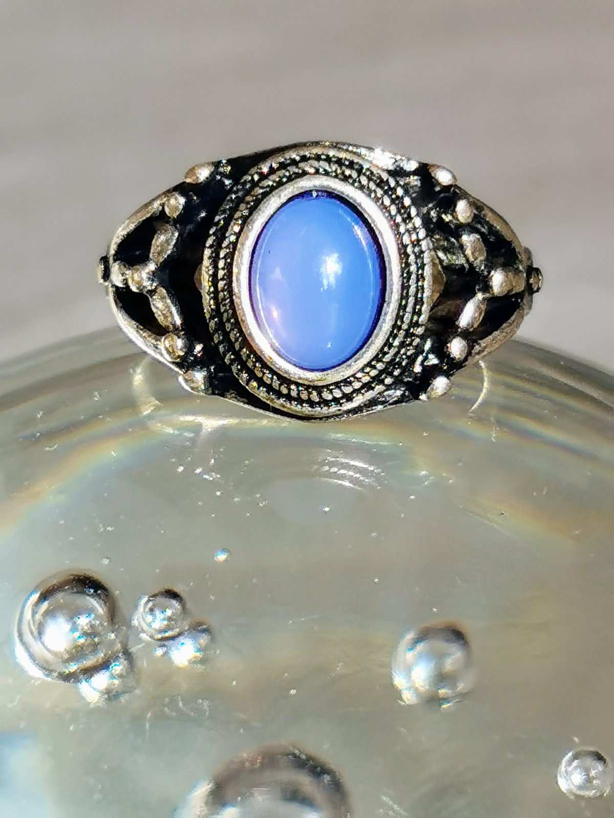 Krásny strieborný prstienok s opálovo modrým okom a gravírovaným vzorom kvietkov po stranách.