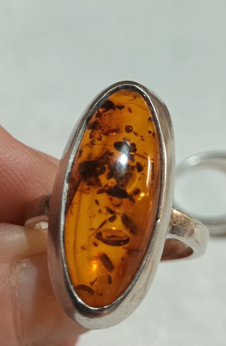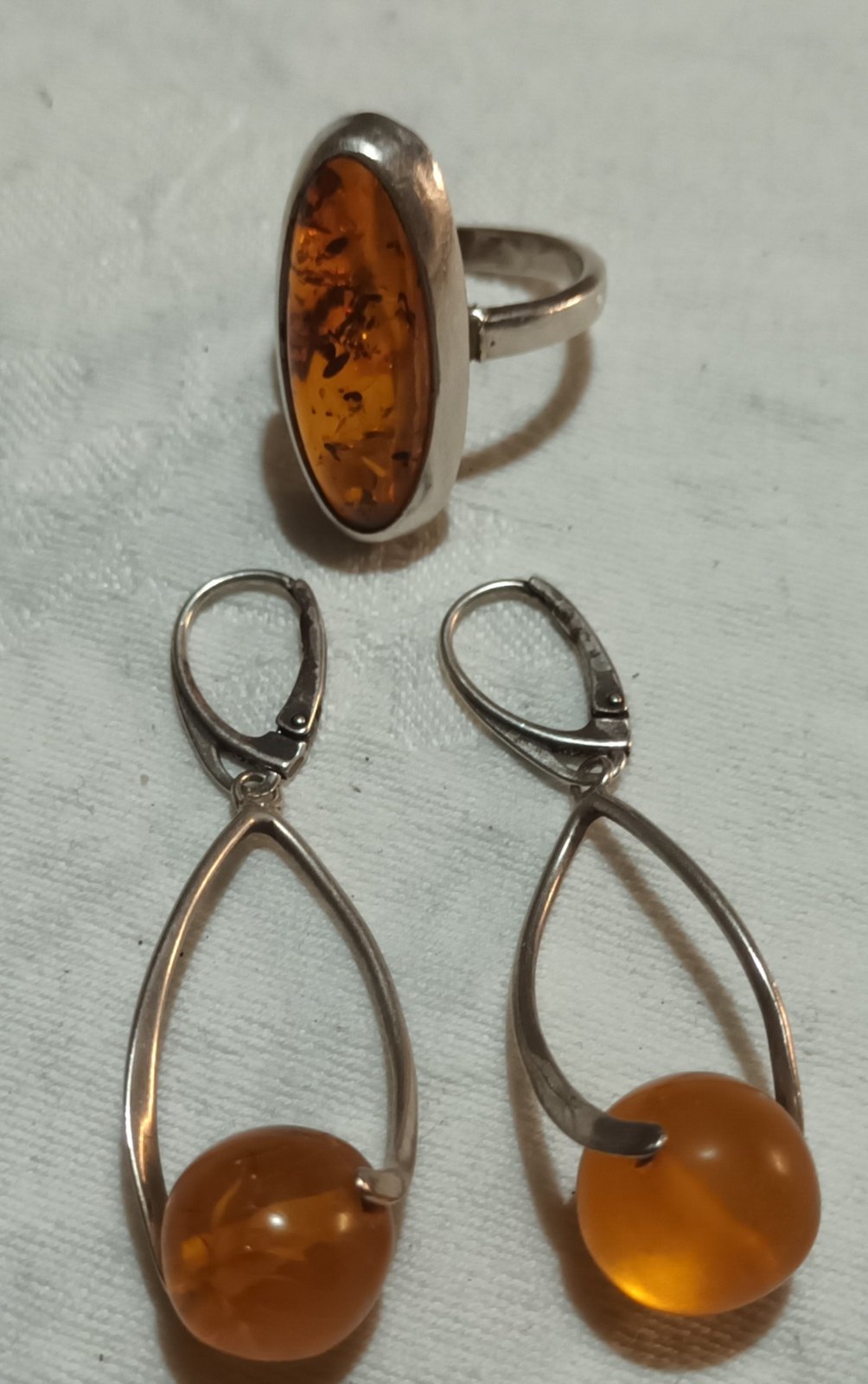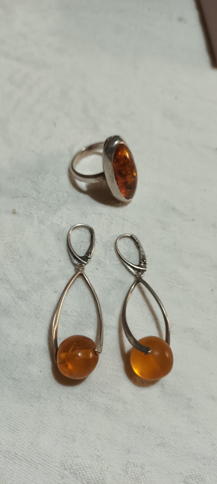 Strieborny prsten a nausnice prsten velkost 58....nevidim punc,ale overene v 3 zlatnictvach,kamen je jantar....aj nausnice