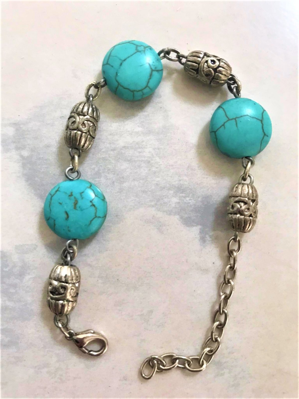 zaujímavý náramok z mexického striebra s jemnou patinou,krásnym vypracovaním, 3 prírodnými kameňmi = tyrkenit,top stav ,ako nový - preto vhodný aj ako krásny darček