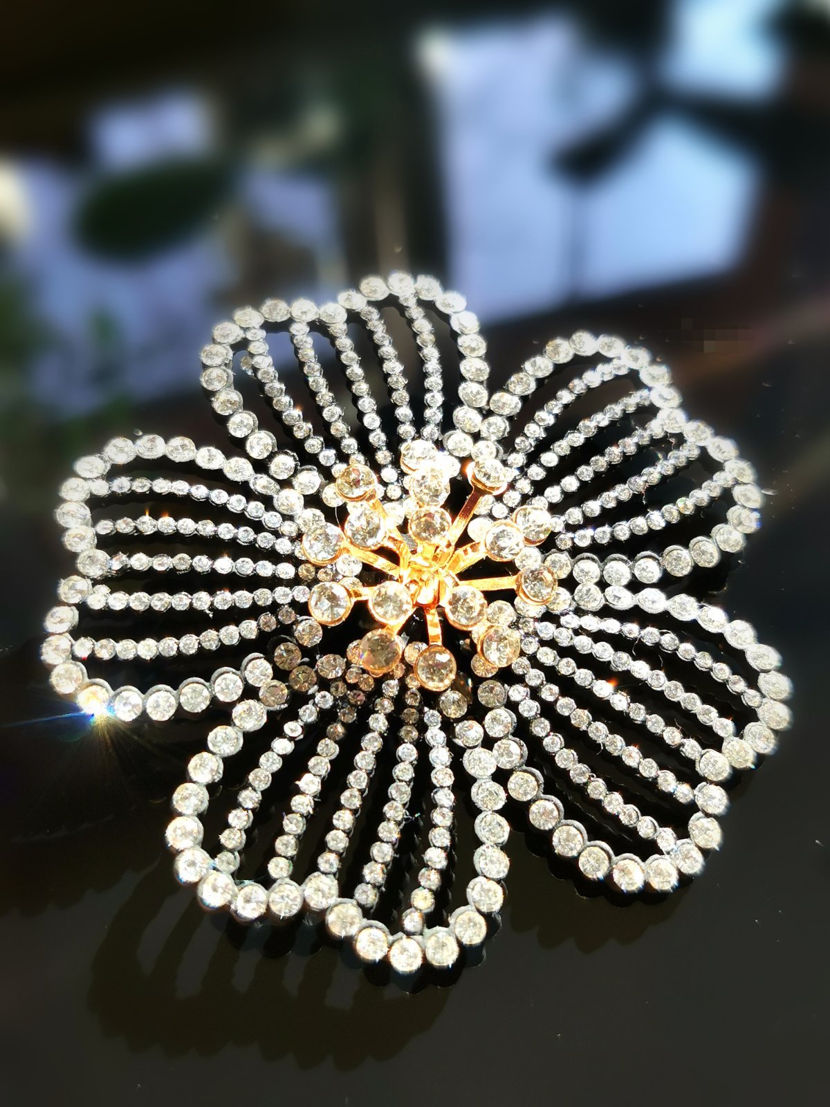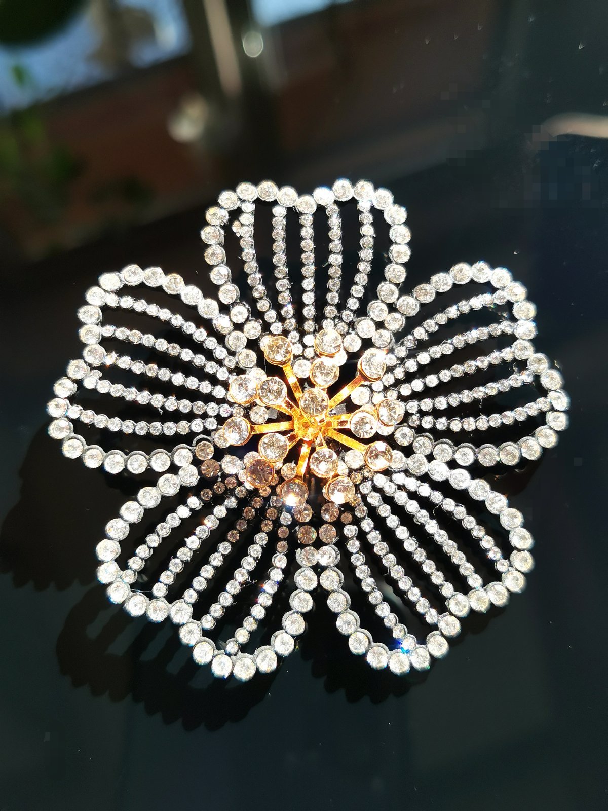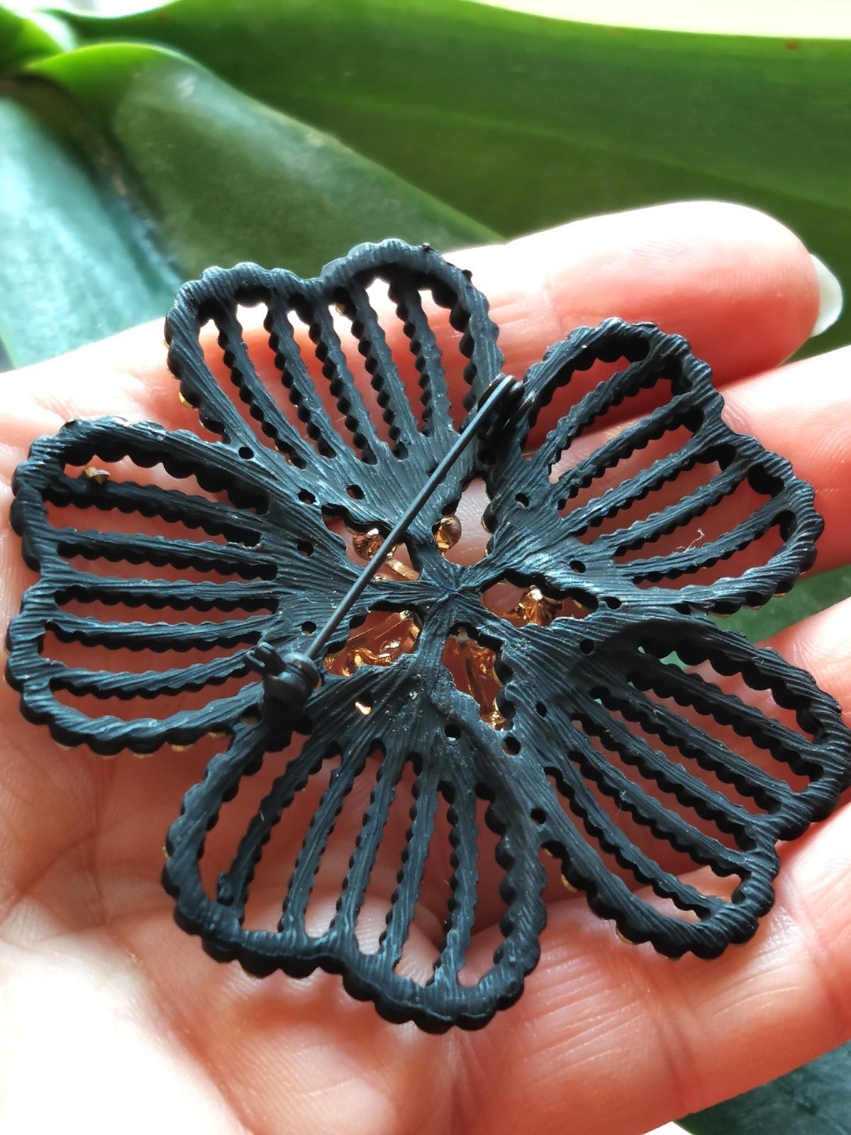 Ponúkam krásnu brošňu v tvare kvetu. Je čierna, posiata zirkónmi, uprostred má vystúpli okolík v zlate. Veľmi efektná a nadčasová ozdoba na kabátik, klopu saka, či kabelku. Vždy pritiahne pohľad aj vďaka veľkosti.