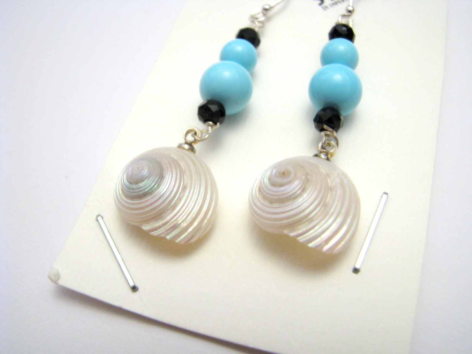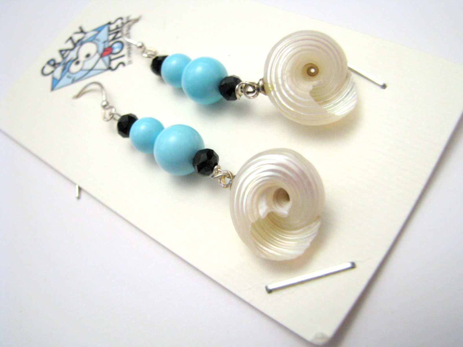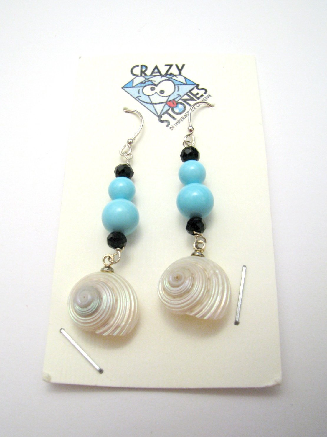 Nové nepoužívané náušnice s tyrkysovými a čiernymi korálkami a skutočnými malými slimáčimi ulitami - sú perleťové s farebnými odleskmi, ktoré fotky žiaľ nezachytili. Naživo sú ešte krajšie. Rozbalené len na odfotenie.