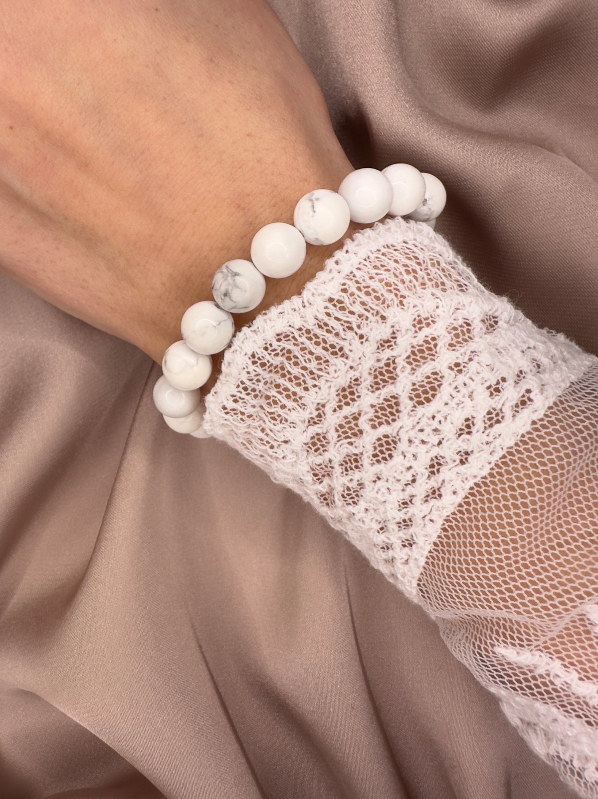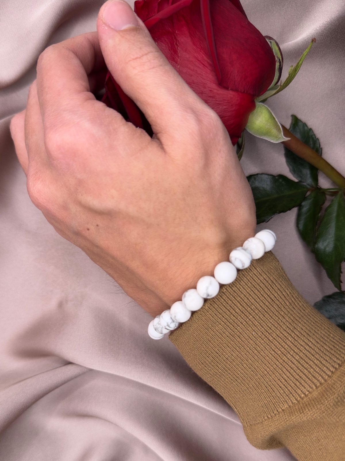 Elegantný náramok z prírodného minerálu howlit (8mm), ktorý je známy svojimi upokojujúcimi účinkami a schopnosťou podporovať rovnováhu a sebavedomie. Perfektný ako doplnok pre každodenný štýl aj výnimočné príležitosti.