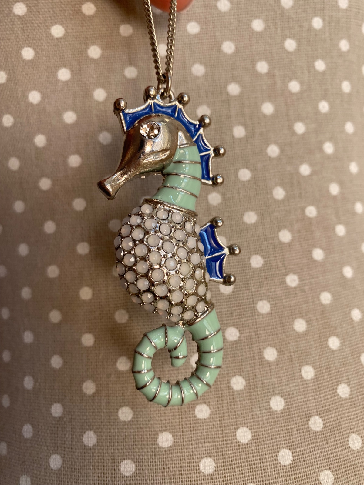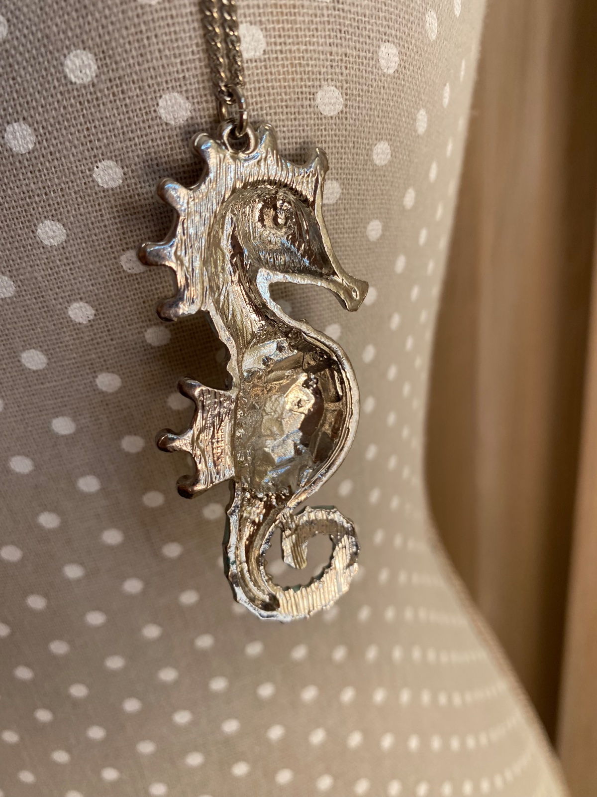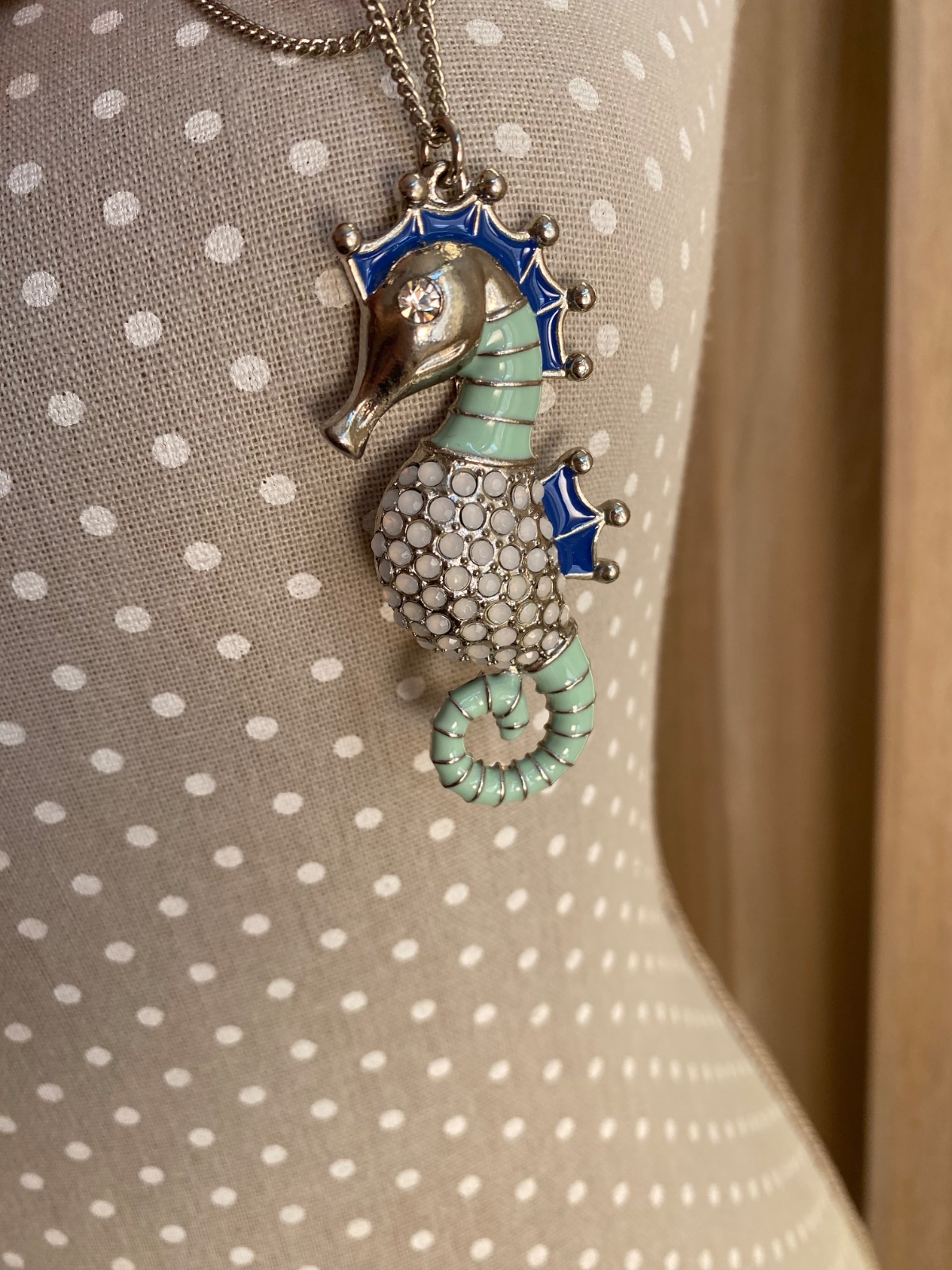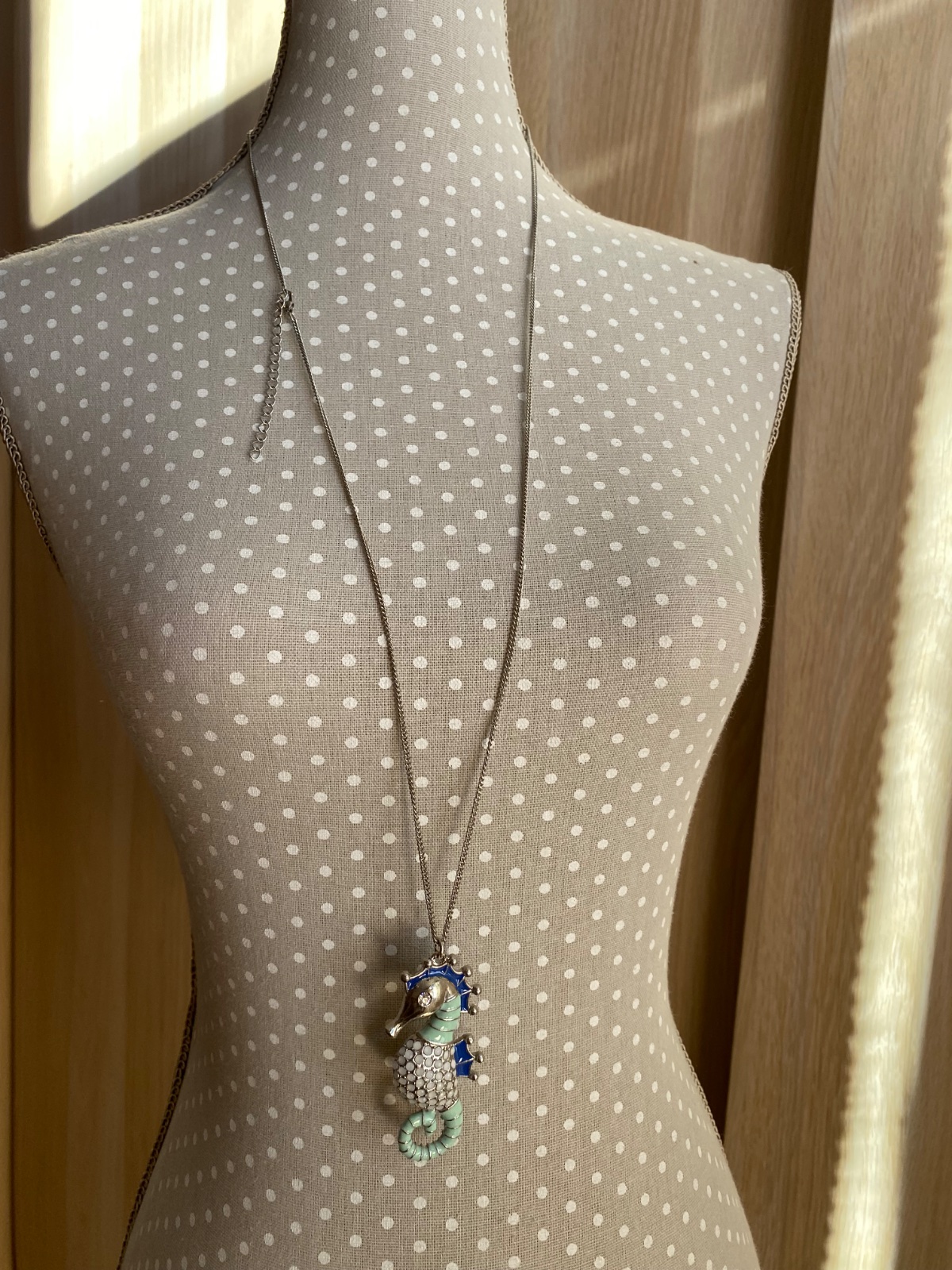Dlhý náhrdelník s morským koníkom s kryštálikom; nosený v peknom stave