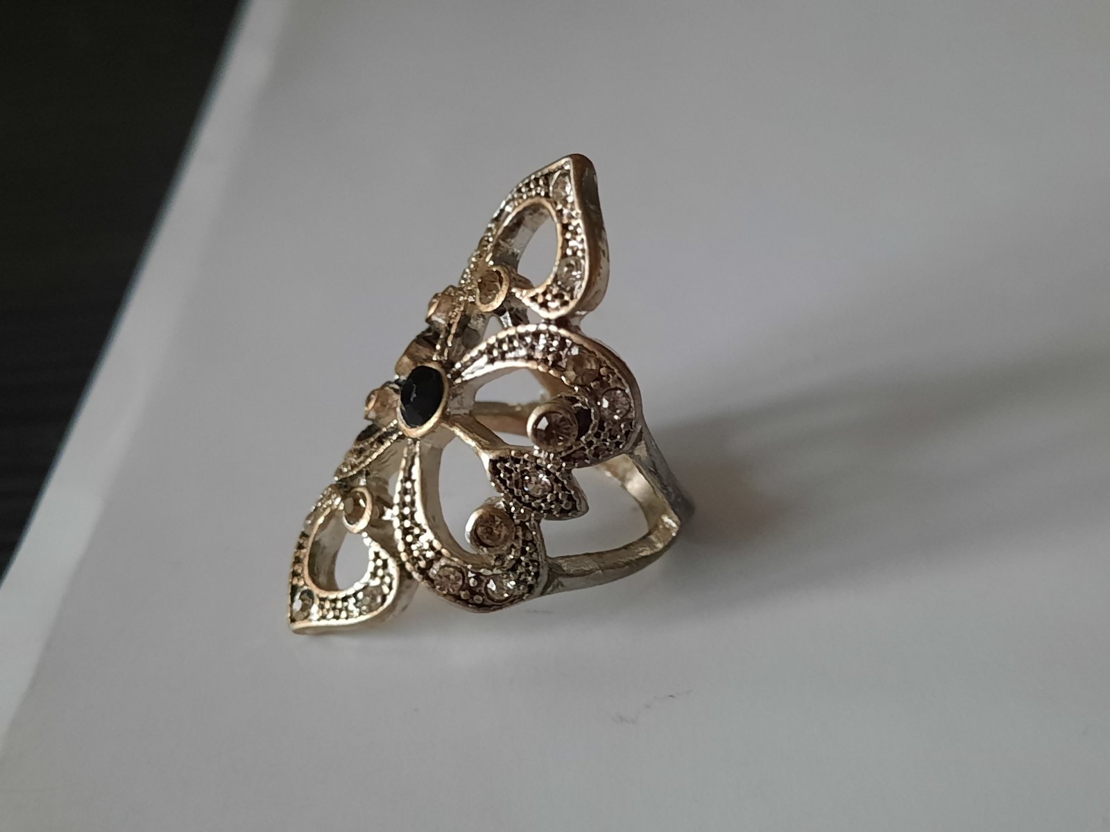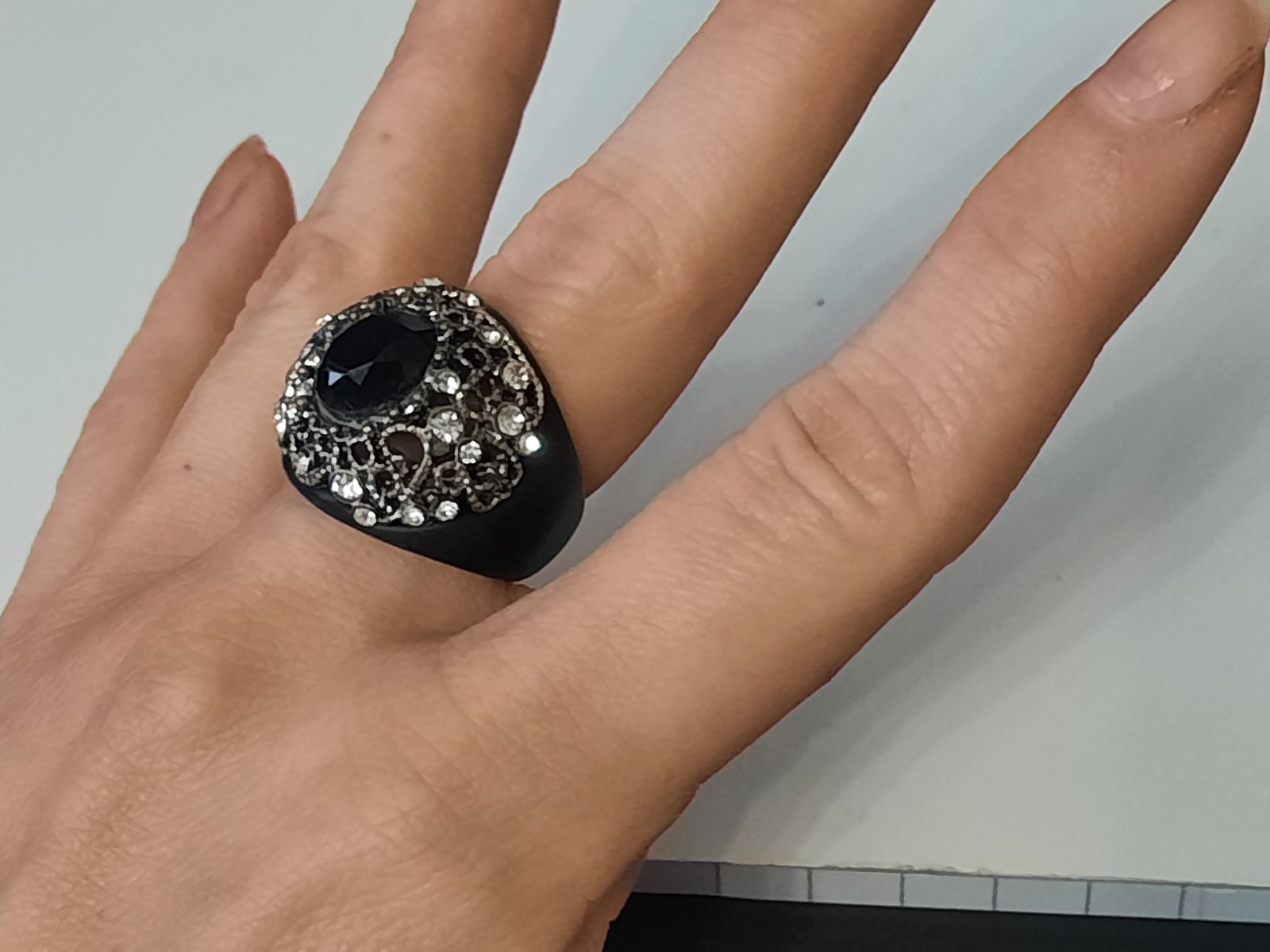 2. Čierny prsteň s kamienkom v strede a malými falošnými bielymi diamantami okolo. Veľkosť S/M. (5€)