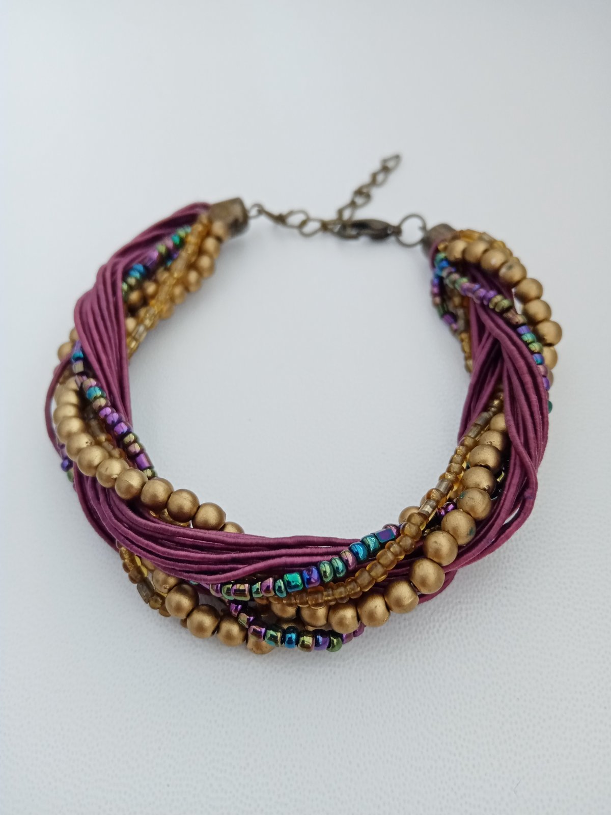 Krásny náramok v zlato fialových farbách. Nastaviteľná veľkosť. Nosený len veľmi málo.