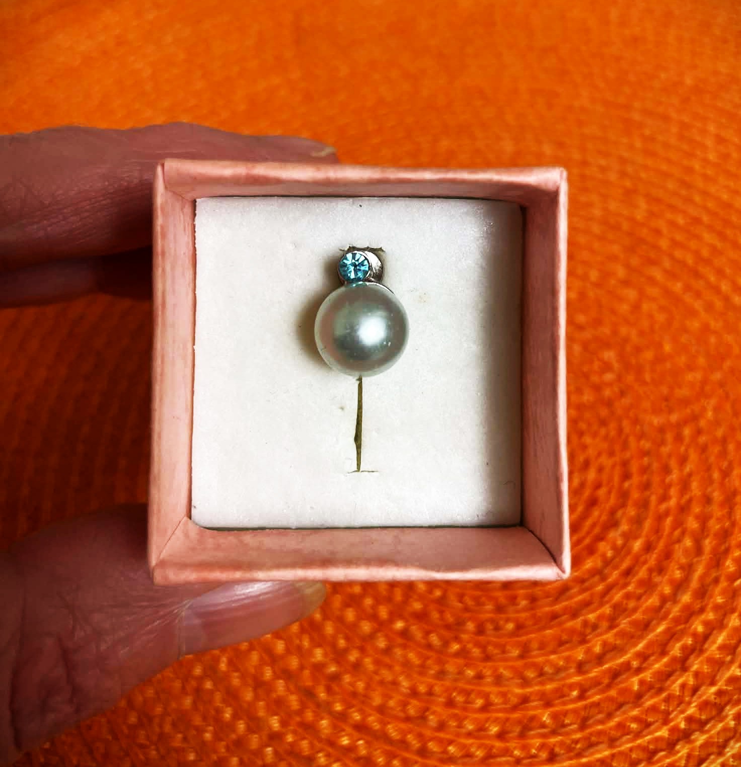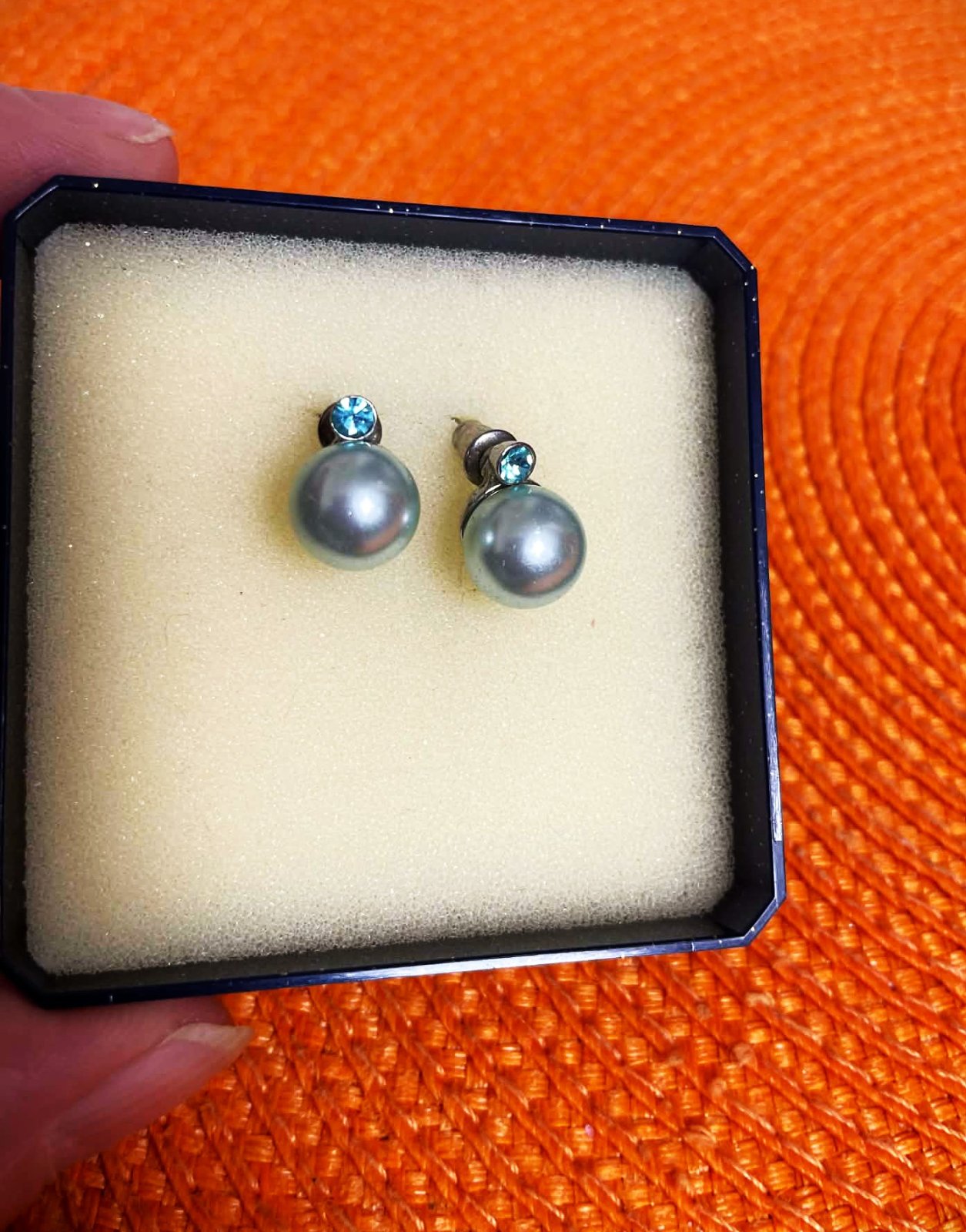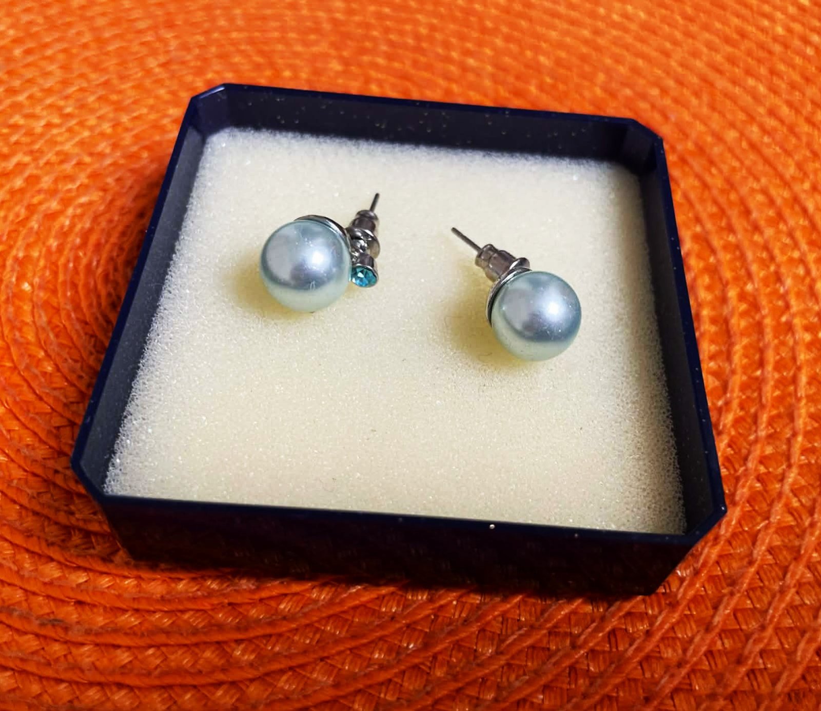 napichovacie náušnice so syntetickou perlou a malým modrým zirkónom,veľmi elegantné, farba je ako na fotke, taká bledomodrá jemne do odtieňa mätovej,nie je to striebro,ale kvalitná bižutéria
