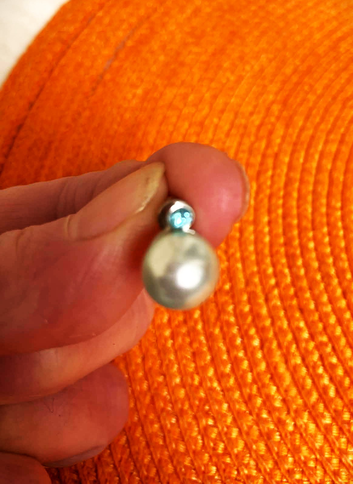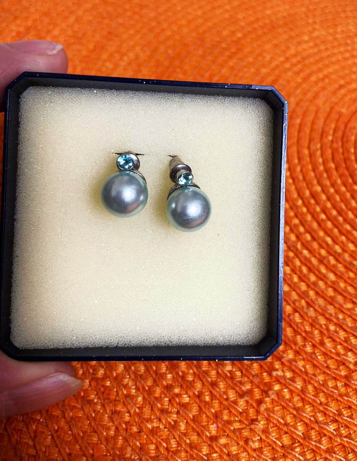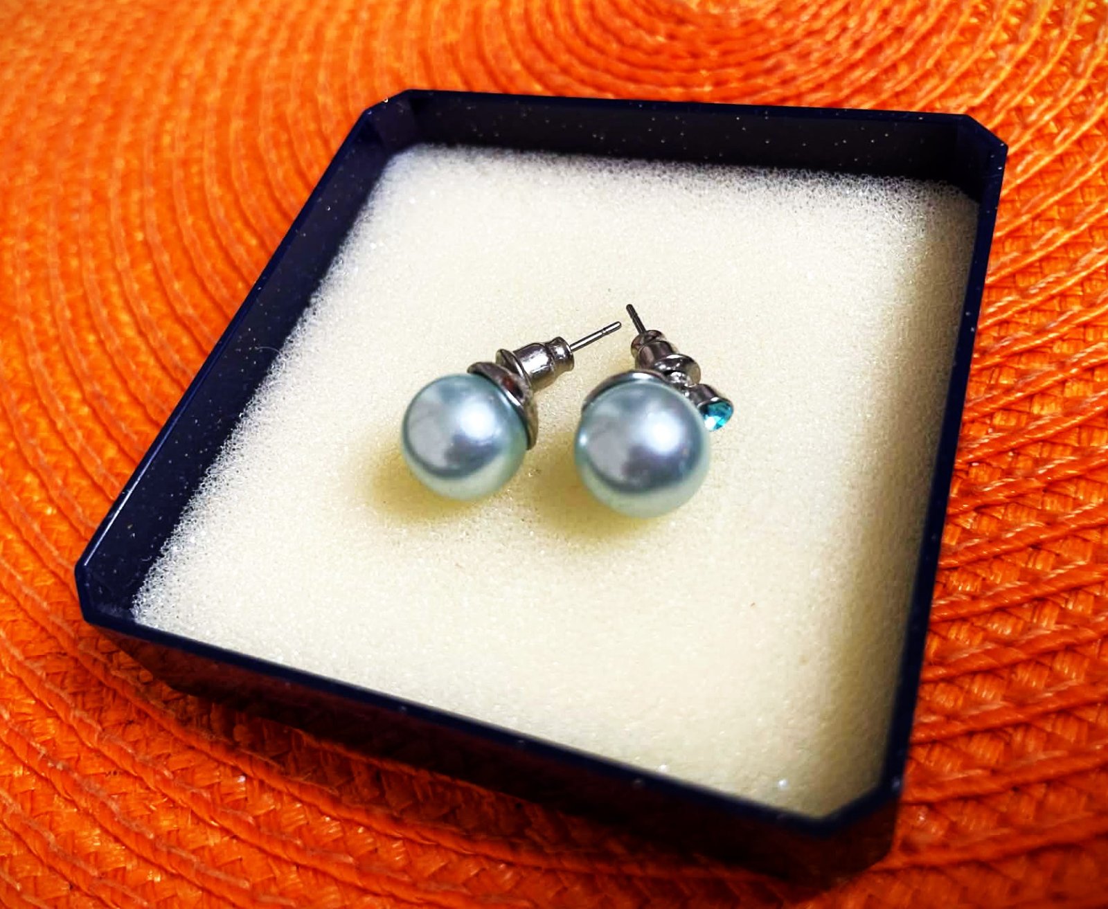 napichovacie náušnice so syntetickou perlou a malým modrým zirkónom,veľmi elegantné, farba je ako na fotke, taká bledomodrá jemne do odtieňa mätovej,nie je to striebro,ale kvalitná bižutéria