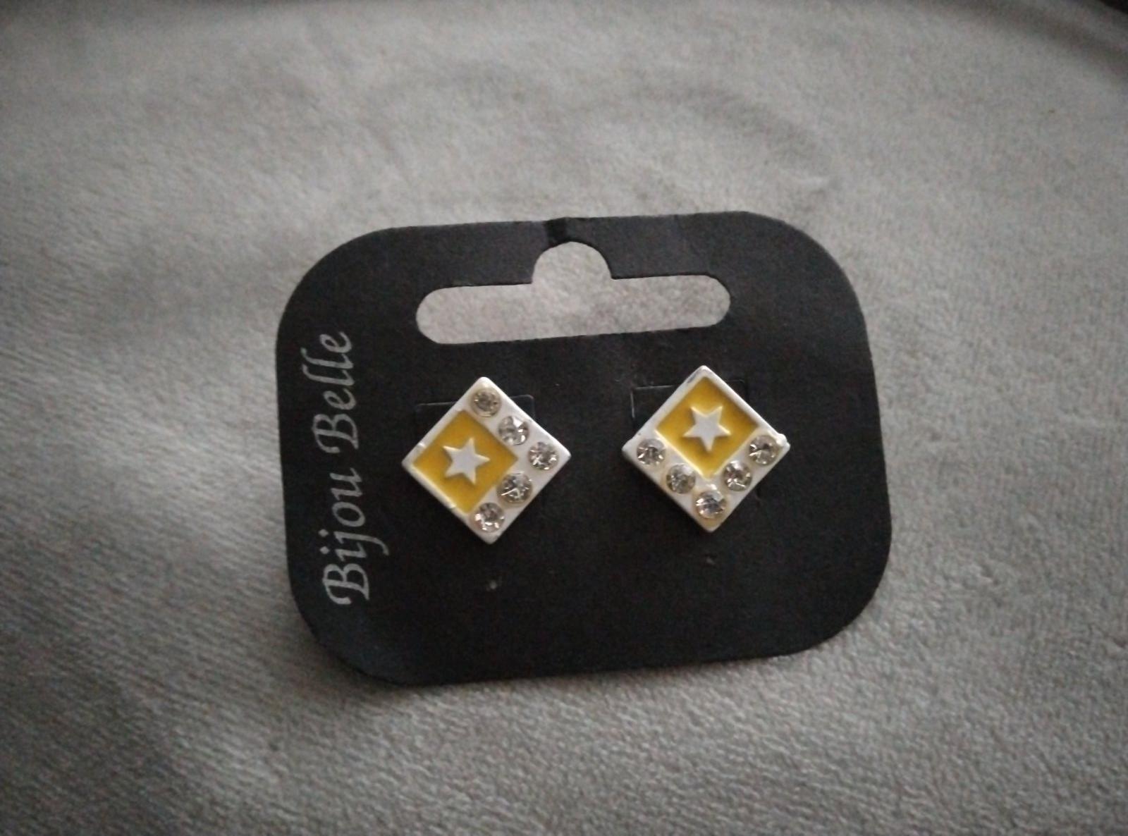 Krásne náušničky v žlto modrej kombinácii so zaujímavým kabošonom. Pozlátené zapínanie.
