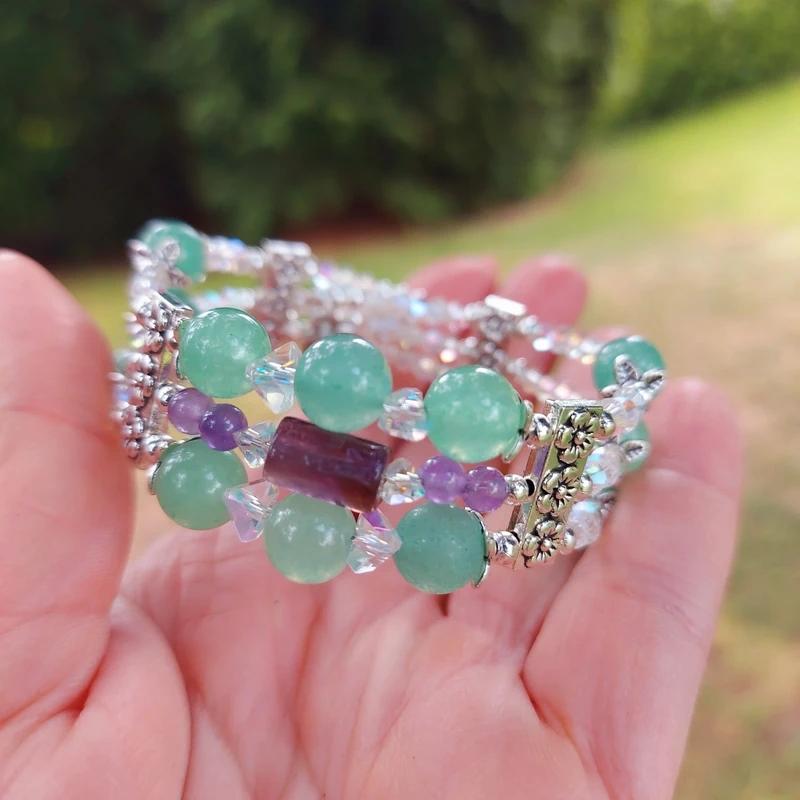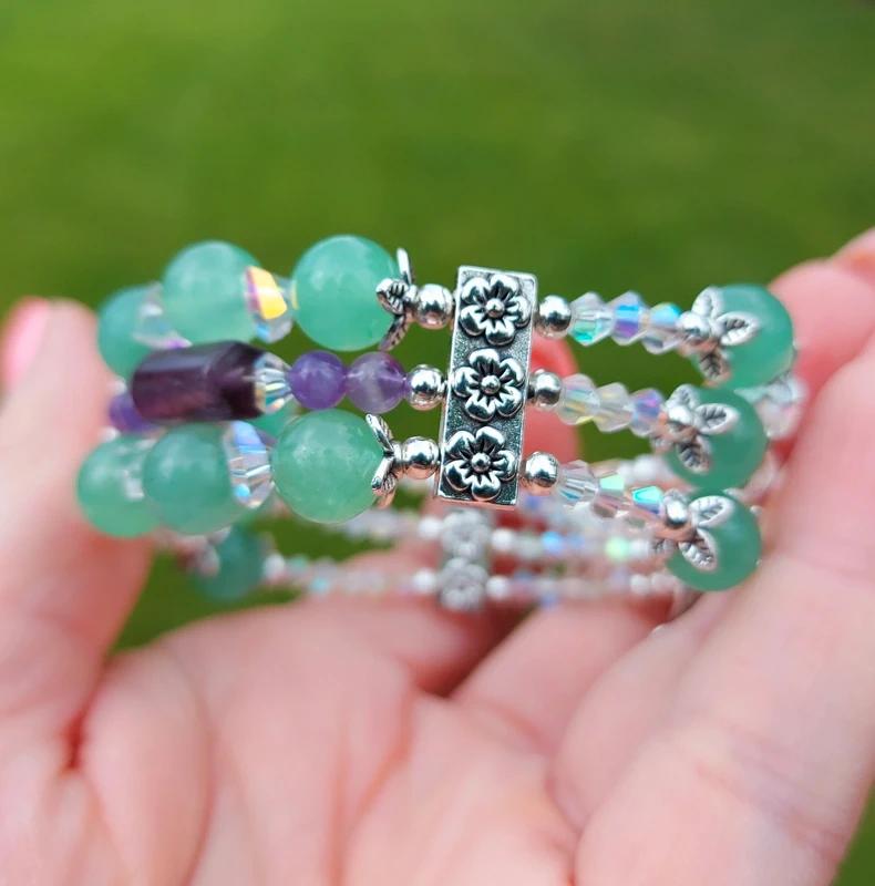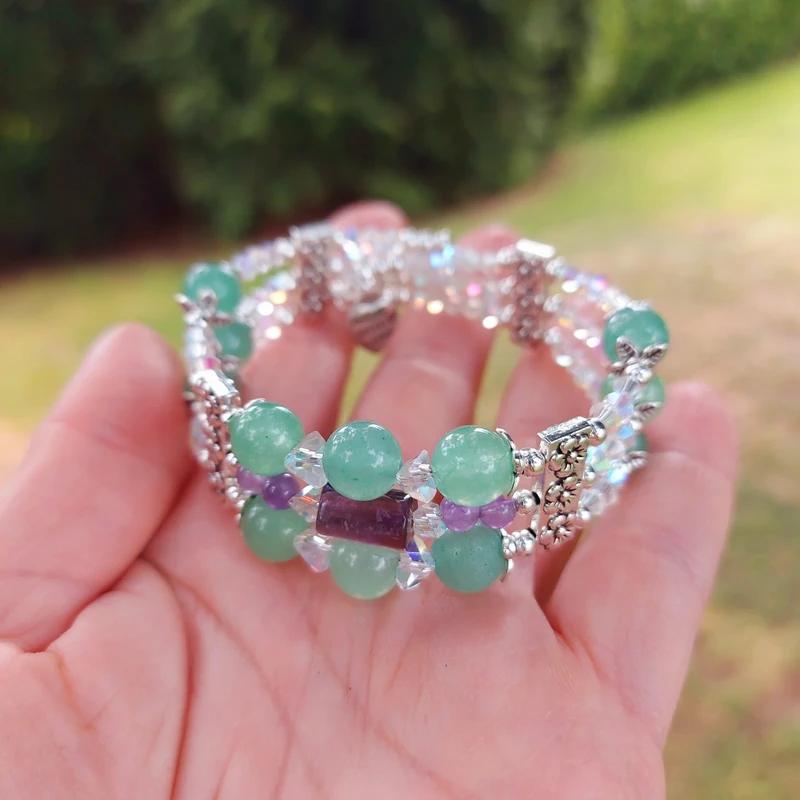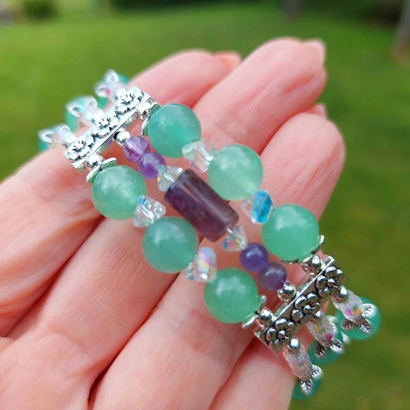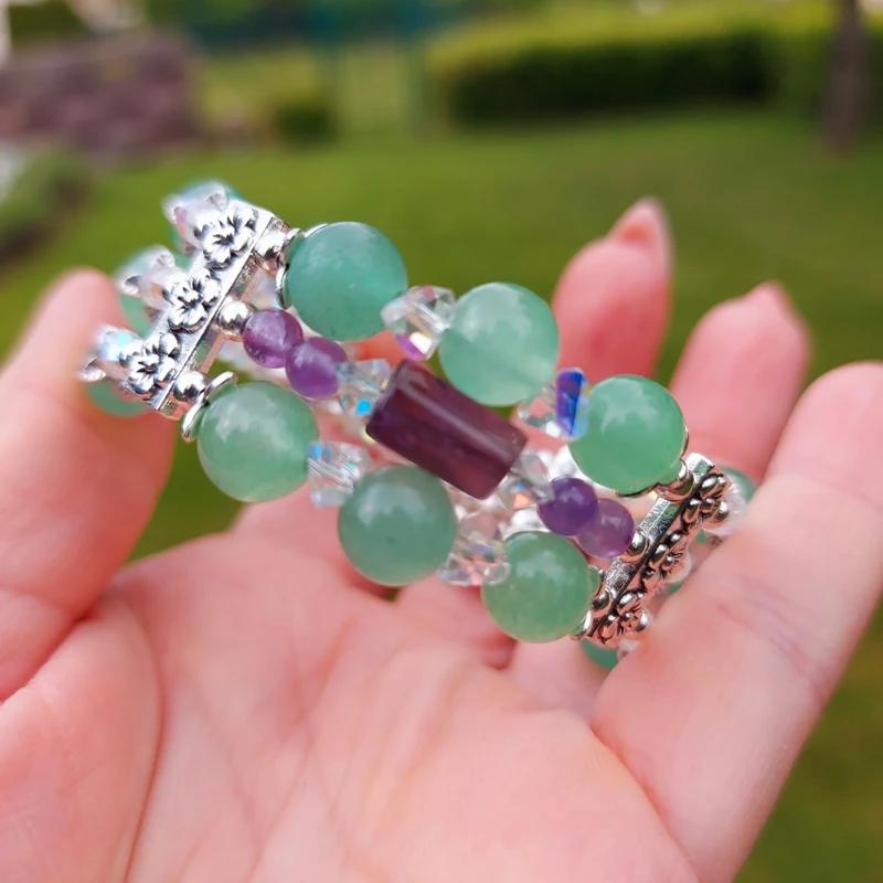 Spojila som zelený avanturín 💚 (kameň šťastia), 💜 fialový ametyst (na pokoj a vnútornú silu) a rakúske sklenené krištály, ktoré tomu všetkému dodávajú ten správny lesk a šmrnc. 💎