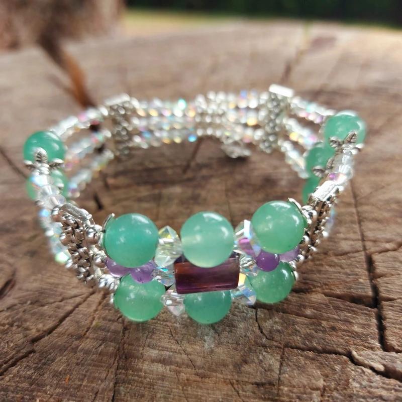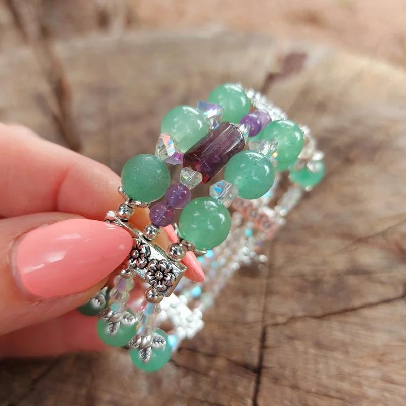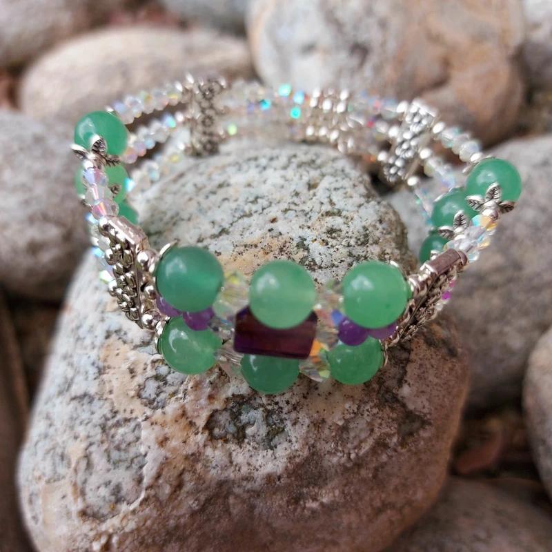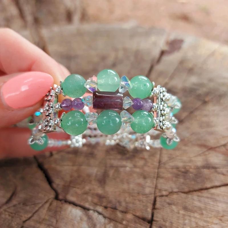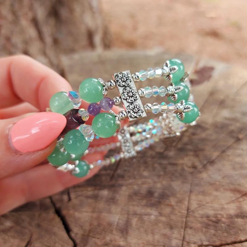 Spojila som zelený avanturín 💚 (kameň šťastia), 💜 fialový ametyst (na pokoj a vnútornú silu) a rakúske sklenené krištály, ktoré tomu všetkému dodávajú ten správny lesk a šmrnc. 💎