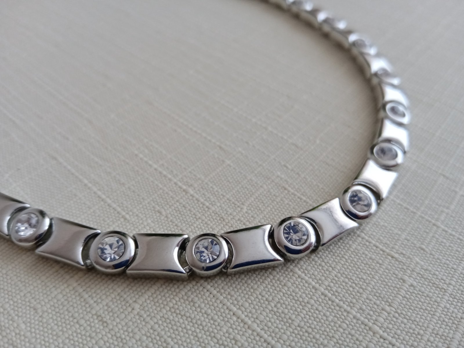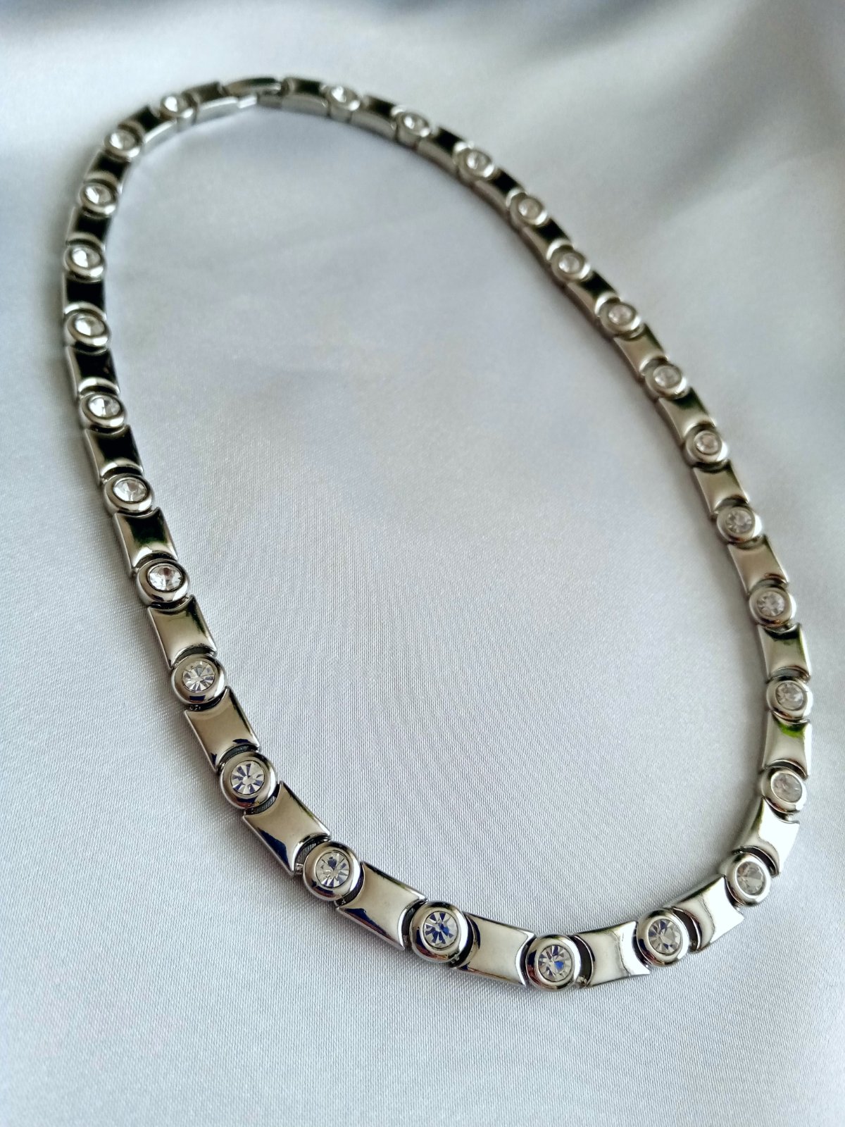 Jednoduchý ale výrazný strieborný náhrdelník z chirurgickej ocele vykladaný trblietavými kamienkami. Použitý len raz na jednu príležitosť.