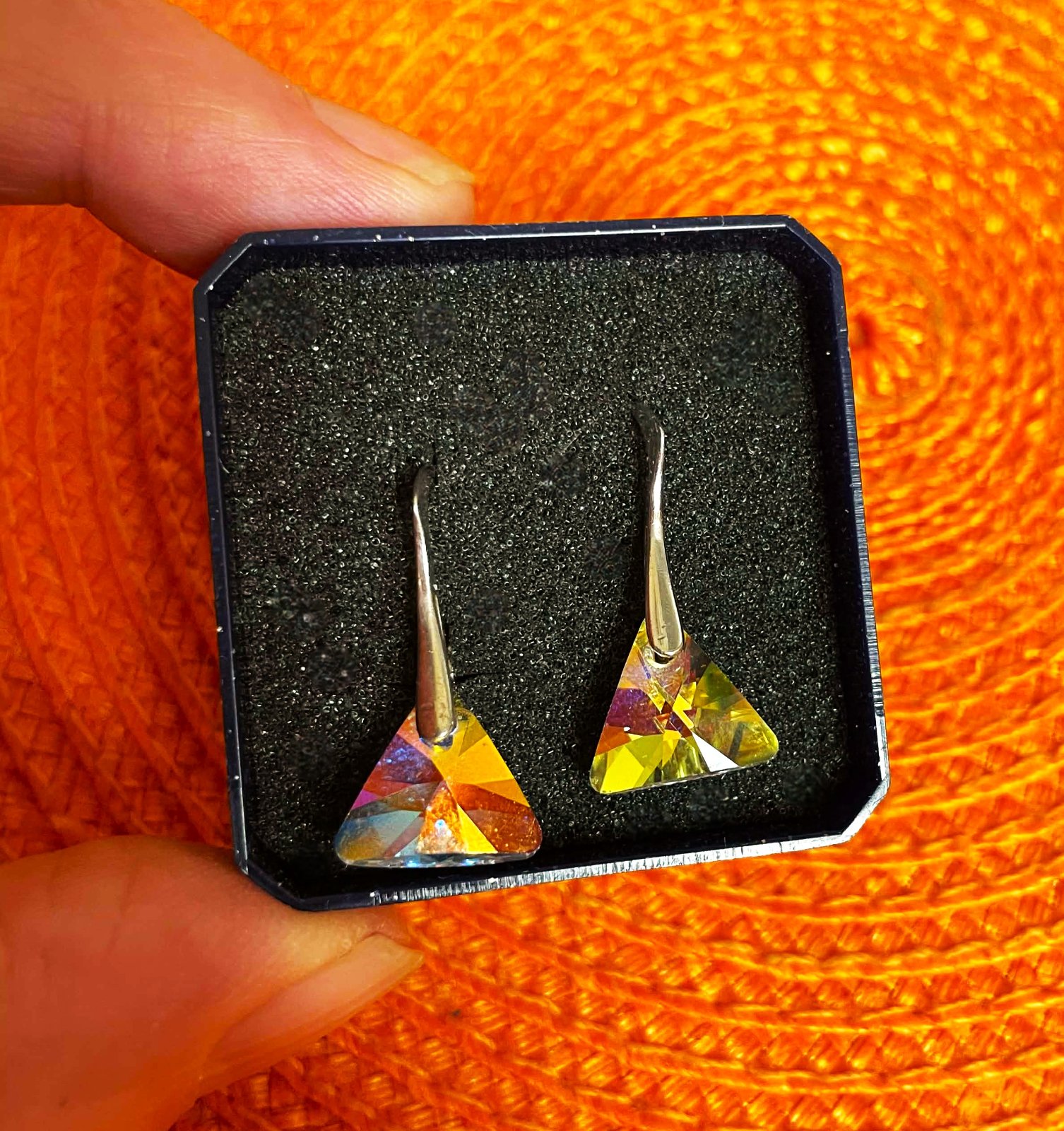 úžasné náušnice,značkové,krásne brúsené kryštály hrajú všetkými farbami - ako zrkadlovky,výborné bezpečné zapínanie,top stav