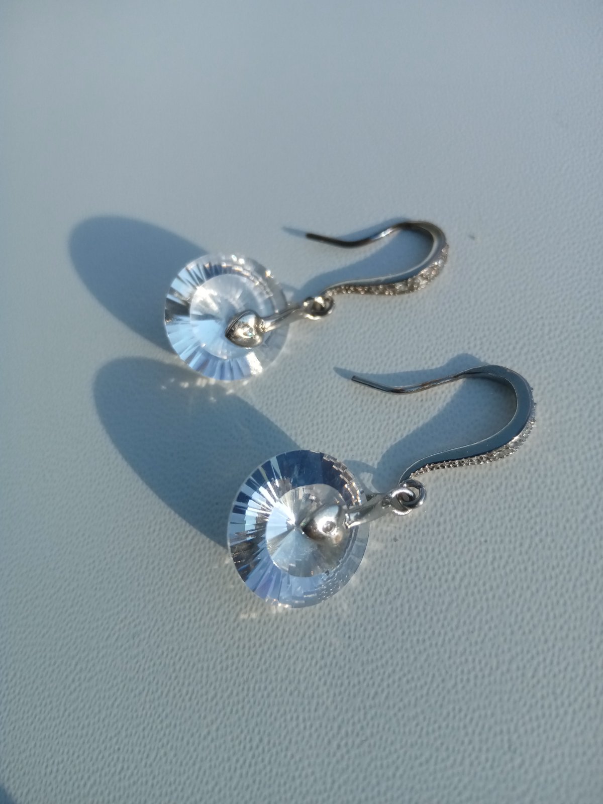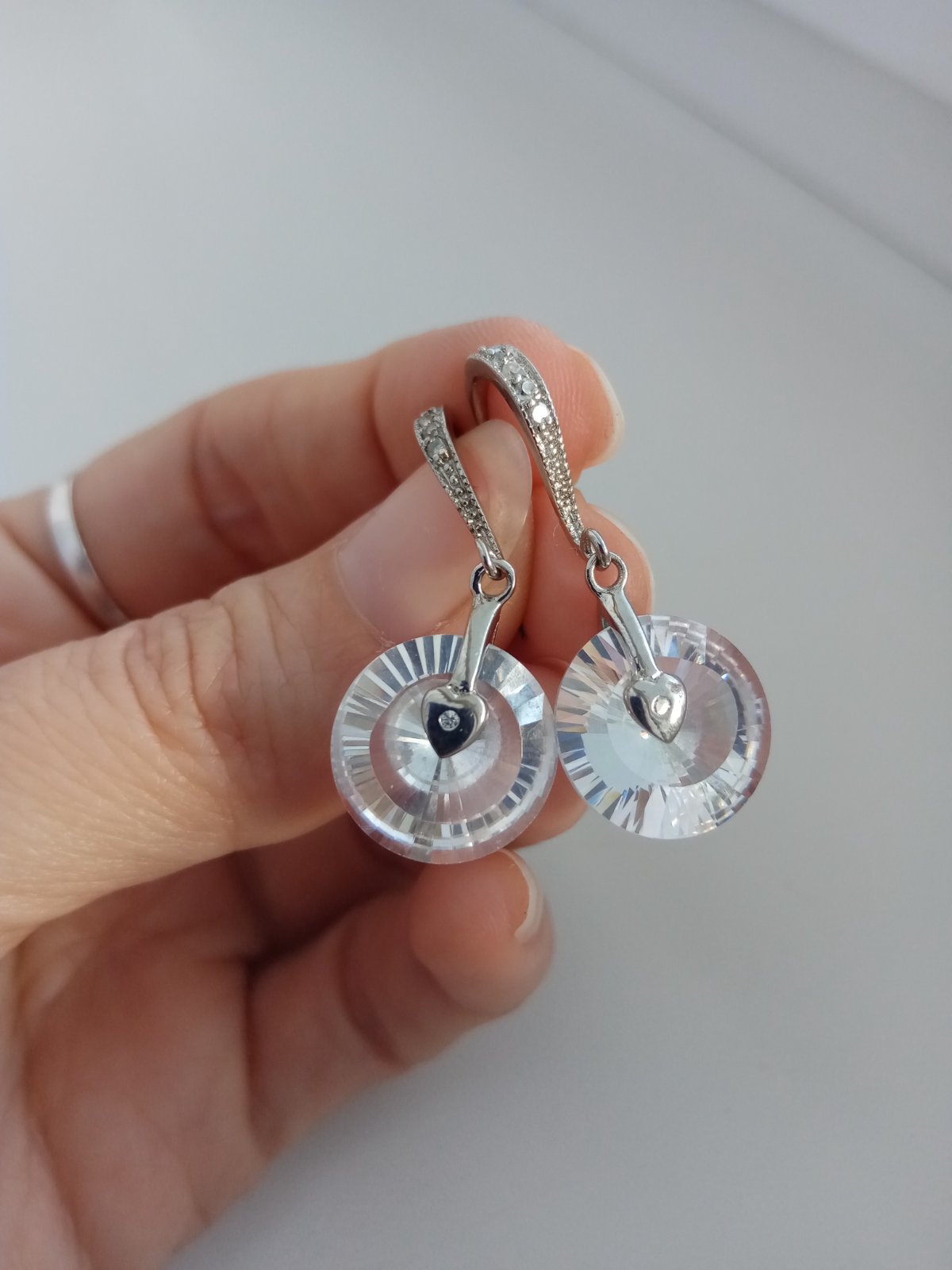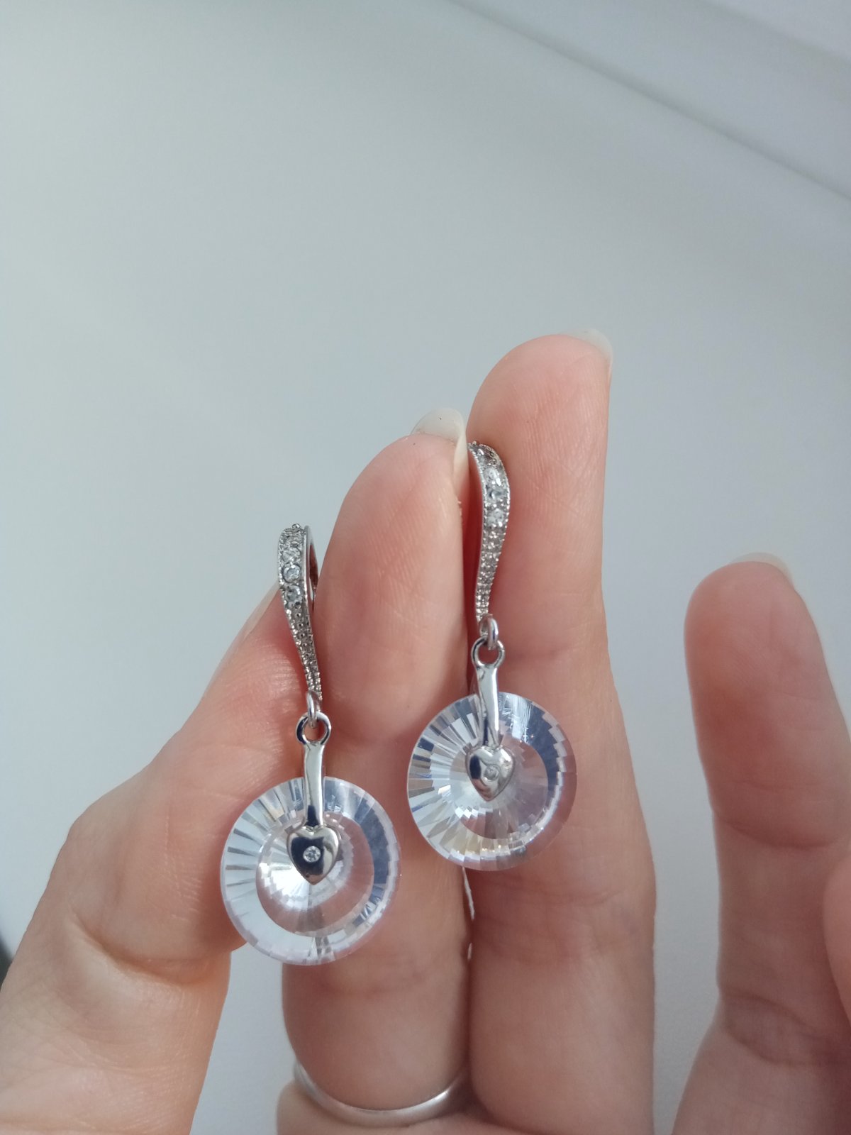 Náušnice s drobnými srdiečkami. Kamene sa na slnku úžasne trbliecu. Predná časť háčika je taktiež vykladaná trblietavými kamienkami.