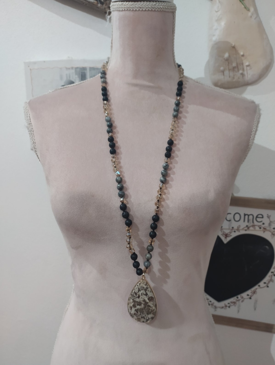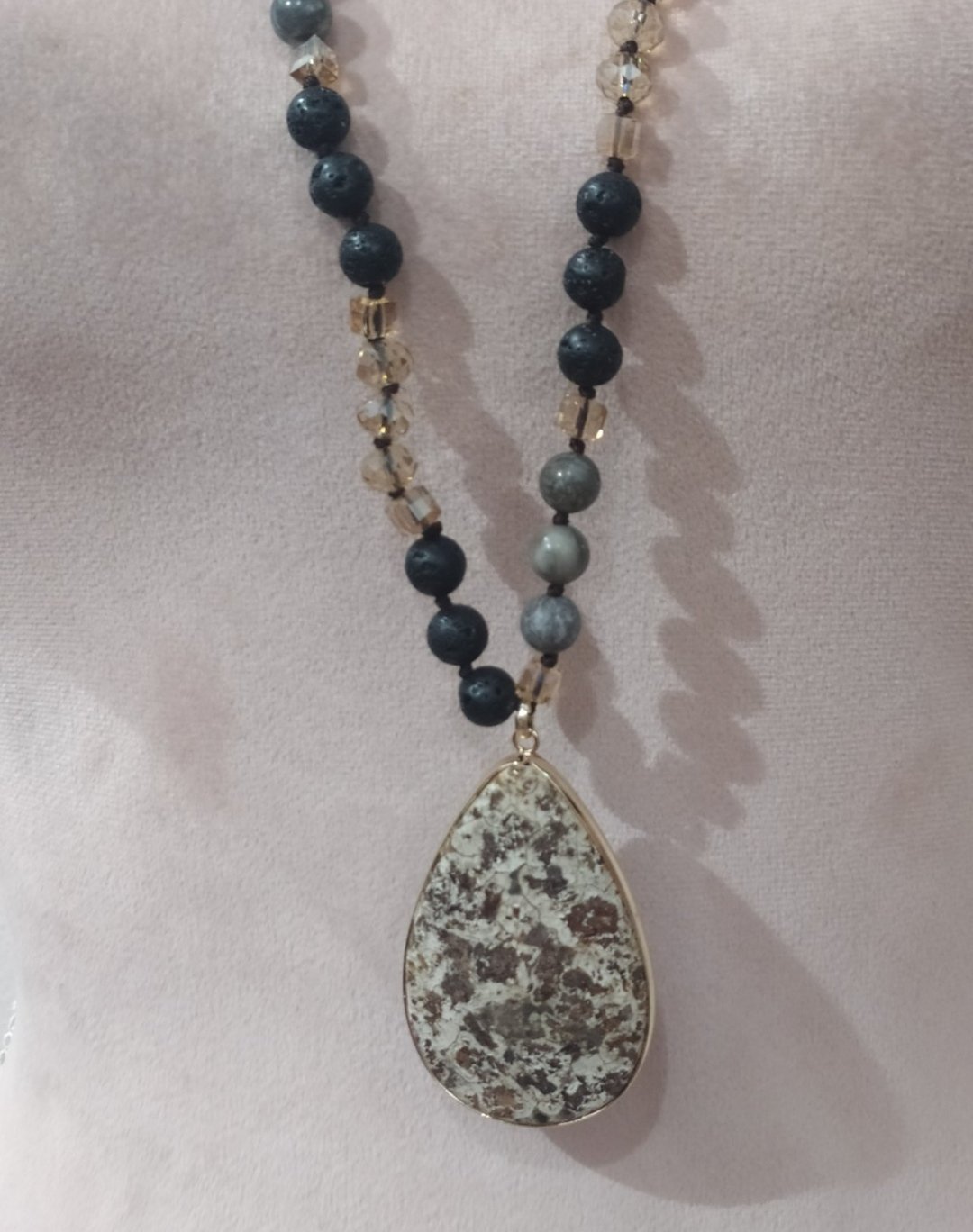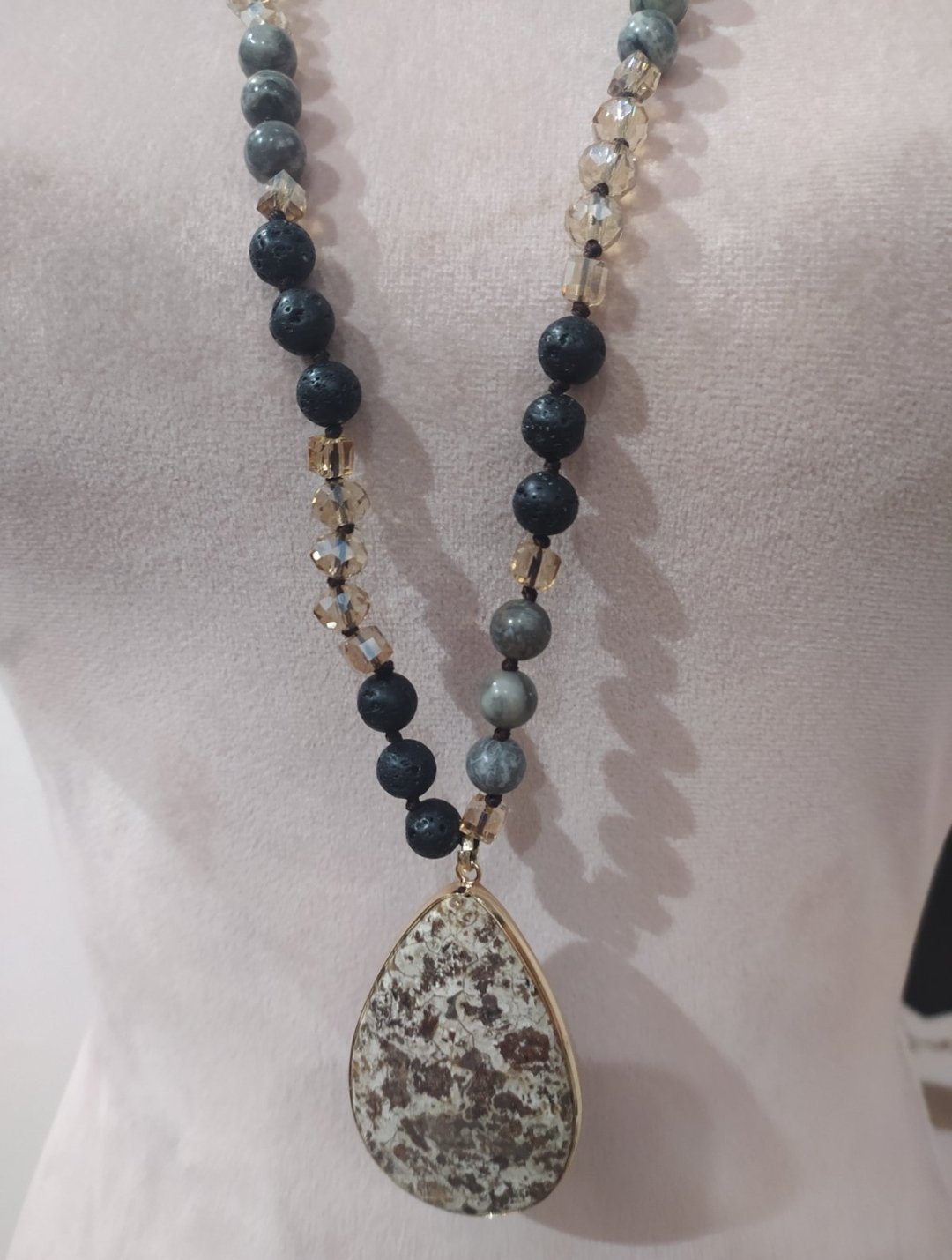 Dlhý visiaci náhrdelník,v nádherných farebných kombináciách sivej a zlatej.
