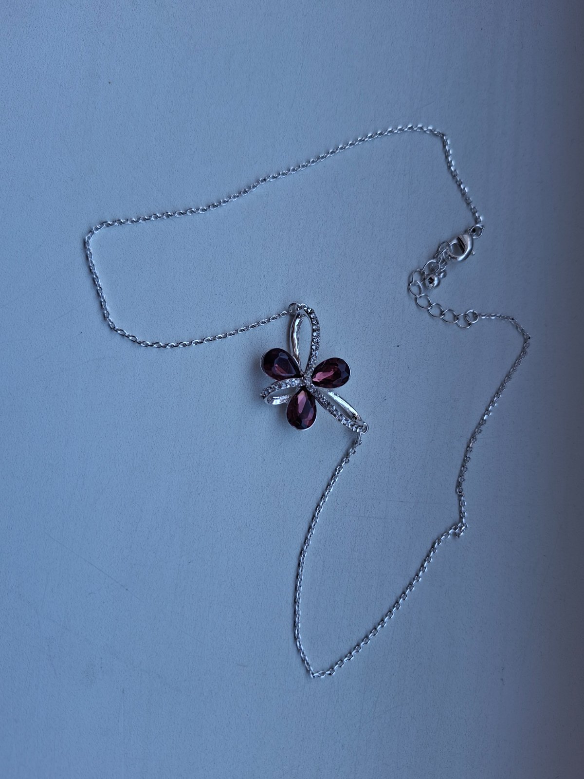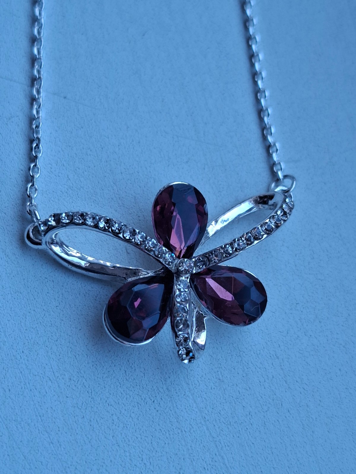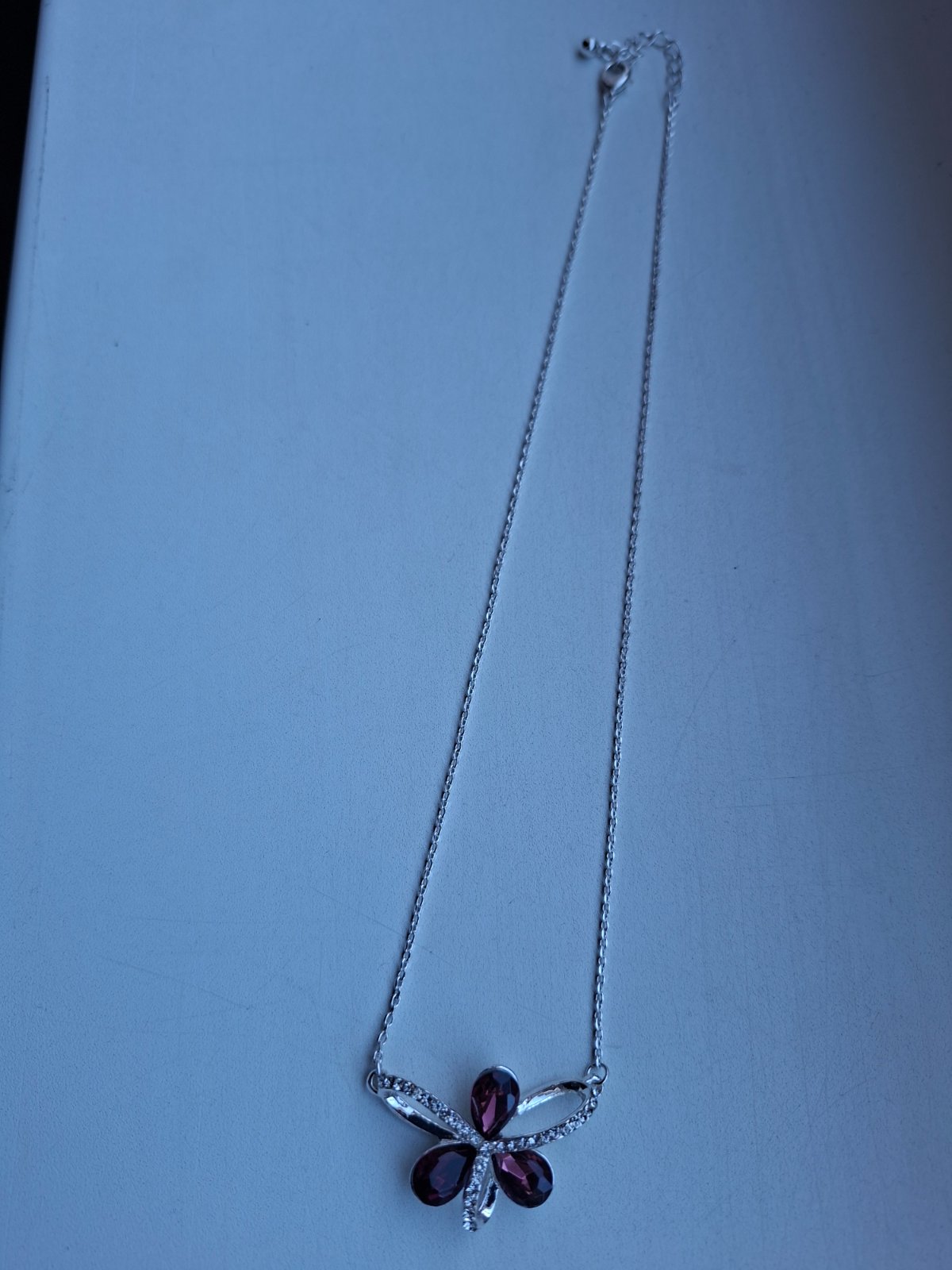 Predám krásny jemný náhrdelník v striebornej farbe zdobený tmavofialovými brúsenými kameňmi a drobnými čírymi kryštálikmi. Motív pripomína kvet alebo motýľa. Dĺžka retiazky je nastaviteľná vďaka predlžovacej časti. Top stav, vhodné aj ako darček alebo doplnok na spoločenskú udalosť. Dĺžka je 43 az. 48cm. Bižutéria.