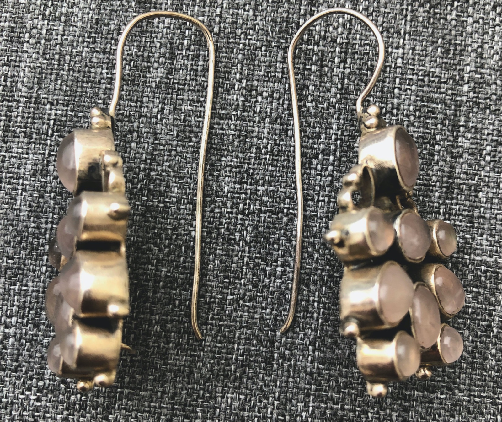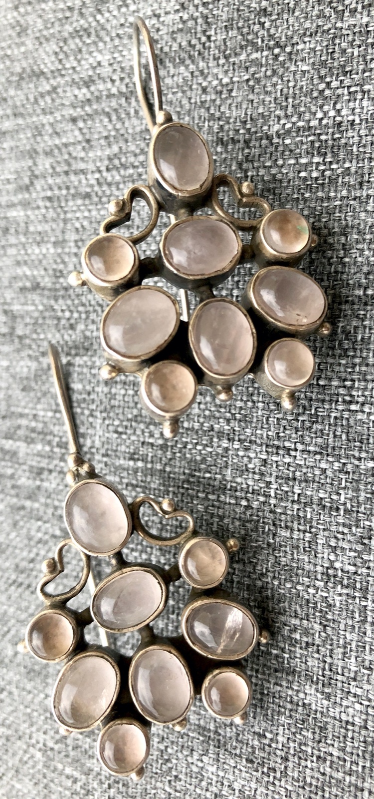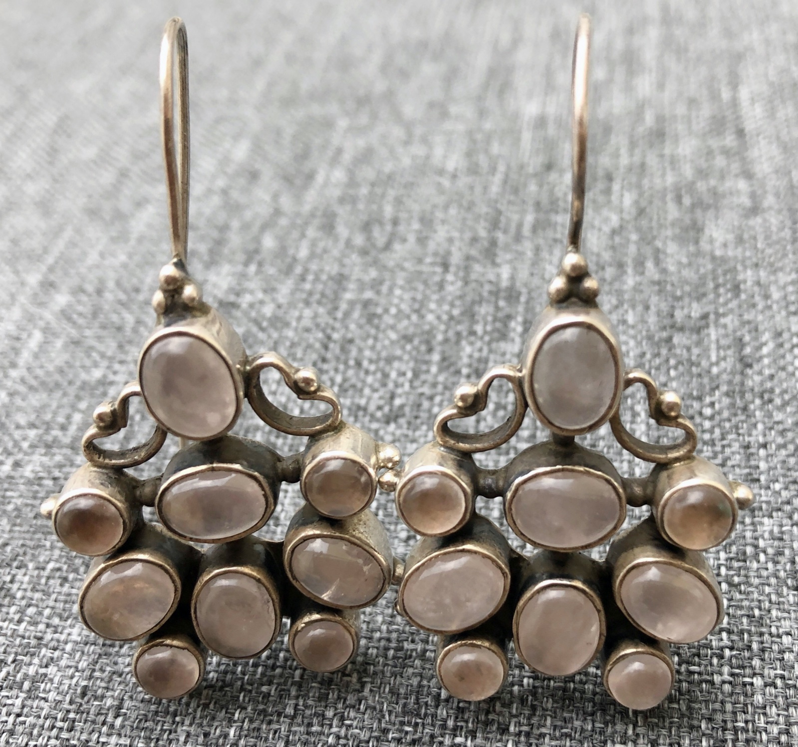 Strieborné náušnice s jemným pudrovo-ružovým kameňom Rose Quartz, pôsobia veľmi romanticky, žensky. Celková visiaca dĺžka 5 cm, šírka max 2,8 cm. Bez poškodení. Zakúpené v dizajnérskom obchode v NYC, PC 290 USD.