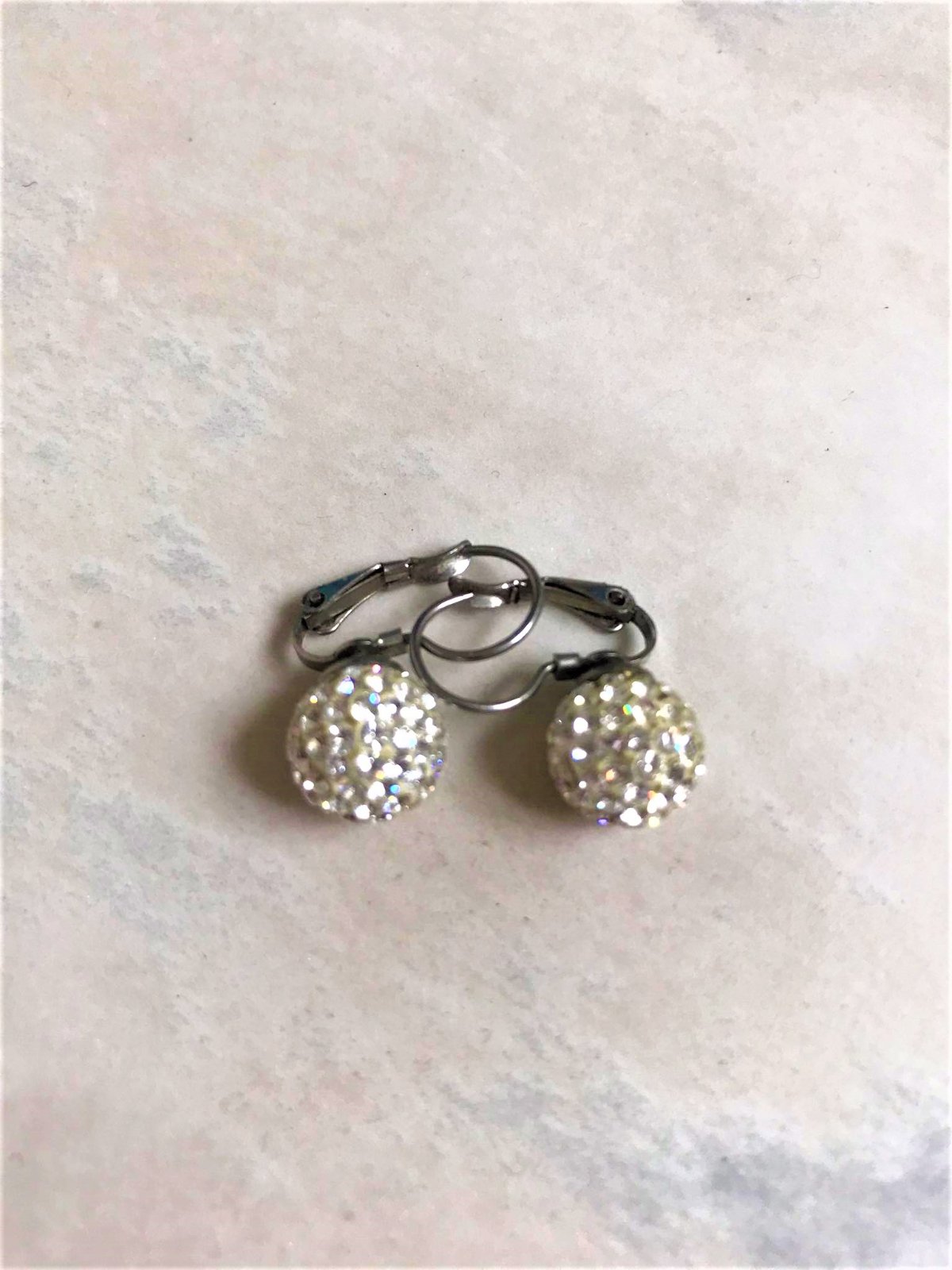 Štrasové zapínacie náušnice - guličky,krásne trblietavé,vo svetle lámu svetlo,nie je to striebro,je to kvalitná bižutéria,priemer guličky cca 0,9 cm,raz použité na svadbe