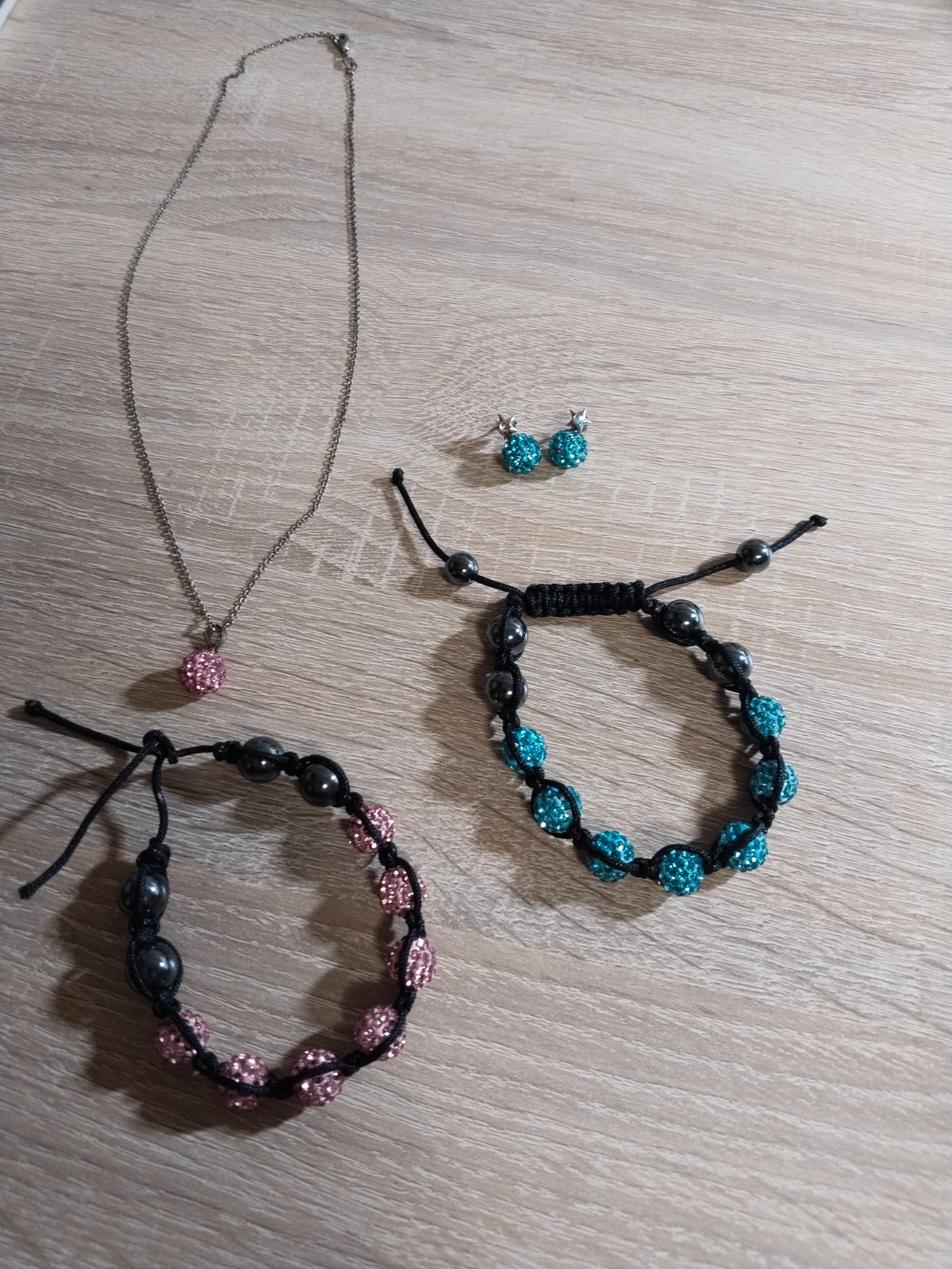 sada doplnkov: 2 náramky, náhrdelník a náušnice.