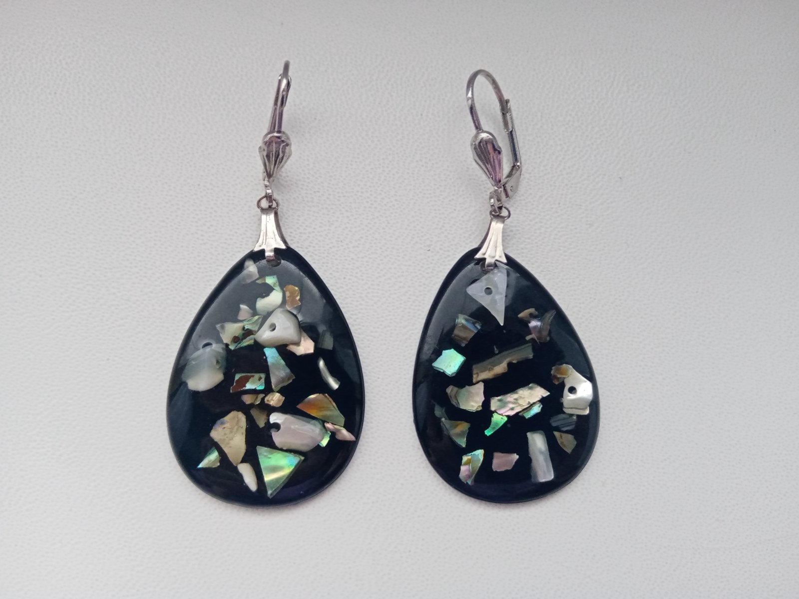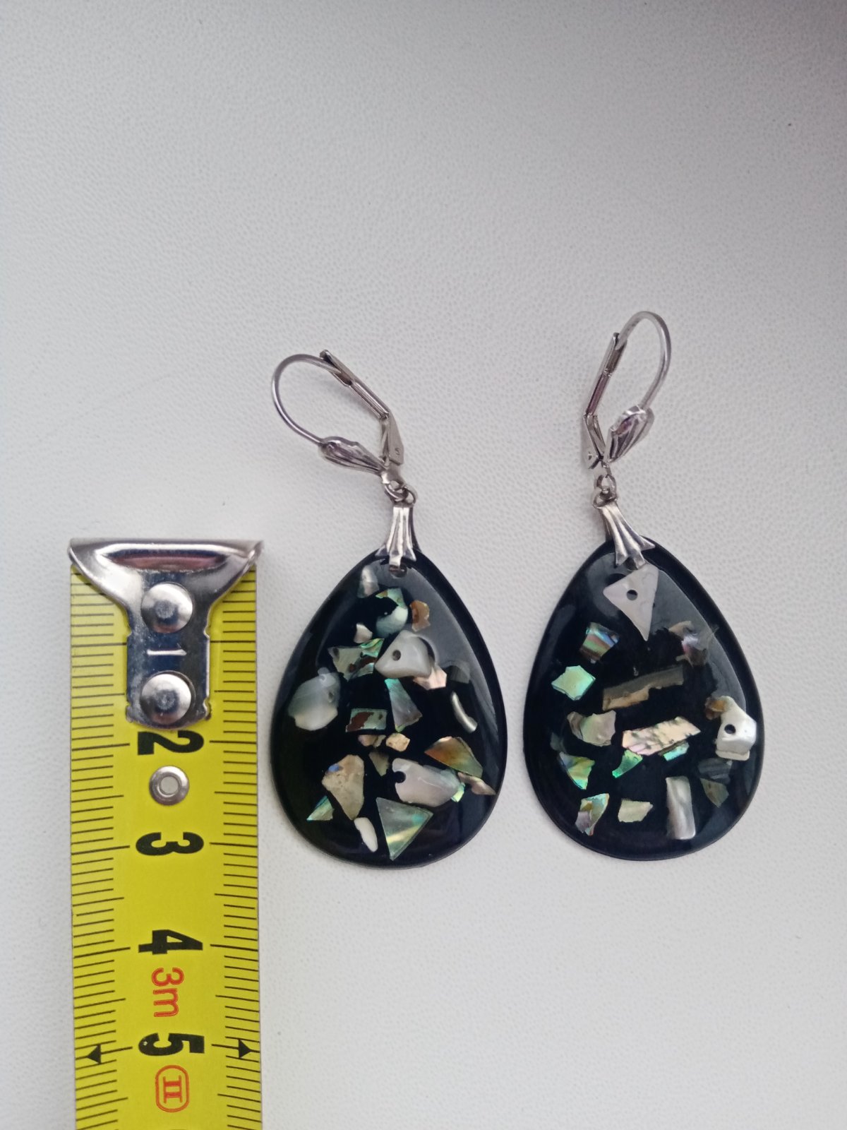 Čierne náušnice s kúskami mušlovej perlete. Dĺžka 3 cm.