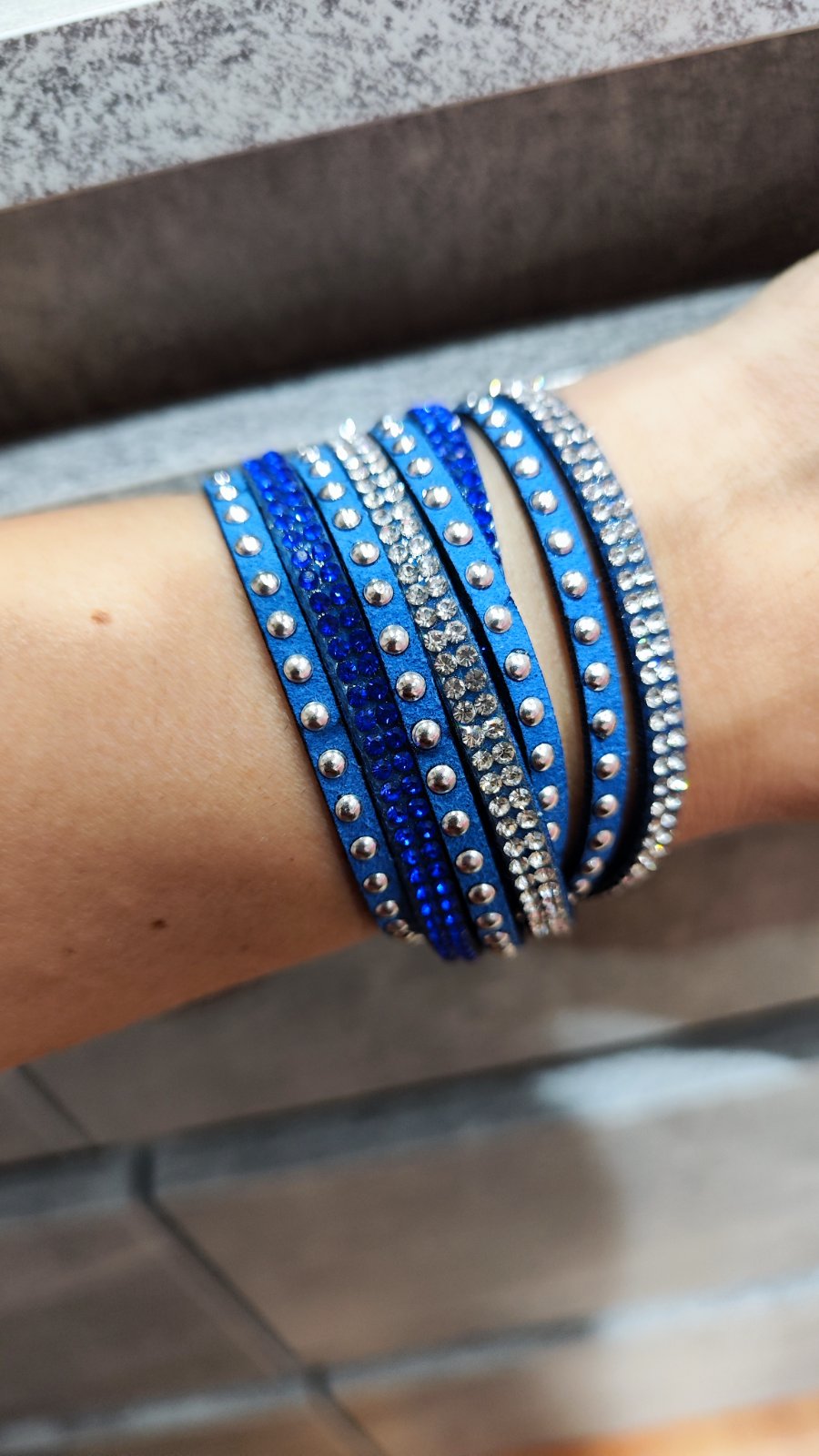 Modrý náramok s kamienkami, veľkosť si viete nastavovať. Dá sa nosiť aj ako choker / náhrdelník. Cena + poštovné prevodom alebo osobne v Ba. Pozrite si aj moje ďalšie inzeráty..