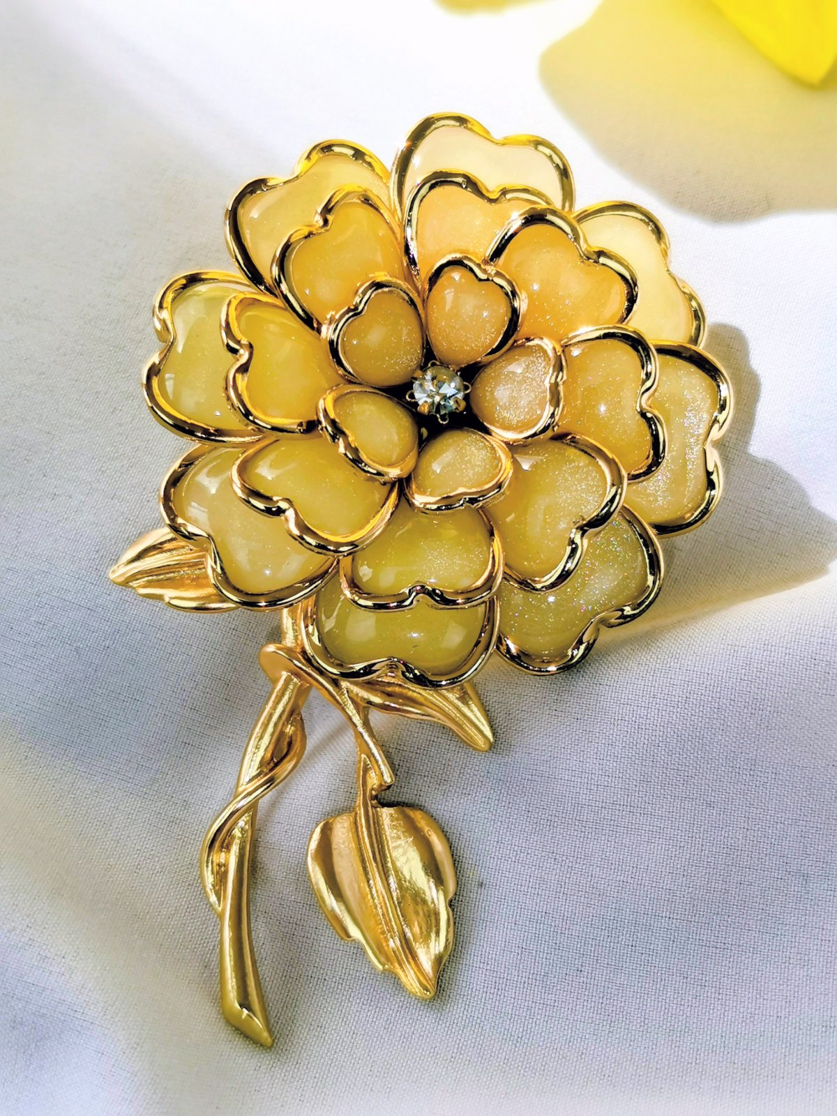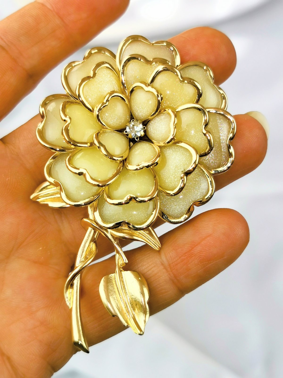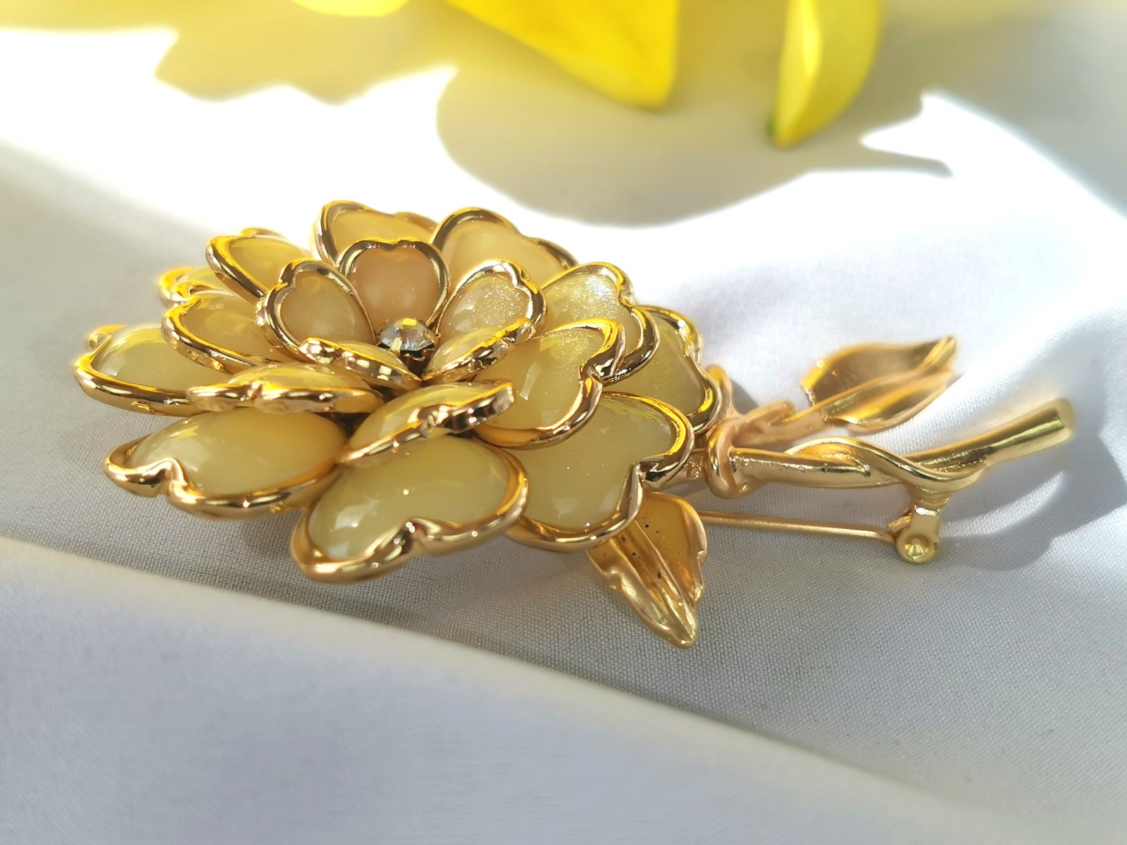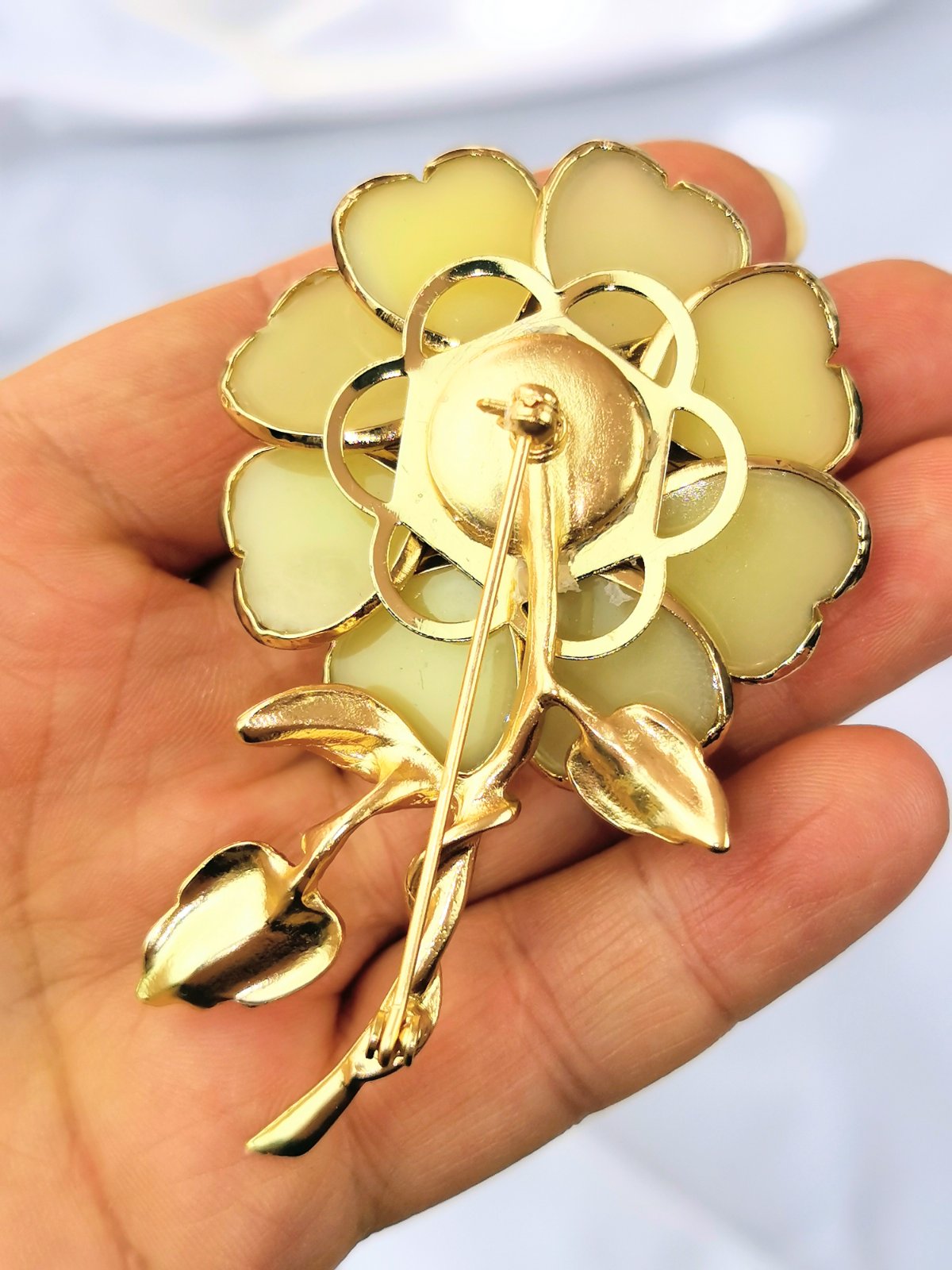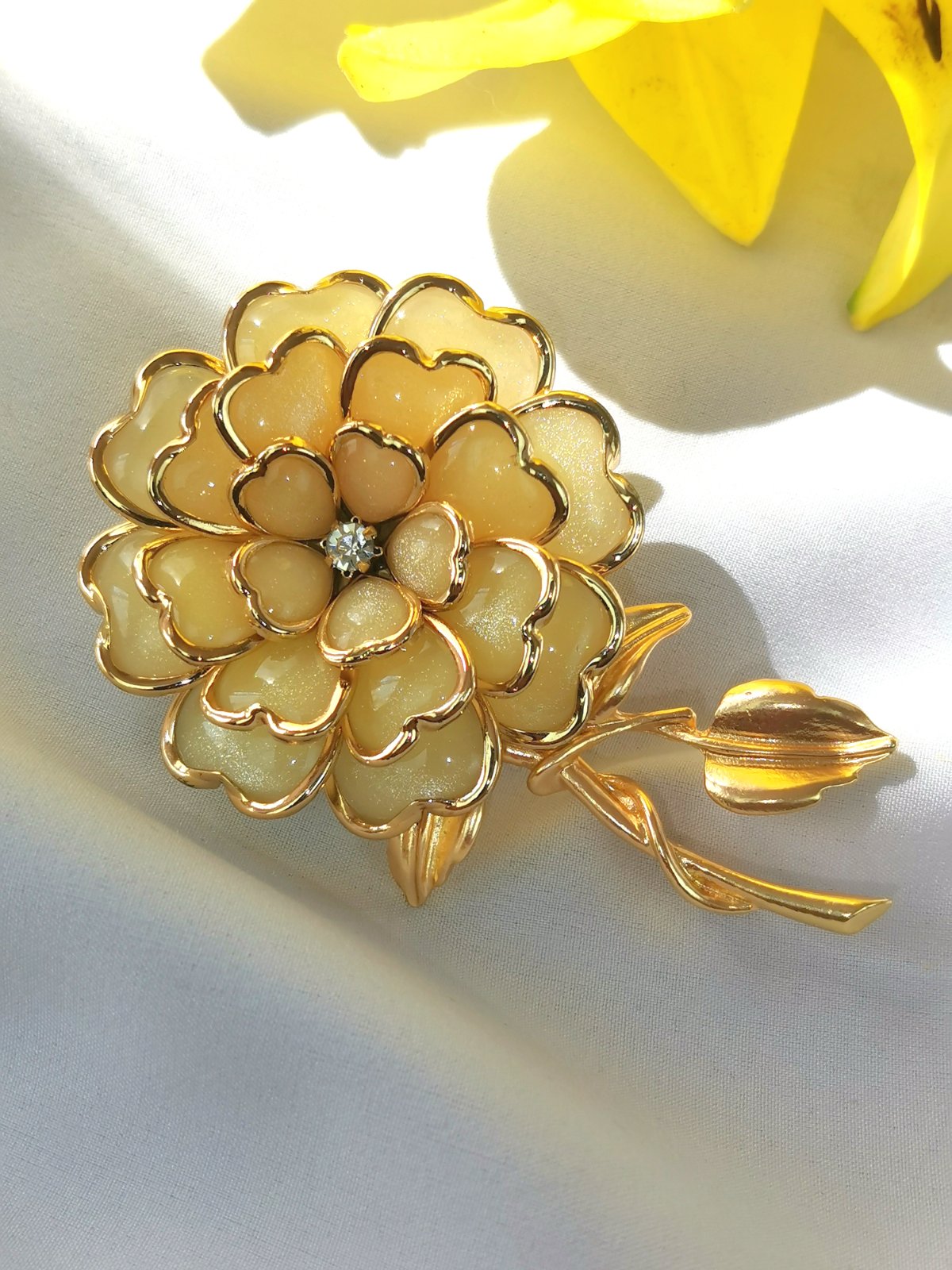 Elegantná zlatá brošňa v tvare kvetu.