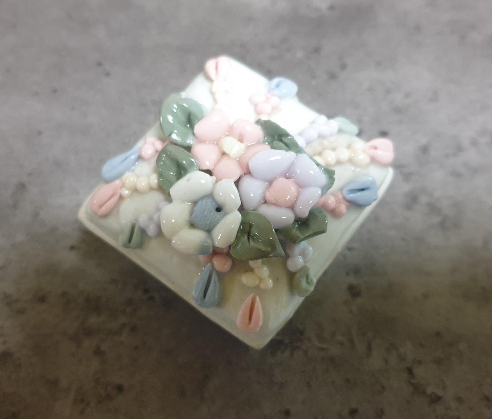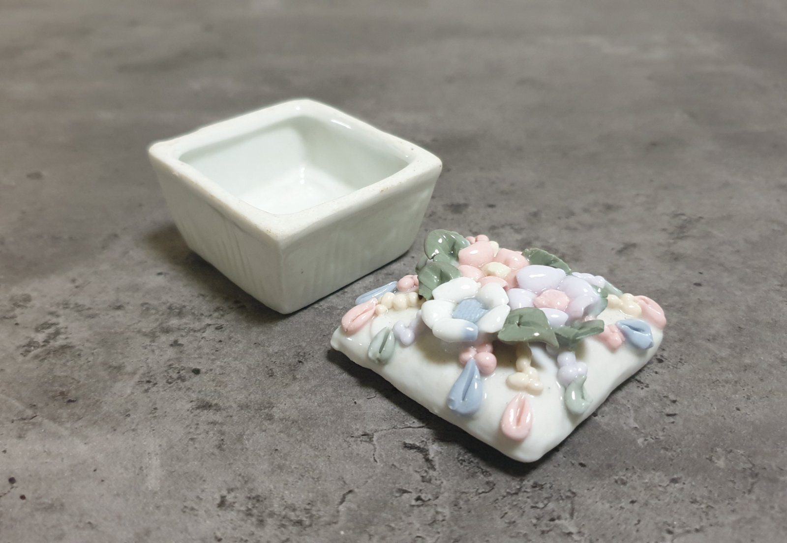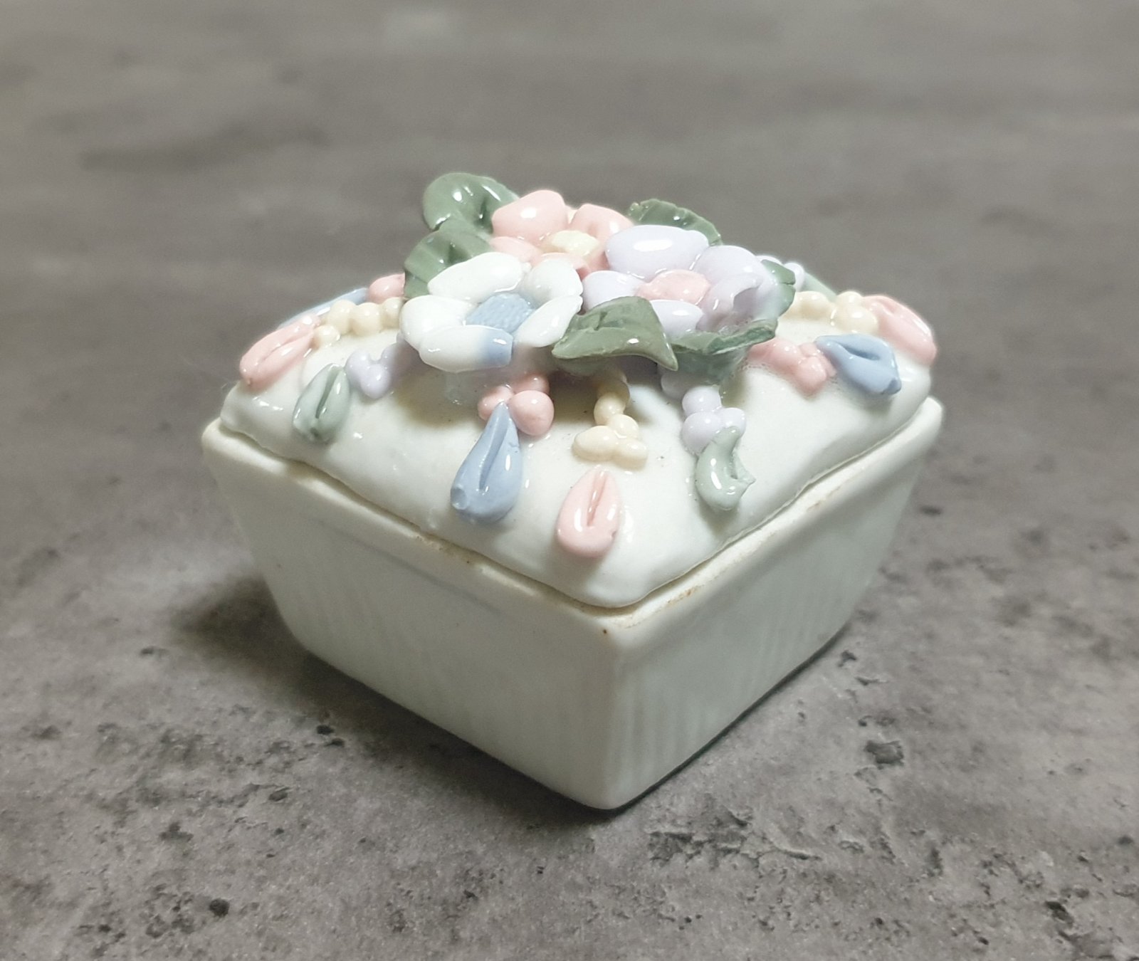 Predám malú porcelánovú šperkovnicu, rozmer 5 cm x 5 cm, cena 1,50 eur plus poštovné.