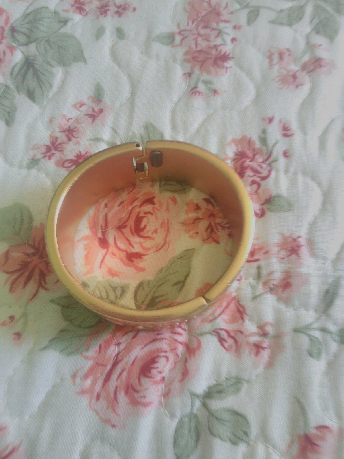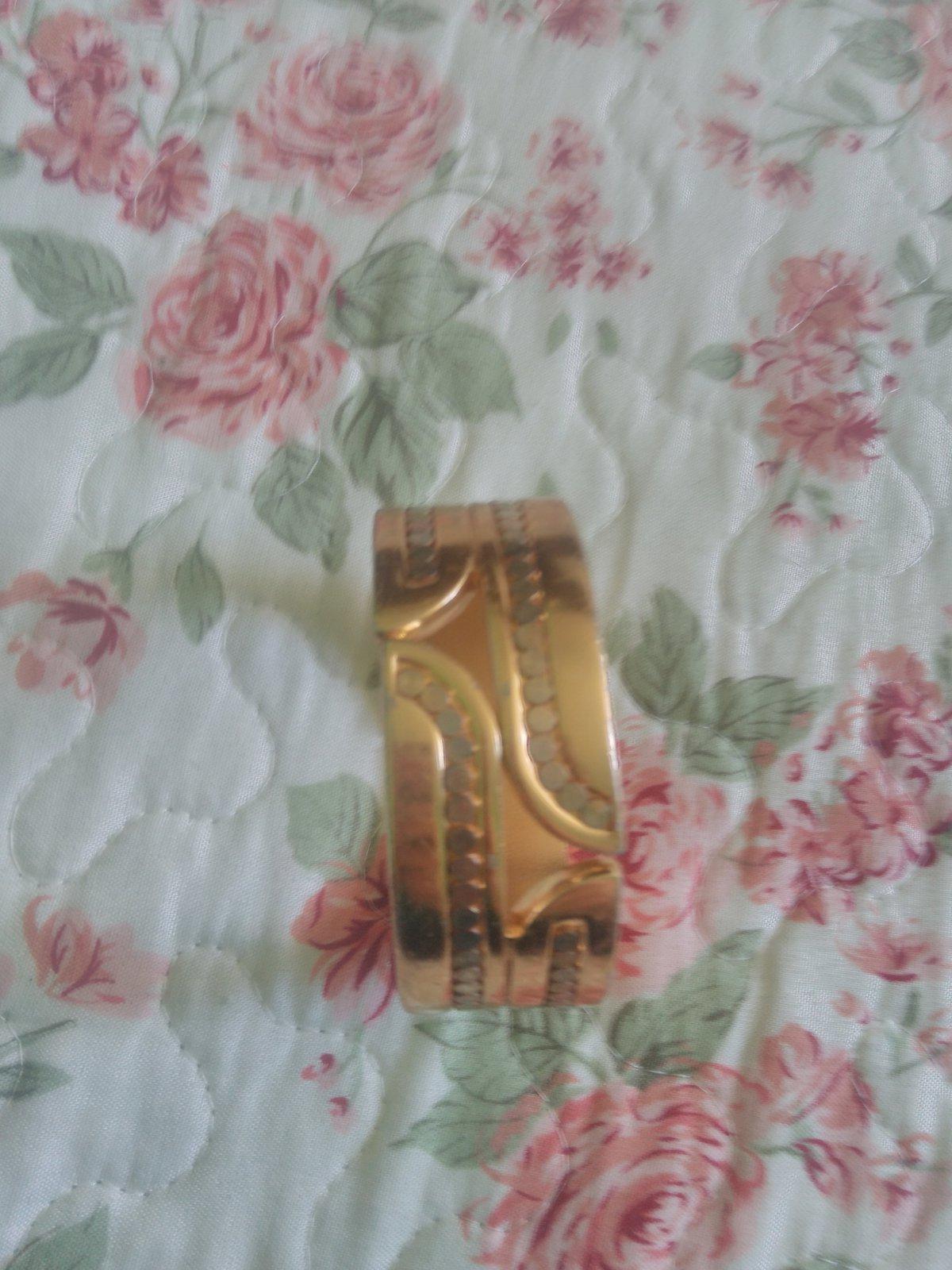 Krásny pevný naramok, nemá zapínanie, nasuva sa na ruku, skôr na užšiu ruku..zlata farba, kamienky nechýbajú,pekný stav, miestami malinko patina
