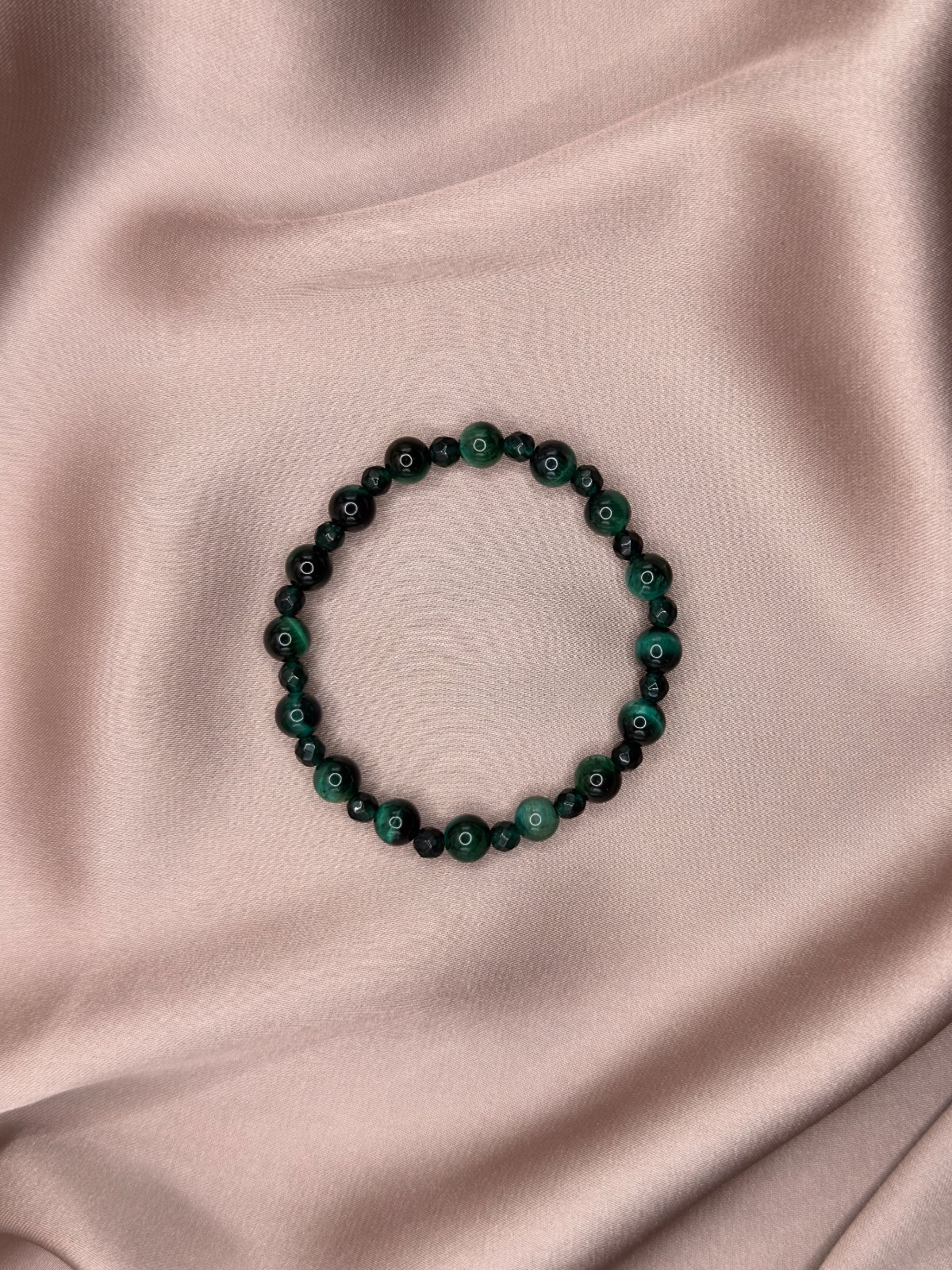 Tento unikátny náramok kombinuje krásu zeleného tigrieho oka a brúseného zeleného onyxu, čo mu dodáva nielen estetickú hodnotu, ale aj silné energetické vlastnosti.