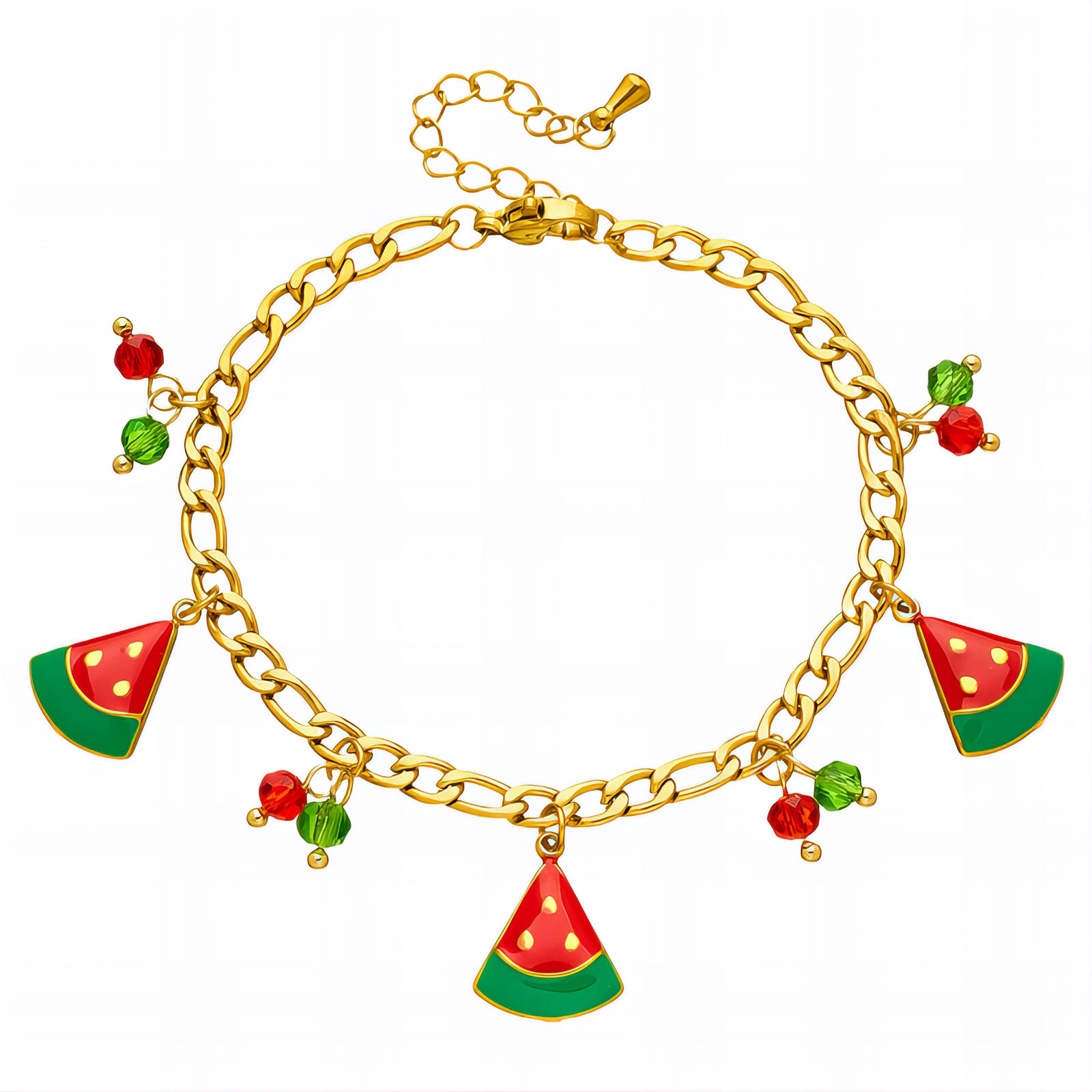Tvoria ho zlaté články retiazky, ktoré zdobia prívesky v tvare plátkov melóna doplnené o červené a zelené korálky. Vďaka nim šperk pôsobí hravo, no zároveň štýlovo a originálne.