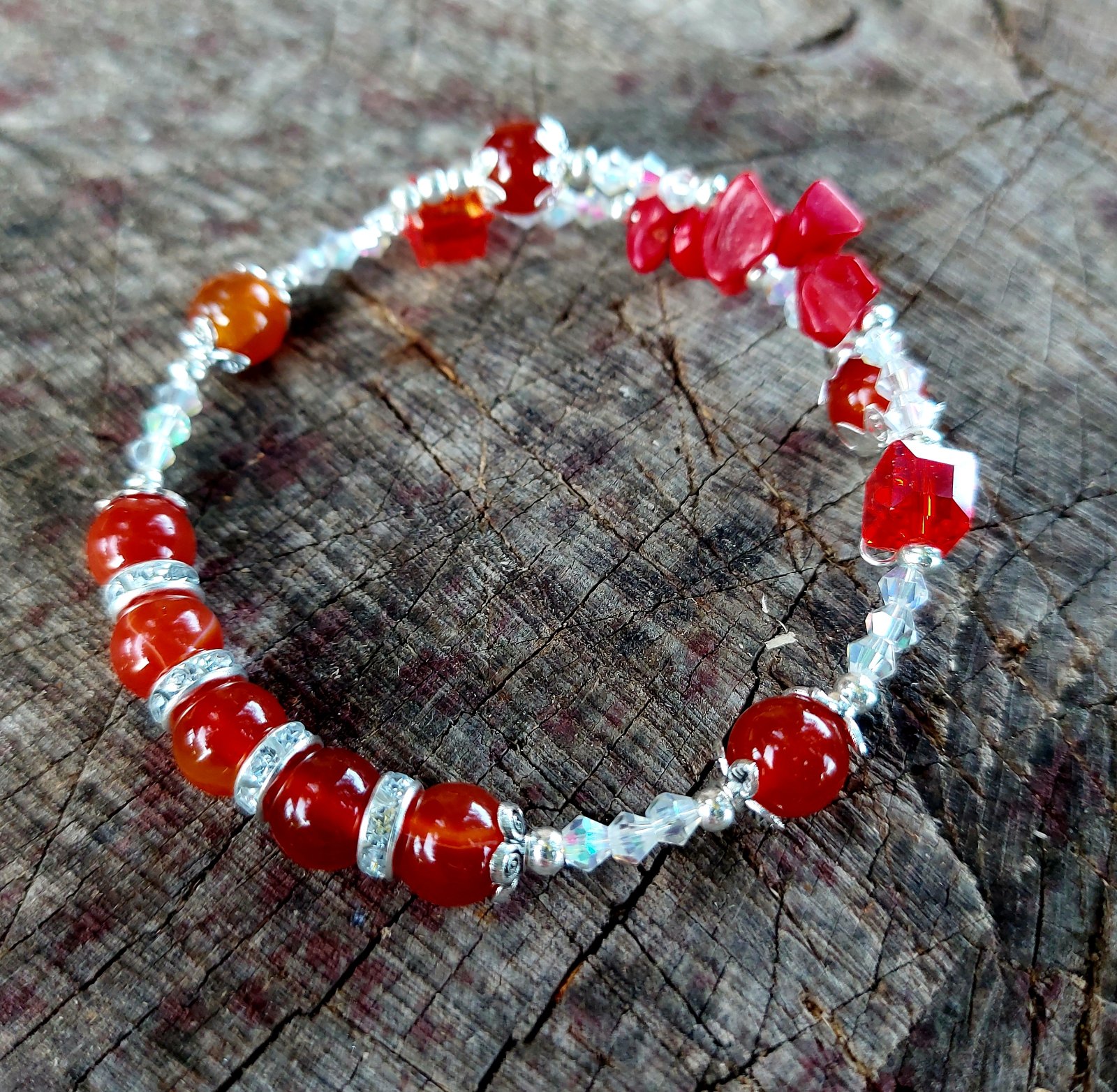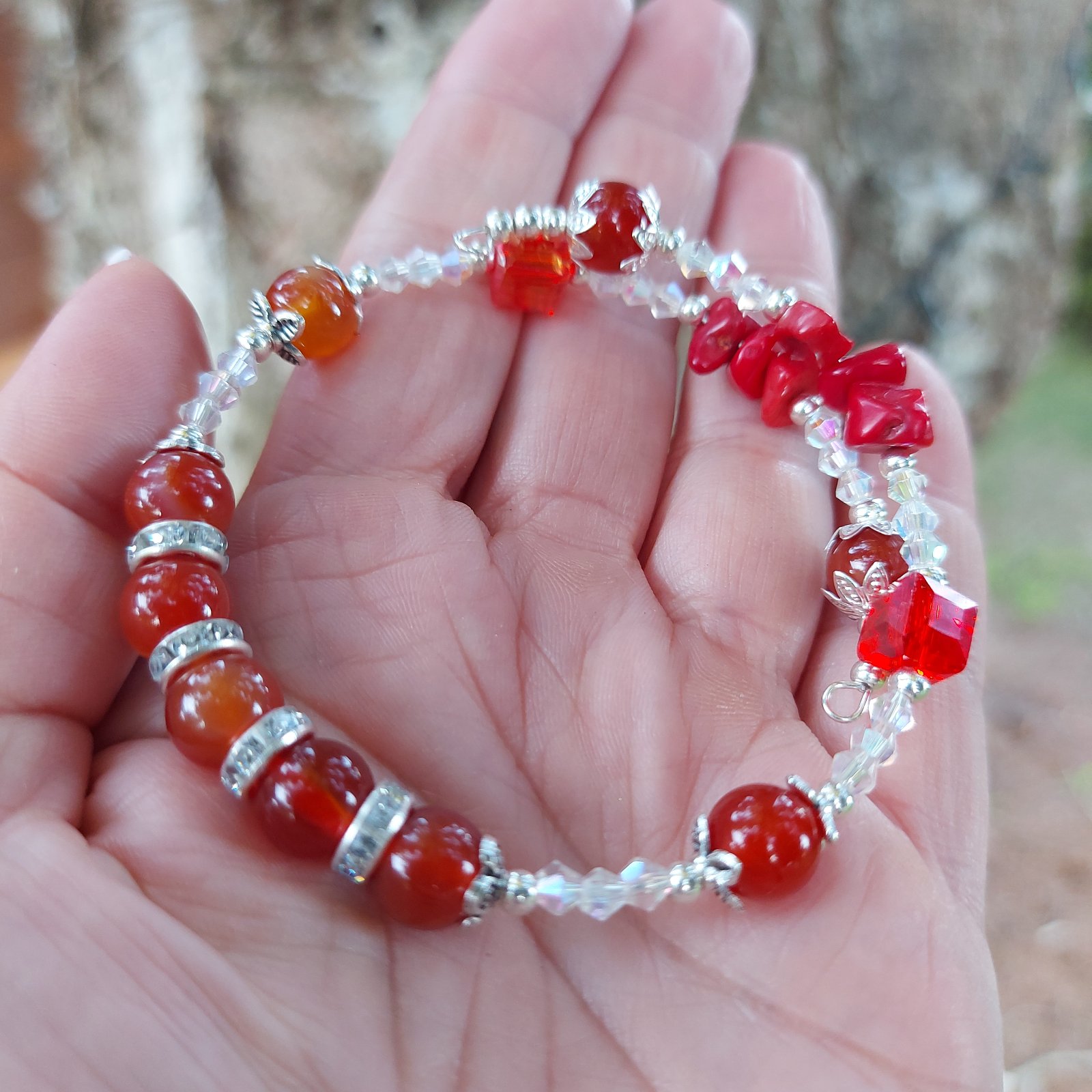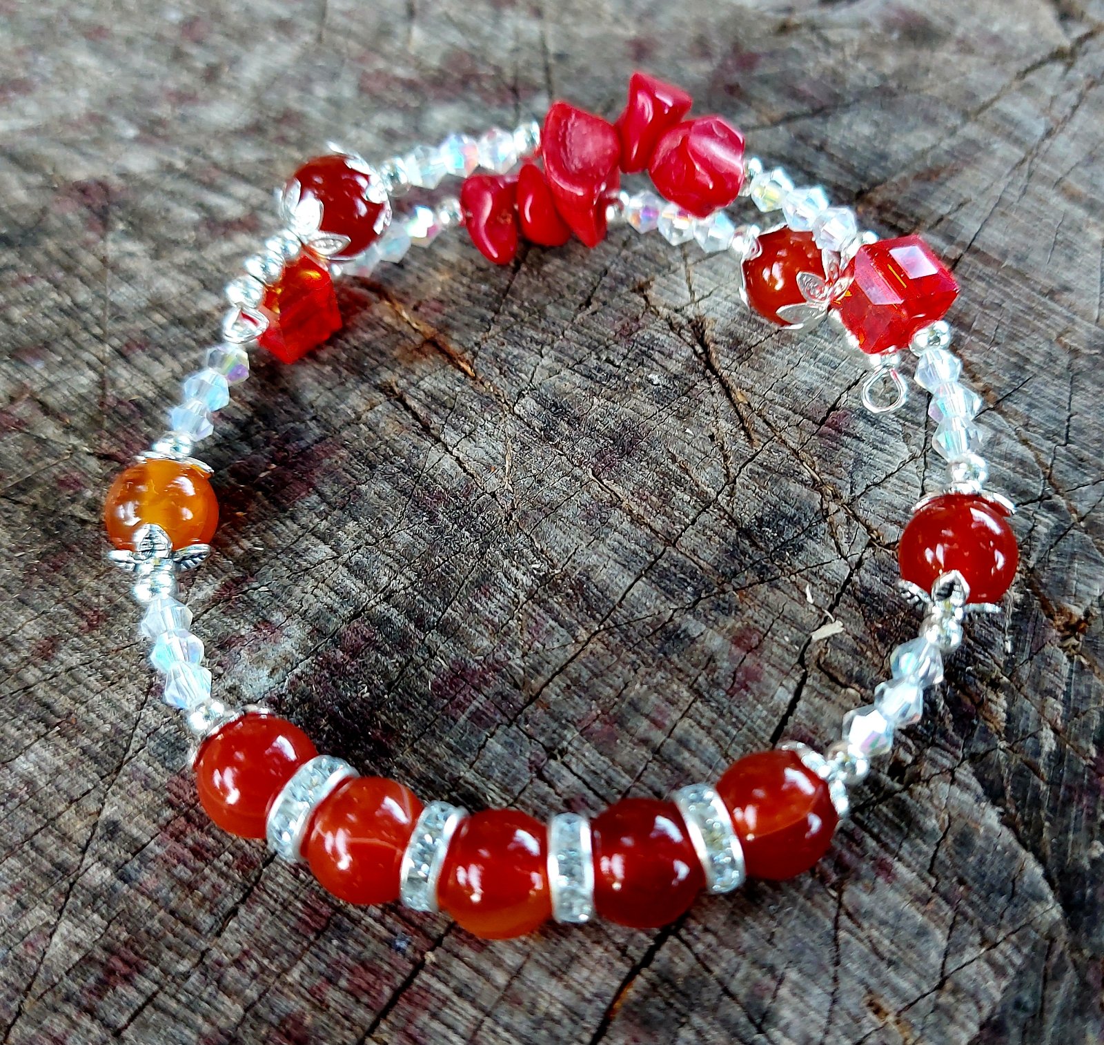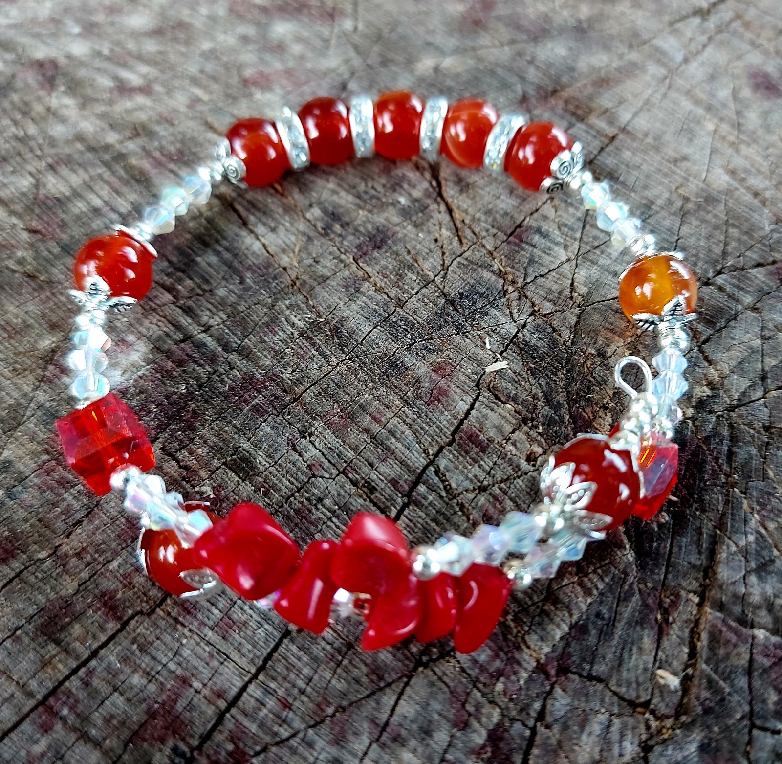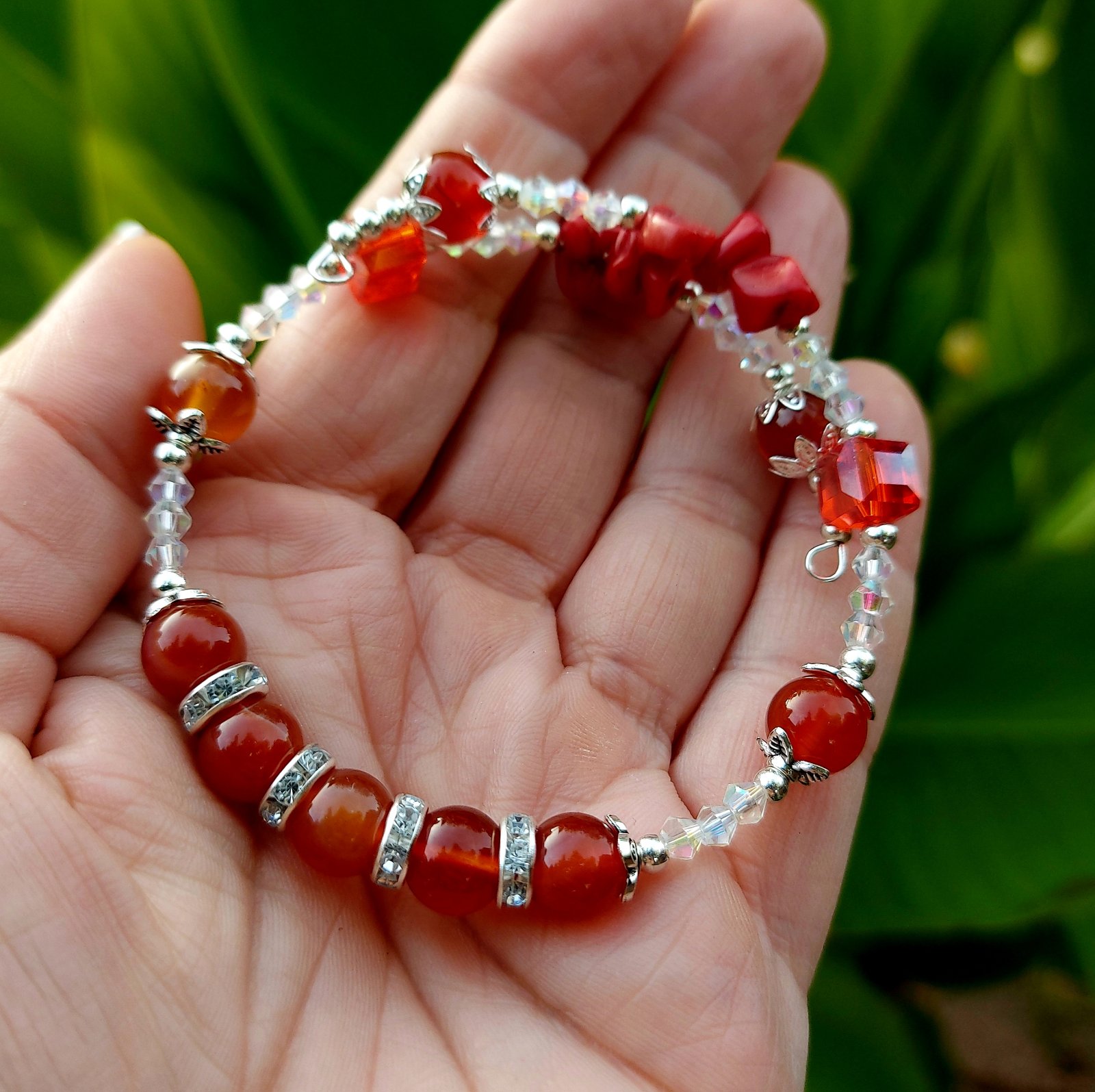 Tento jednoradový náramok z prírodného karneolu na nekonečnom prispôsobivom drôte v sebe nesie energiu života, odvahu a sebavedomie. Každý odtieň oranžovo-červenej korálky akoby pripomínal západ slnka — teplý, žiarivý a plný sily.