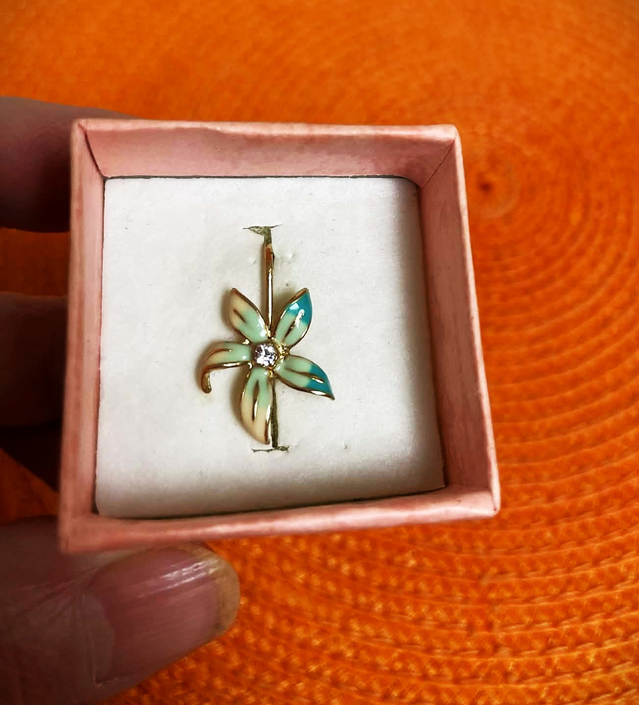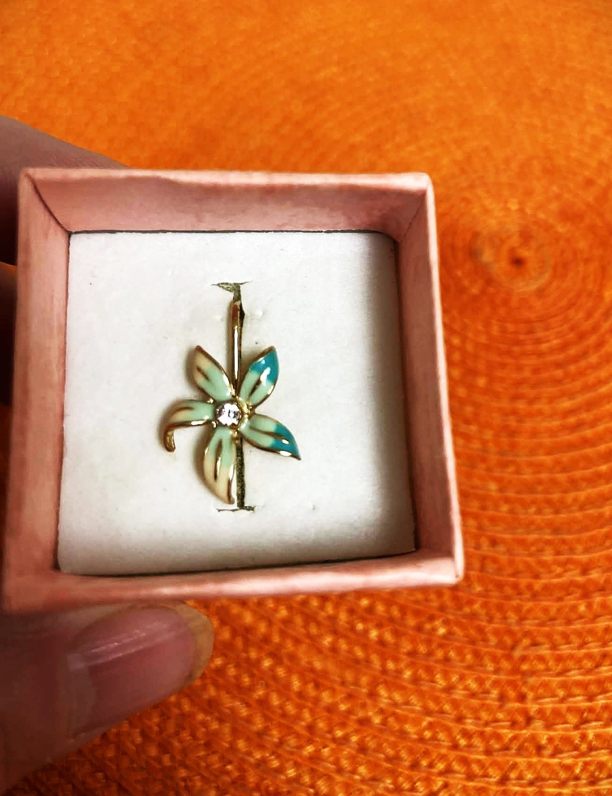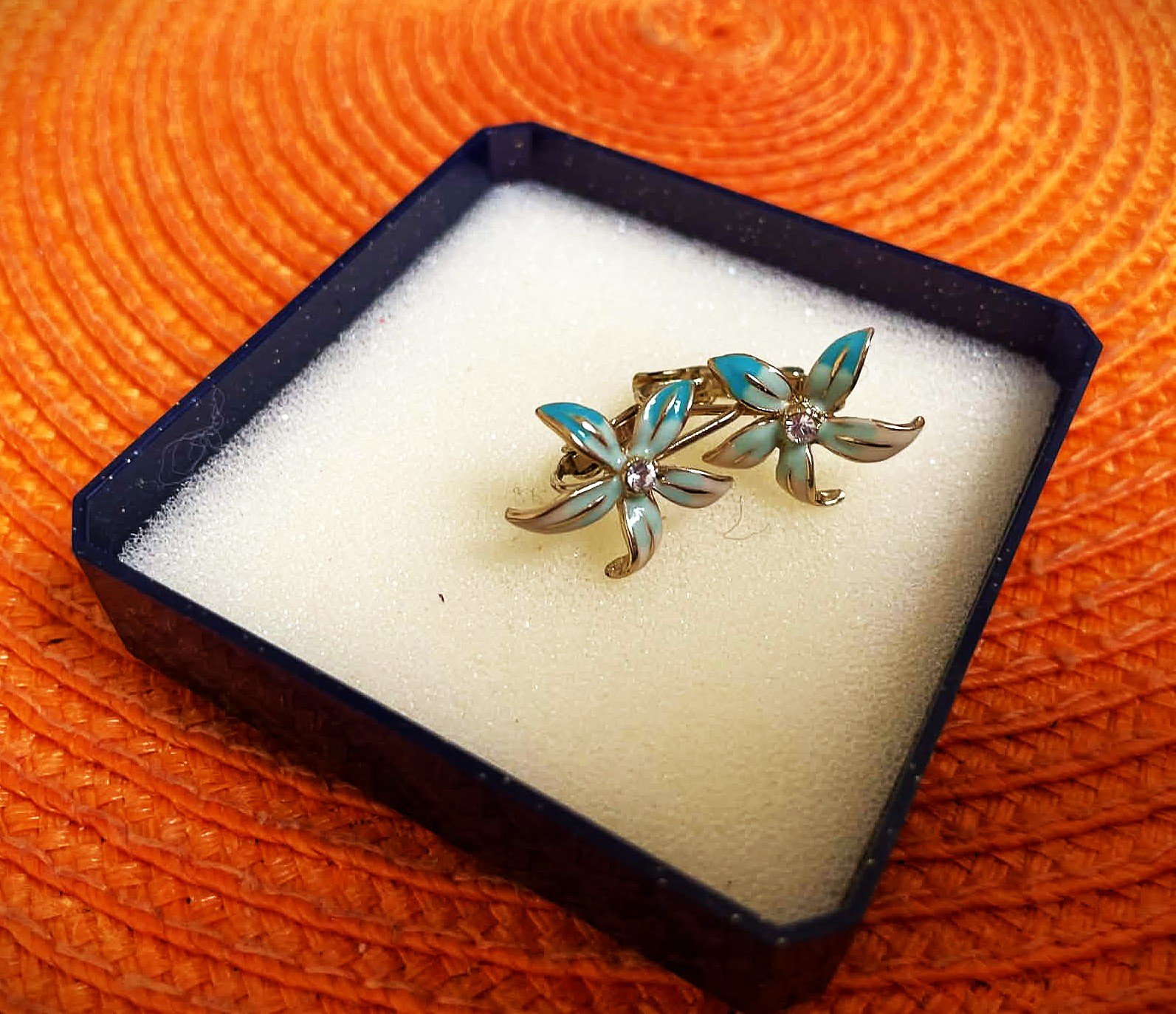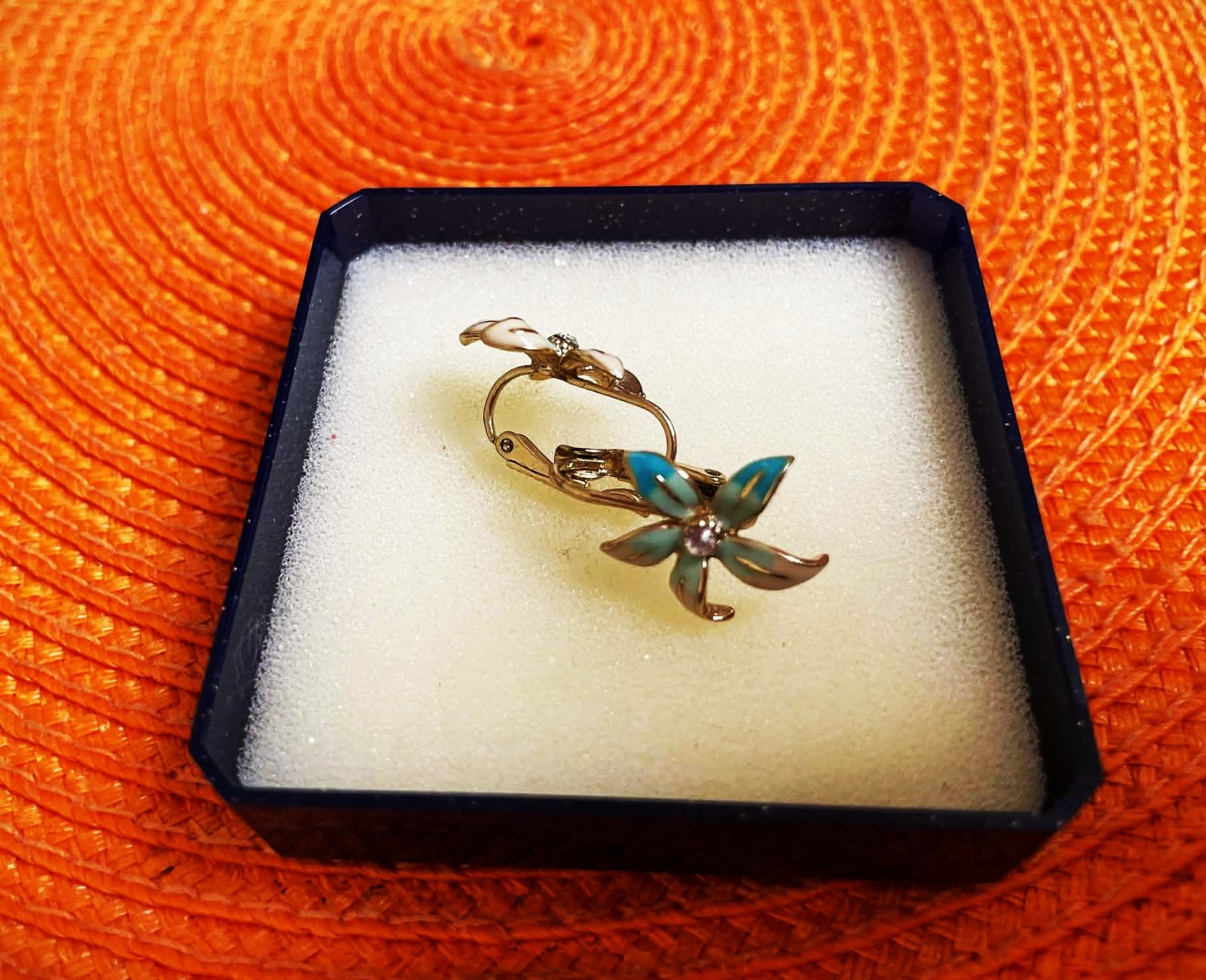 krásne náušnice,ktoré sú vyrobené zo smaltu na kovovom základe,modro-tyrkysovej farby so zlatými detailmi a drobným kamienkom v strede,retro alebo vintage kvetinový dizajn,top stav,celk. dlžka = 2 cm,kvietok = 1,5 cm - je to kvalitná bižutéria