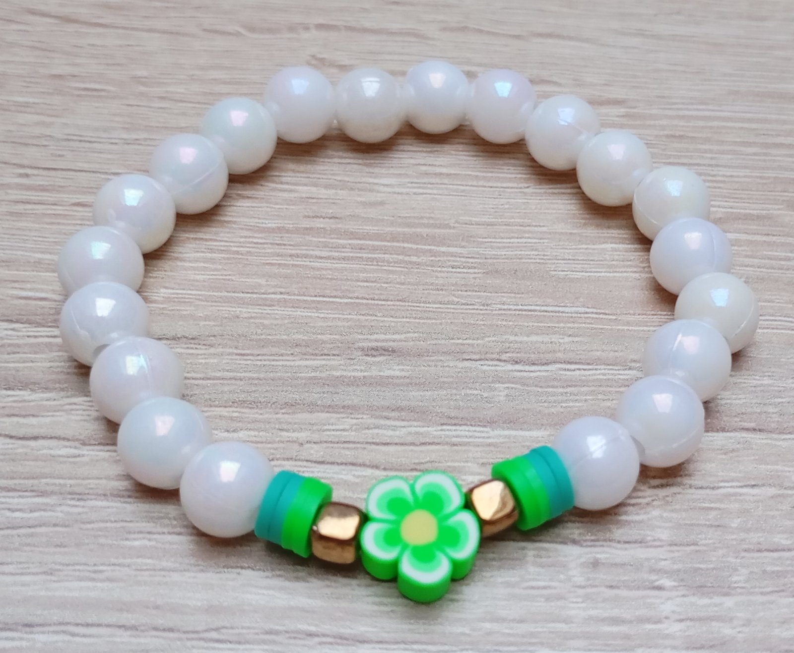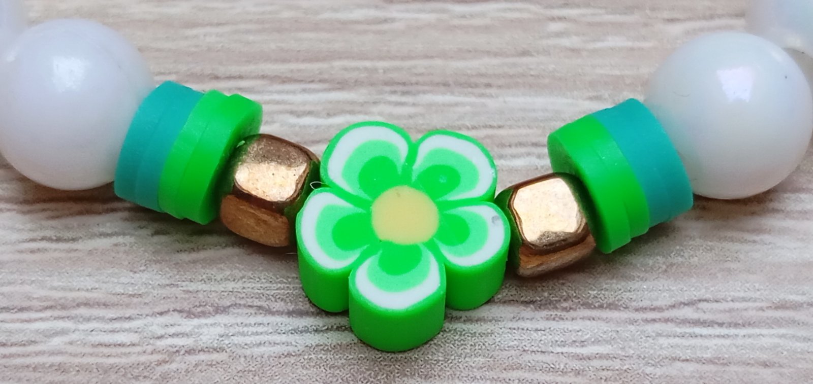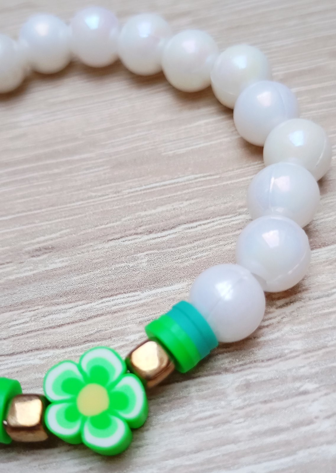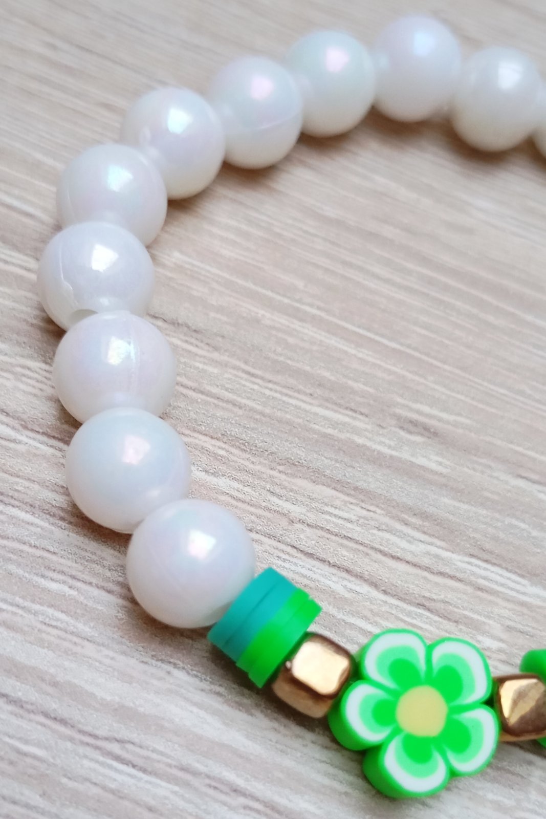 Jednoduchý náramok prevažne z bielych okrúhlych perleťových korálikov, s pár zelenými a zlatými korálikmi, vrátane stredného gumeného korálika v tvare zeleného kvietka.