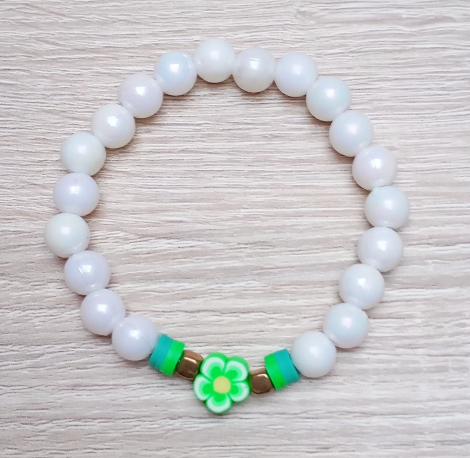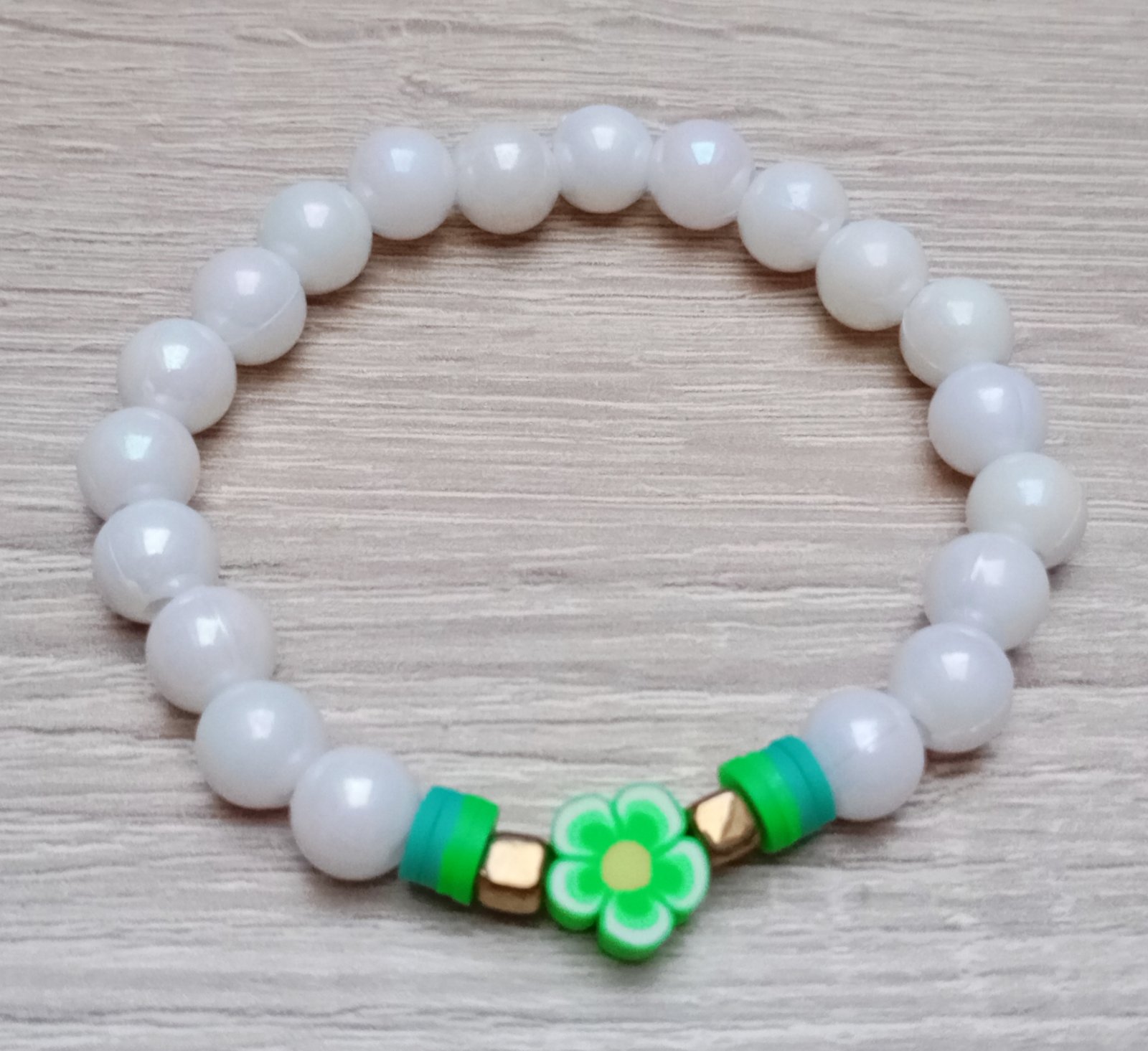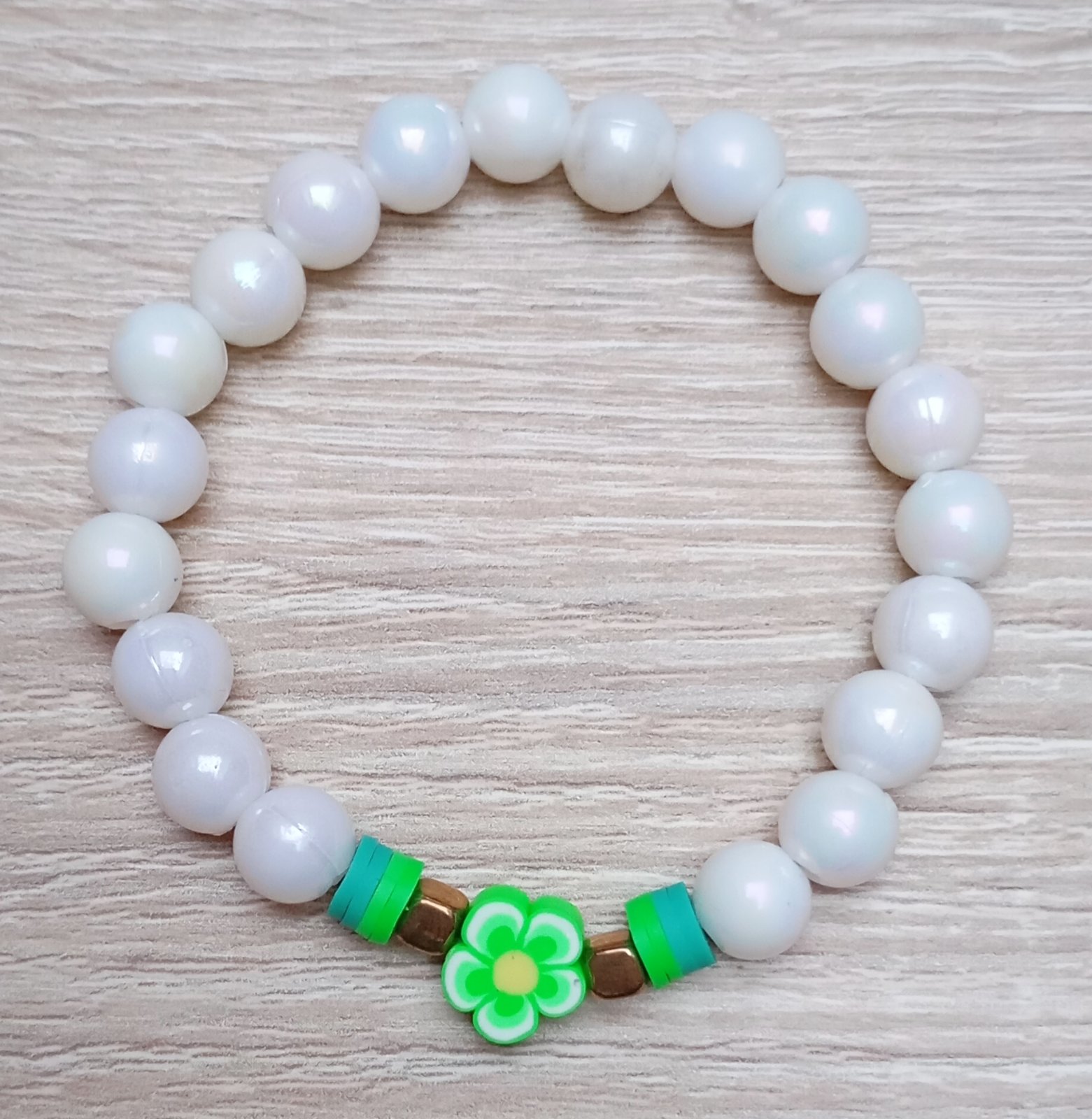 Jednoduchý náramok prevažne z bielych okrúhlych perleťových korálikov, s pár zelenými a zlatými korálikmi, vrátane stredného gumeného korálika v tvare zeleného kvietka.