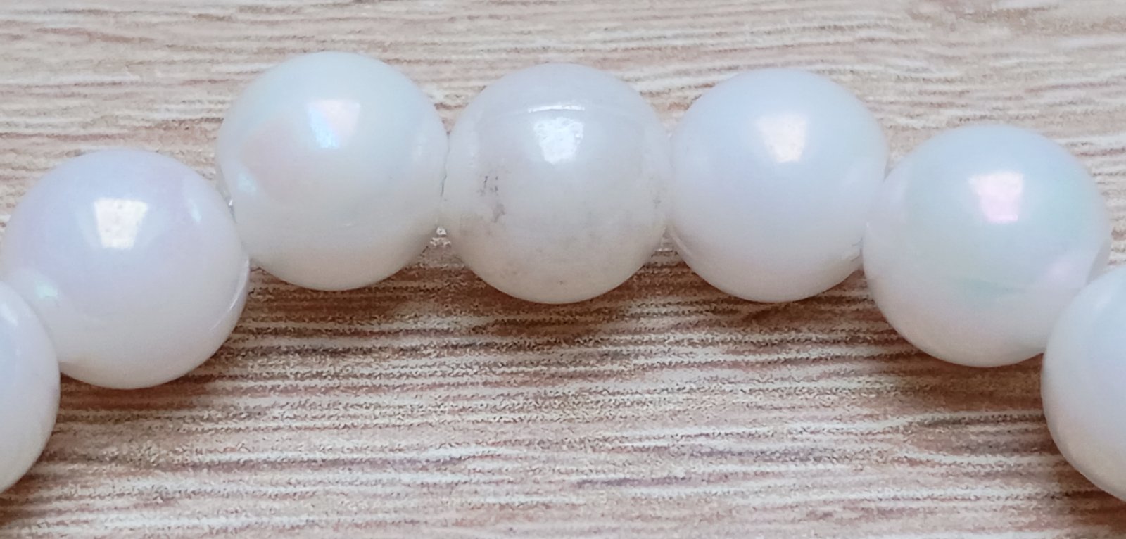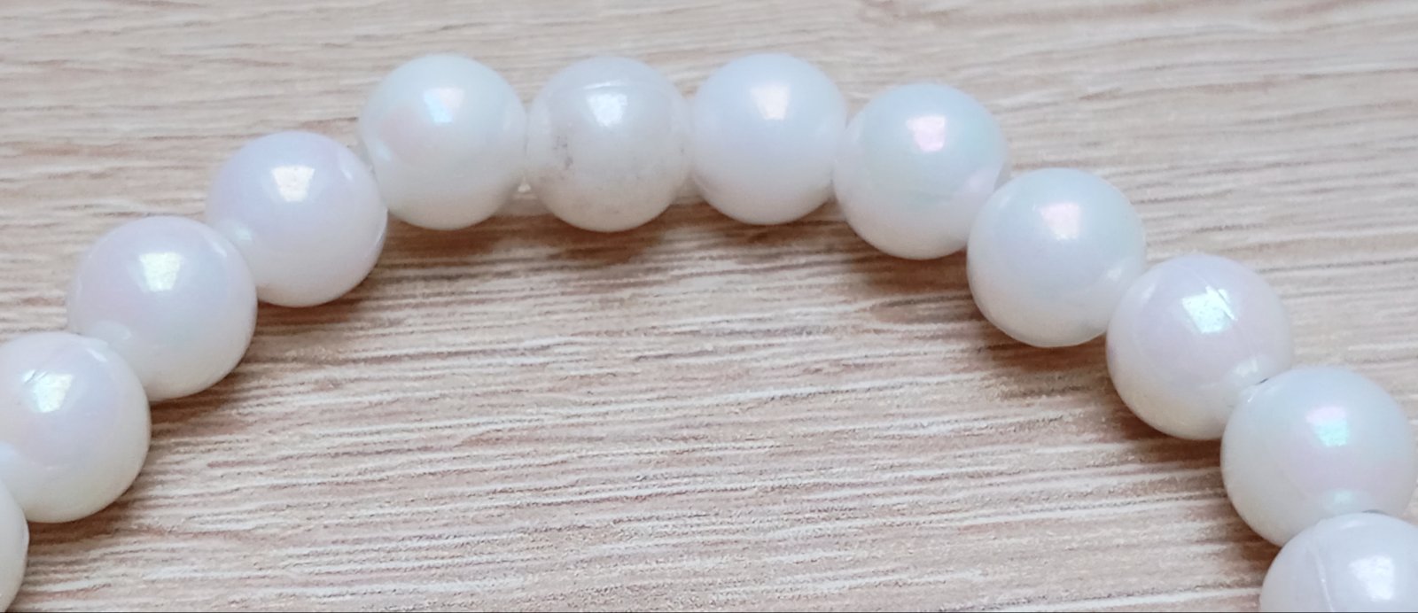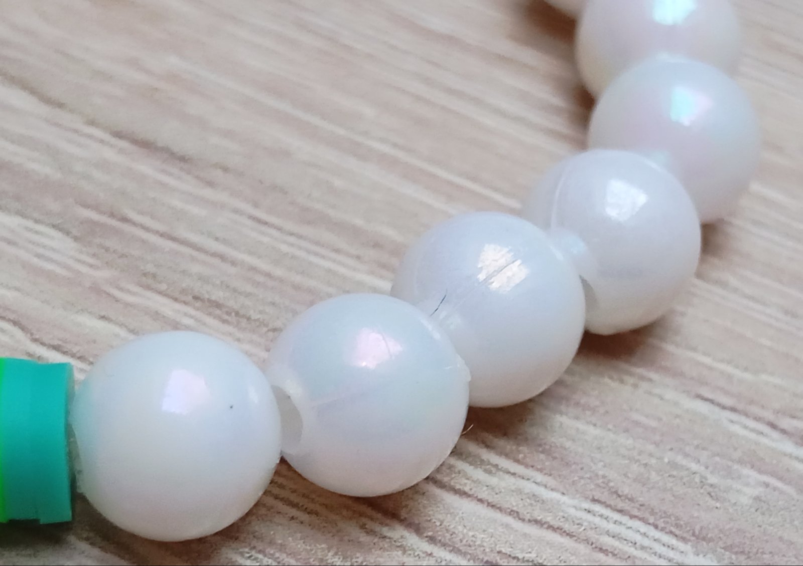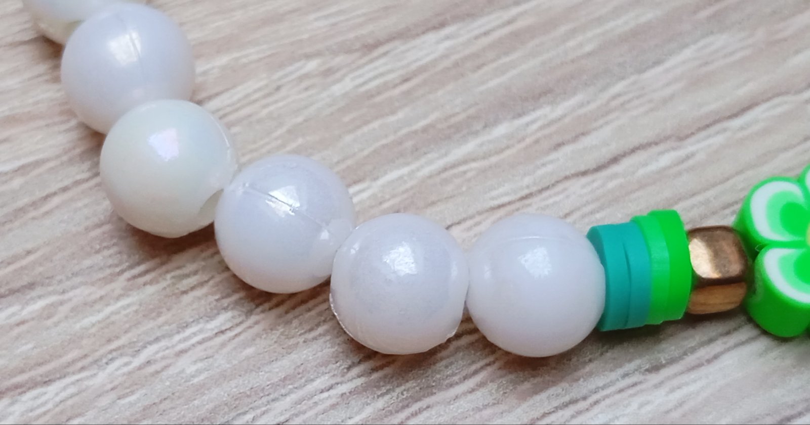 Jednoduchý náramok prevažne z bielych okrúhlych perleťových korálikov, s pár zelenými a zlatými korálikmi, vrátane stredného gumeného korálika v tvare zeleného kvietka.
