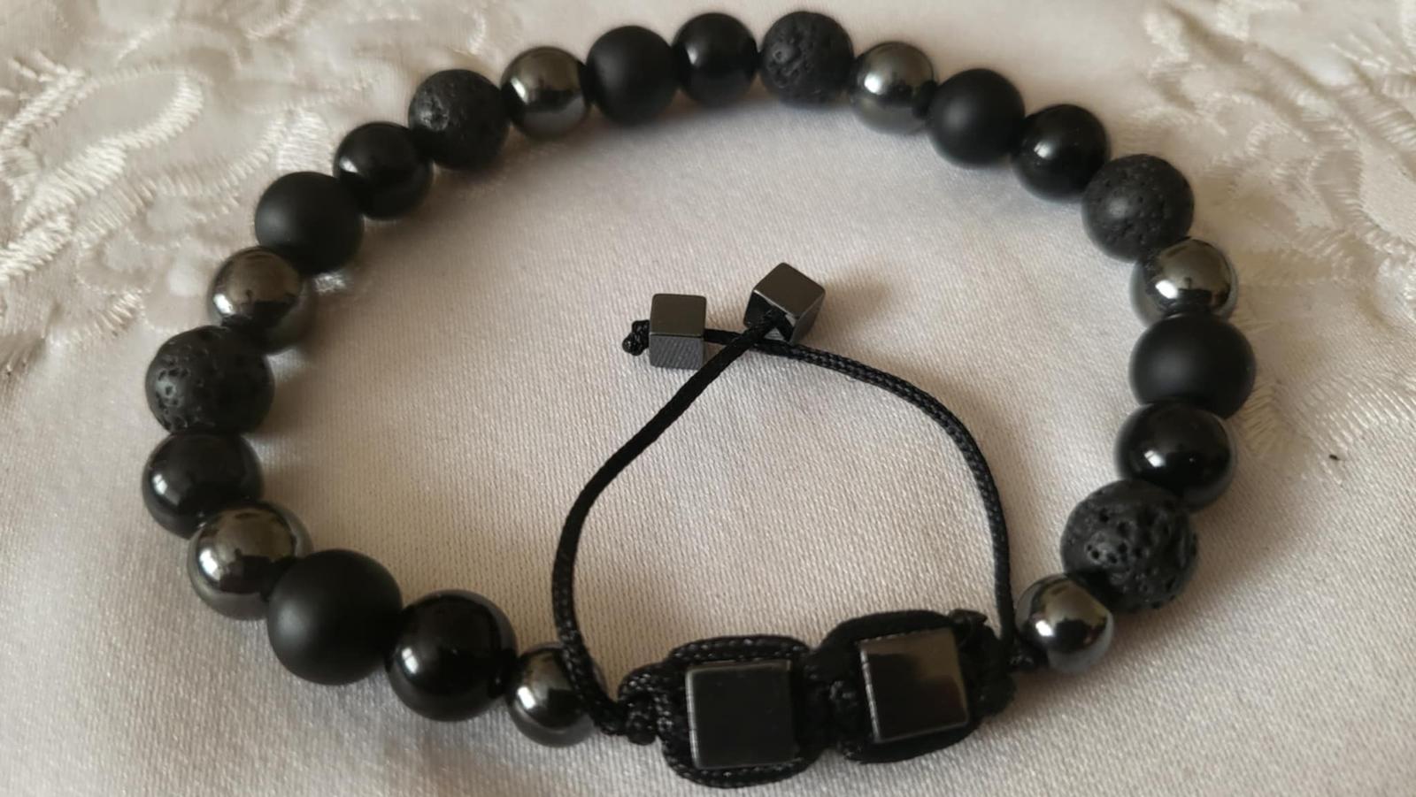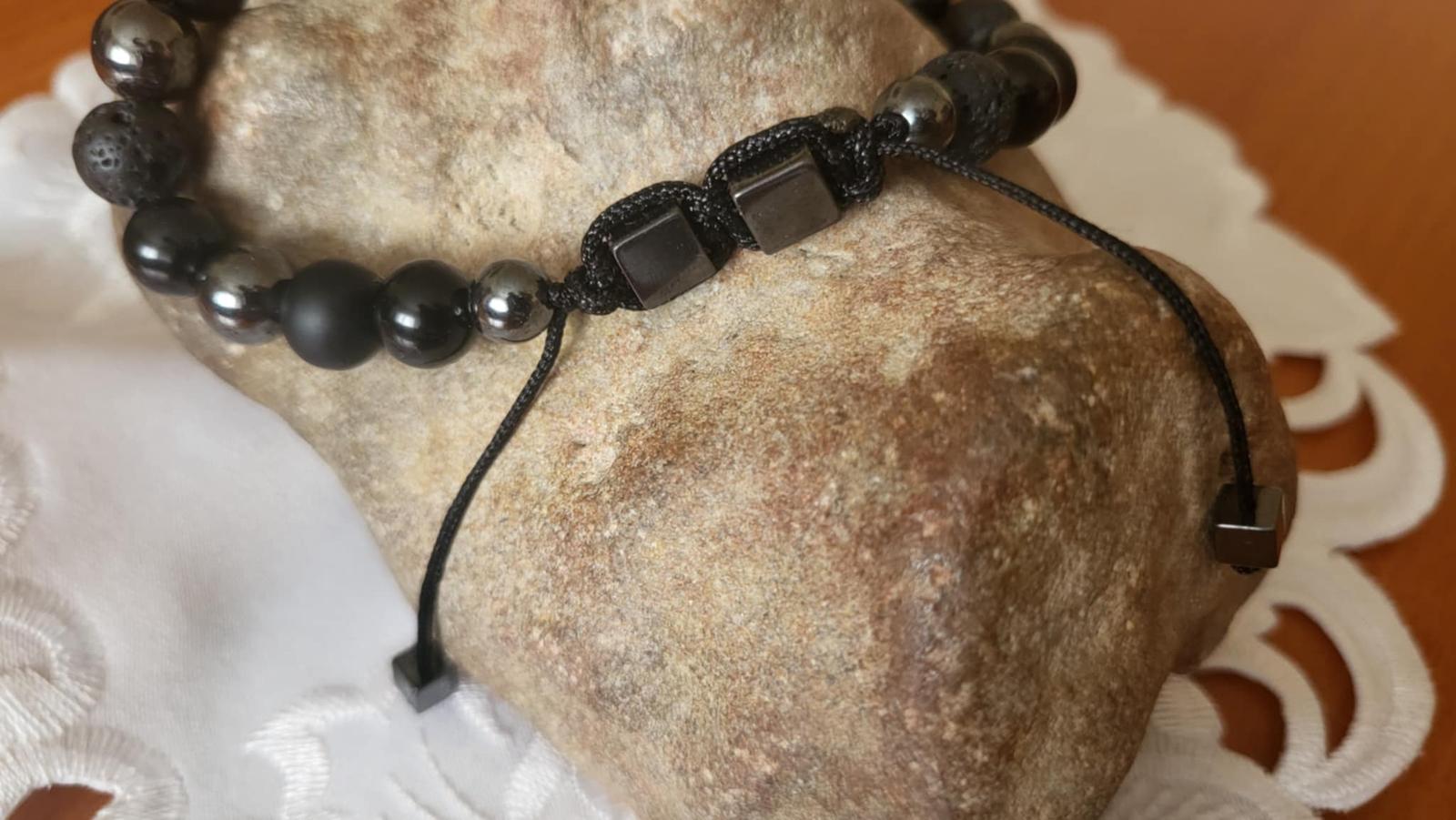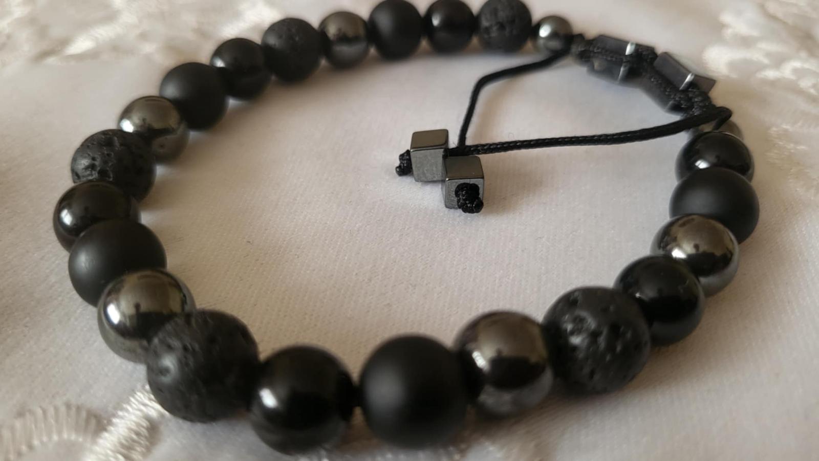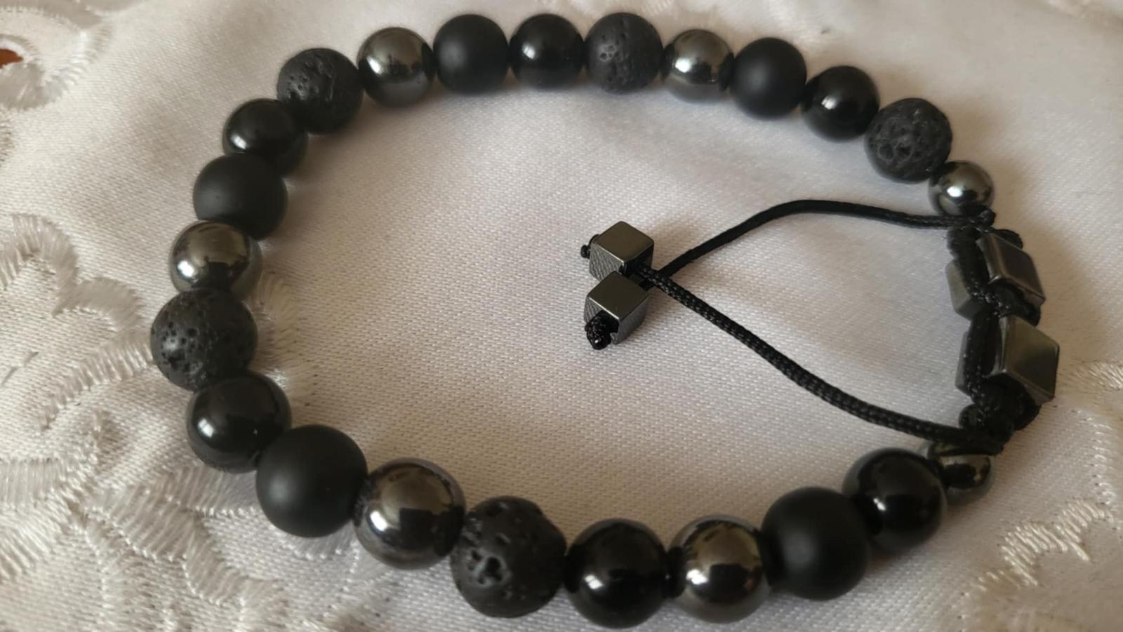 Štýlový náramok vyrobený z minerálnych korálok ónyx, lesklý obsidián, láva, hematit, pre moderného muža. Zaťahovanie náramku. Šnúrka čiernej farby, ukončená korálkami kockami hematit. Veľkosť cca. 19 - 20 cm a posuvný. Posielam po prevode na účet. - s podacínm lístkom - možnosť sledovania zásielky. Osobný odber možný, zľava. Poštovné a balné v cene.