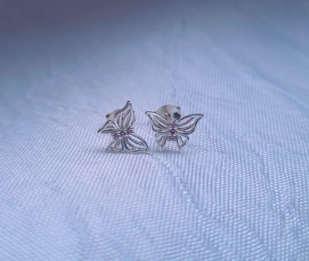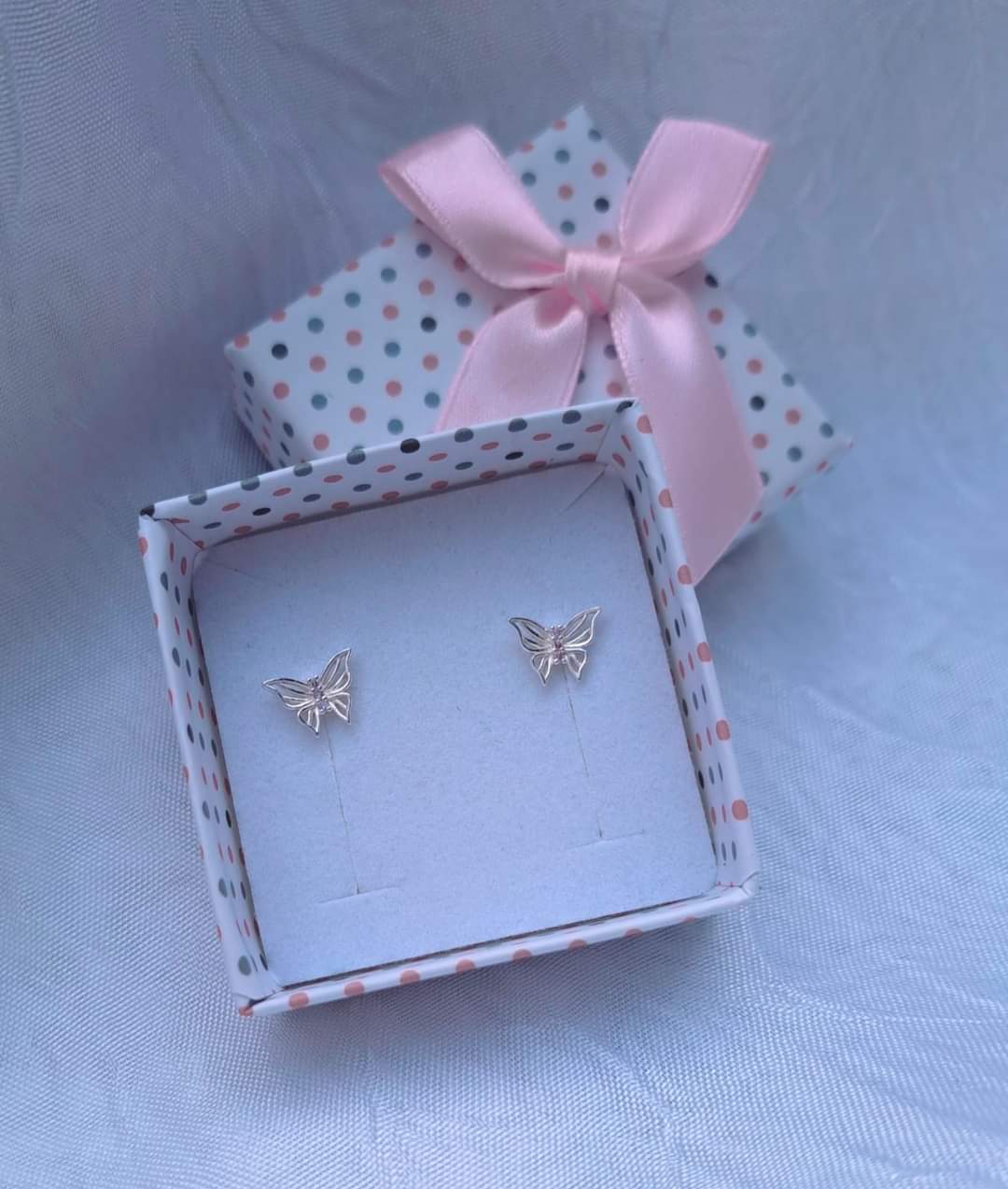 Strieborné puzetové náušnice Motýľ 🦋 s troma ružovými zirkónmi 🩷💎🩷