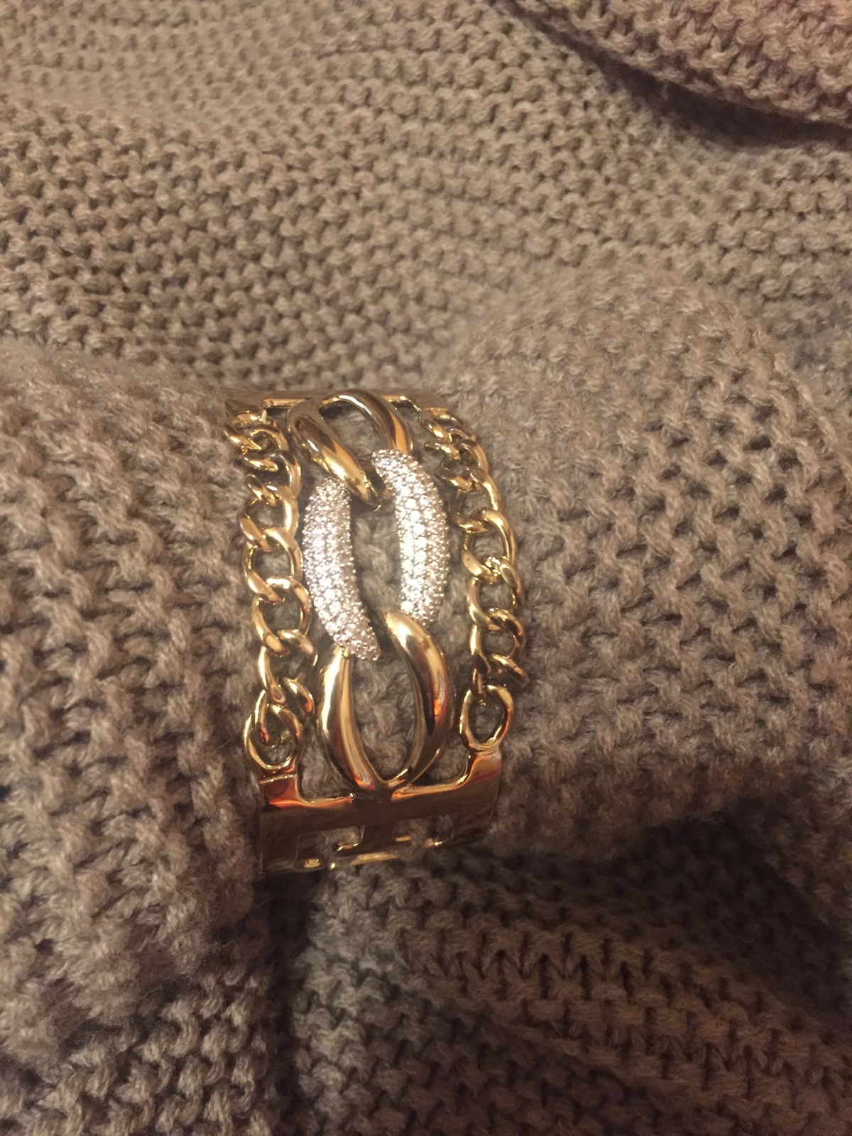 Krásny pevný naramok, nemá zapínanie, nasuva sa na ruku, skôr na užšiu ruku..zlata farba, kamienky nechýbajú,pekný stav, miestami malinko patina