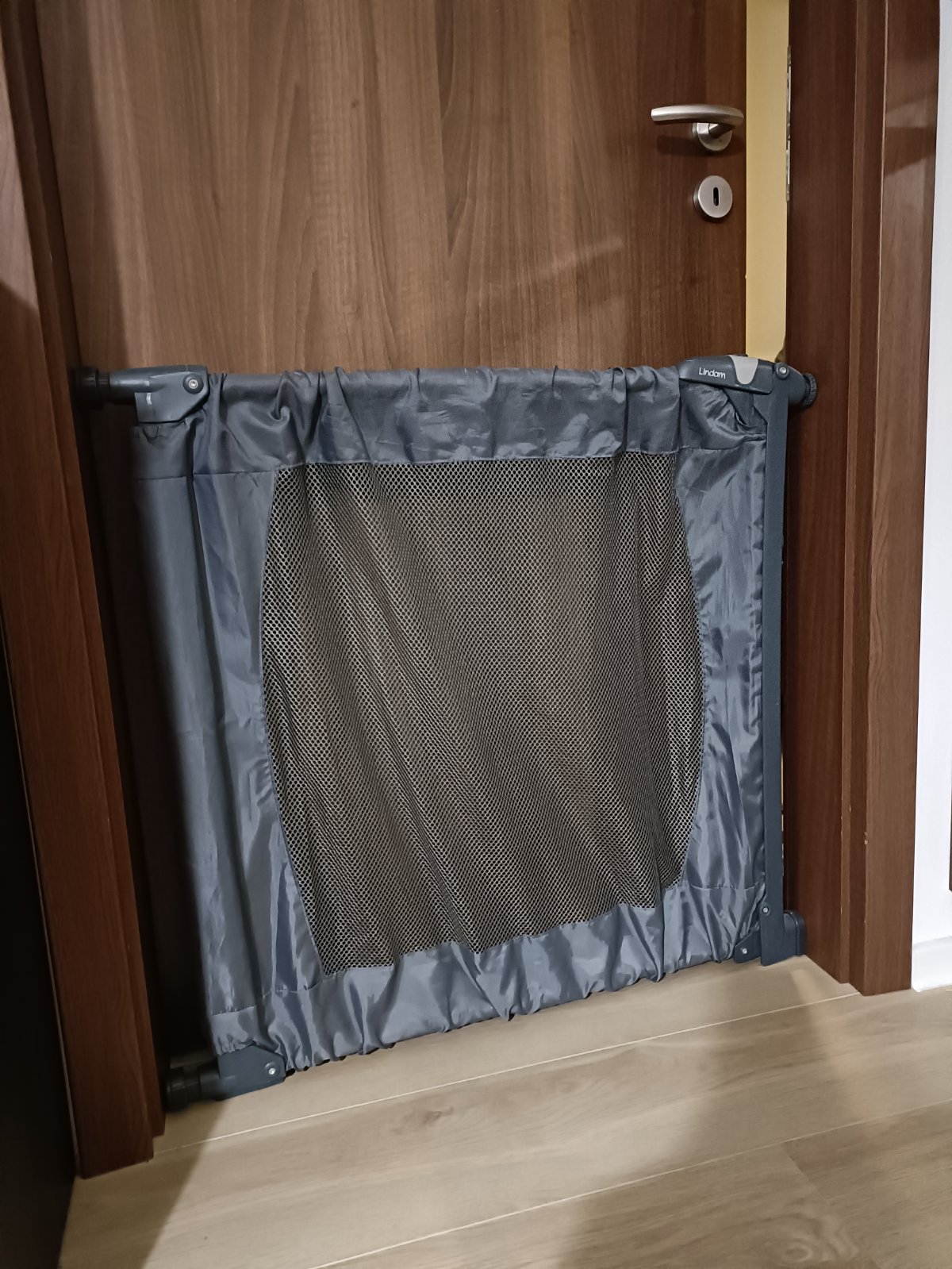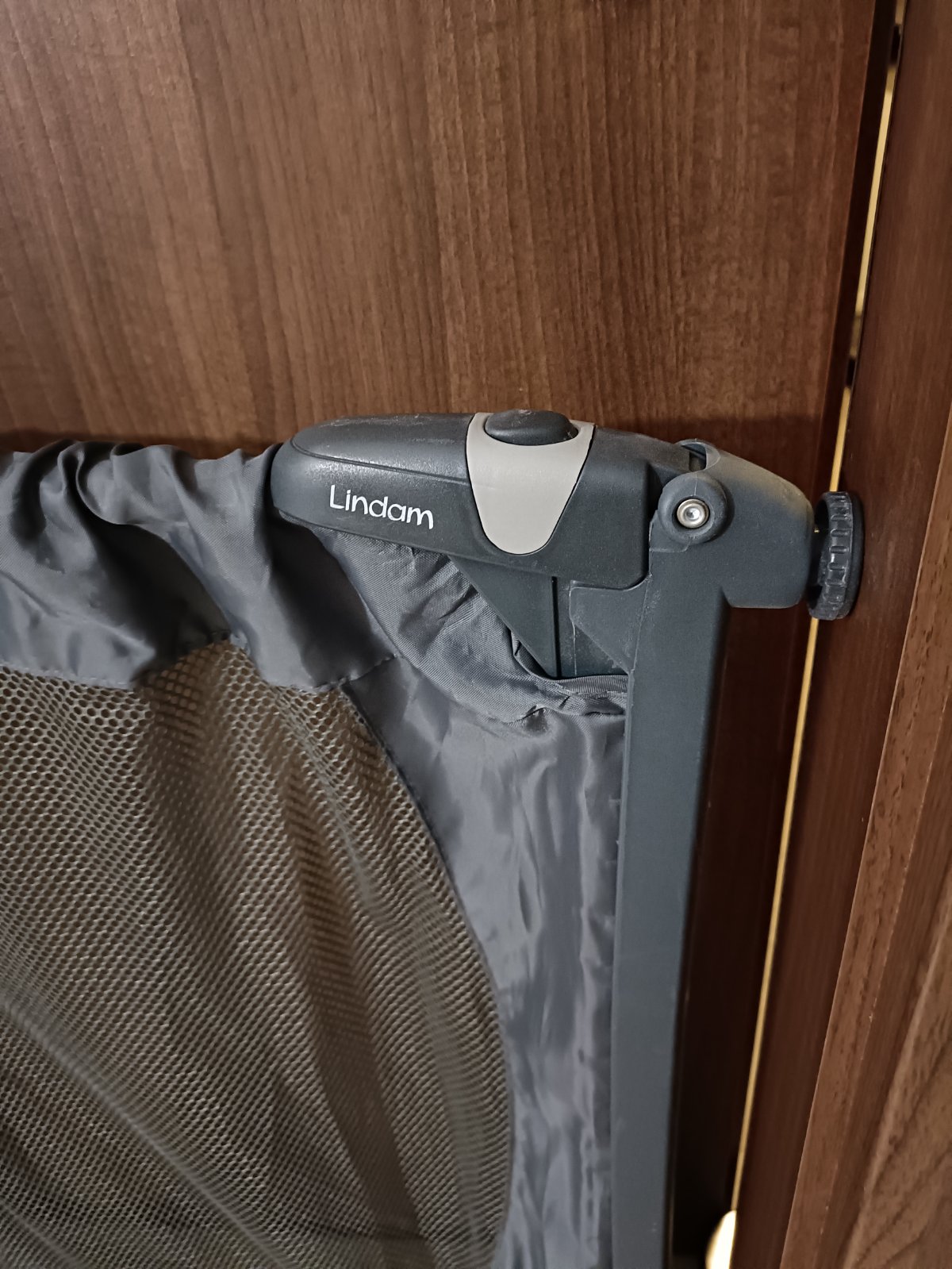 Výborná skladná cestovná zábrana do dverí alebo na schody značky Lindam. Sieťka nepoškodená, len samozrejme úchyty už majú drobné oškreninky z používania. Ale plne funkčná.