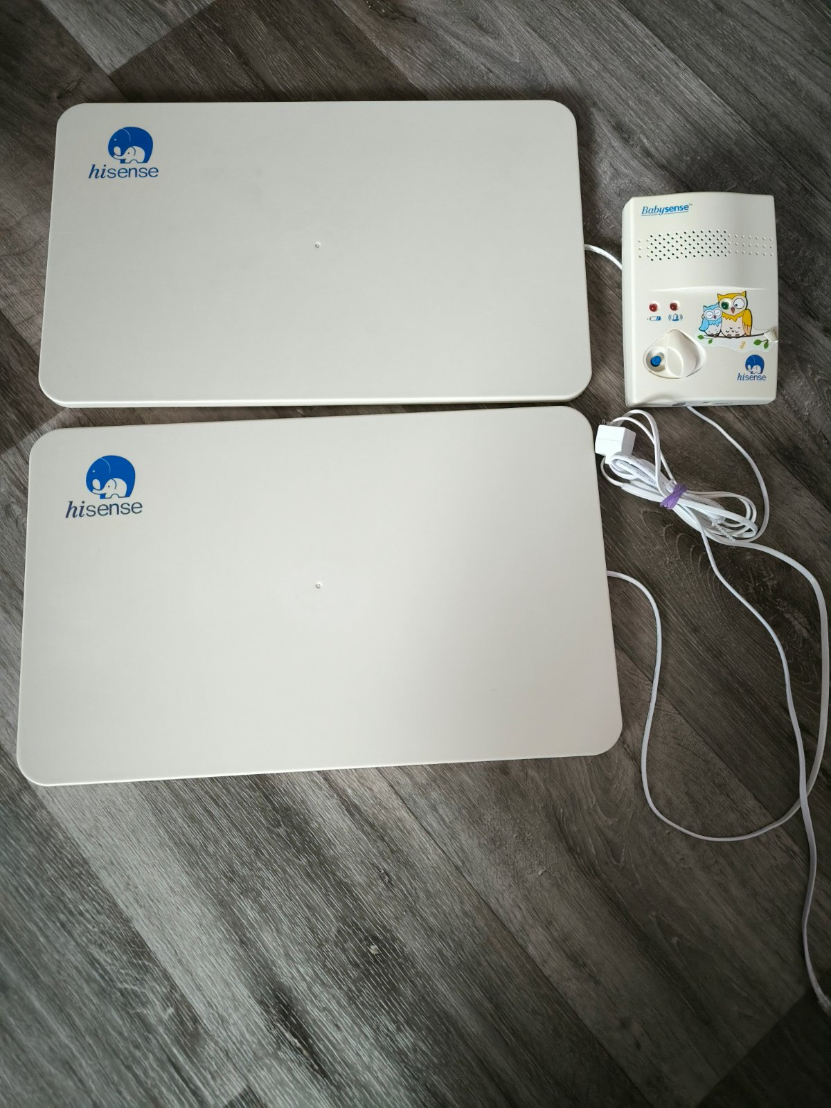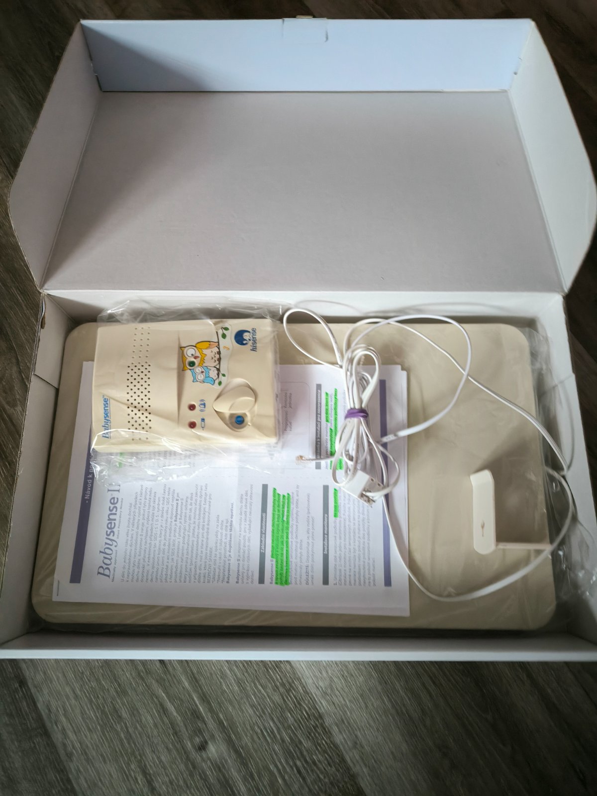 Spoľahlivý monitor dychu, má 2 podložky. Funguje na baterky, dosť dlho vydržia, nie je potreba ich často meniť. Plast je trošku zažltnutý, ale inak bez poškodení, s krabicou aj návodom.