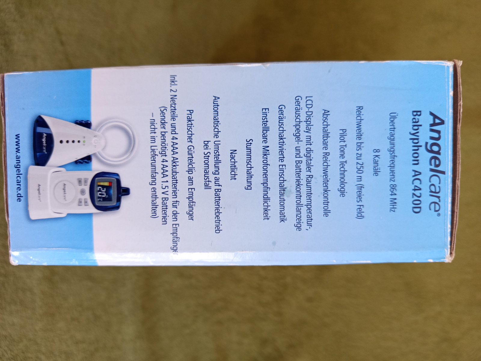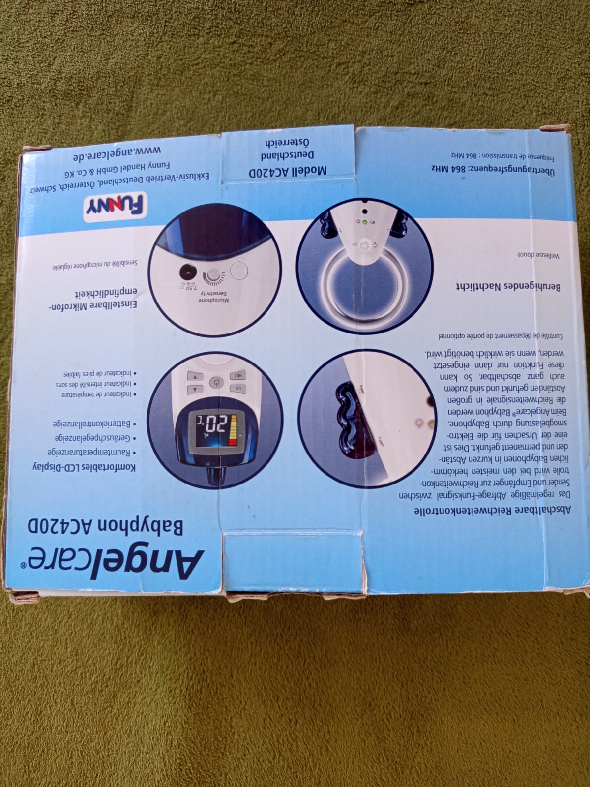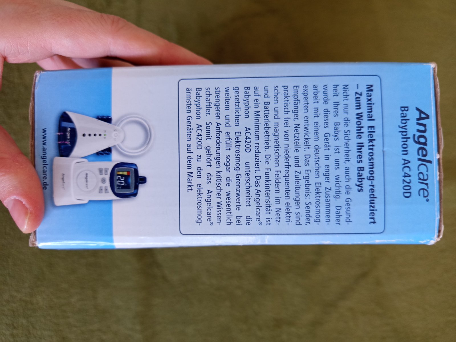 Angelcare bol vyvinutý v úzkej spolupráci s nemeckými odborníkmi na elektrosmog. Vysielač, prijímač a káble sú úplne bez elektrických a magnetických polí. Intenzita rádiového žiarenia je znížená na minimum. AC420 vysiela bez pulzných rádiových vĺn DECT, trvalý prenos vysielania je voliteľný s odpojiteľnou kontrolou dosahu.