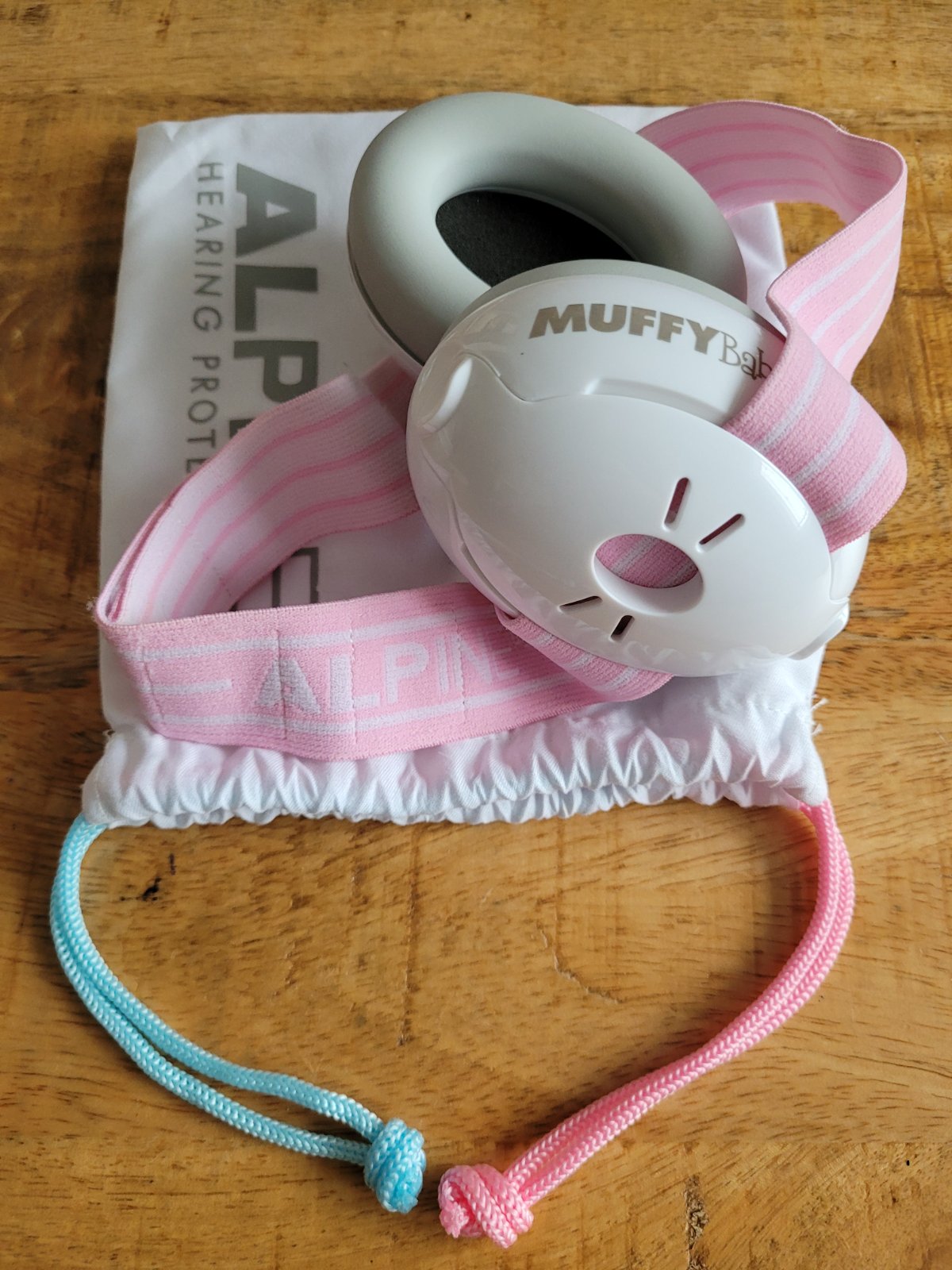 Chrániče sluchu pre bábätká v praktickom prenosnom vrecku. Použité boli 1x. Nová elastická čelenka v sivej farbe, čiže vhodné aj pre chlapčeka.
