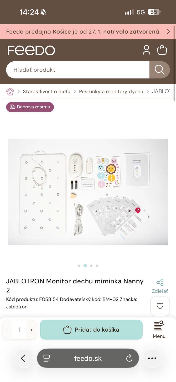 Dobry den, Predam dole uvedené produkty, ktore boli pouzivane cca 1 rok. Všetky produkty su plne funkčné a vhodne na ďalšie použitie . 2. Monitor dychu - JABLOTRON Monitor dechu miminka Nanny Ce...