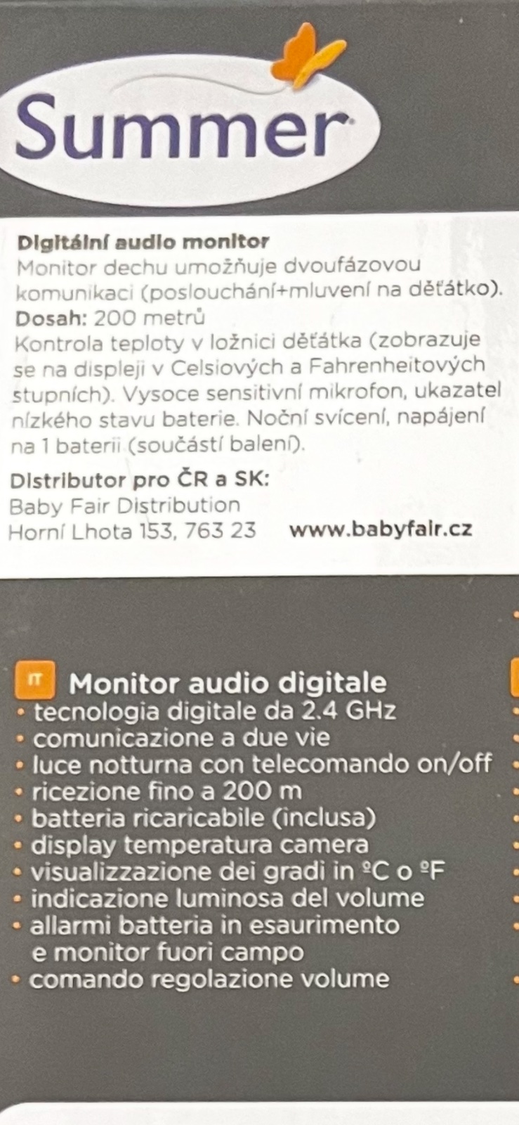 Vysoko spoľahlivý Dvojfázový monitor- počúvanie a zároveň hovorenie na bábätko, veľký dosah a vysoka kvalita zvuku- vysoko senzitívny mikrofón , ukazuje teplotu v izbe babatka, nočné svetielko - motýľ, na elektriku.