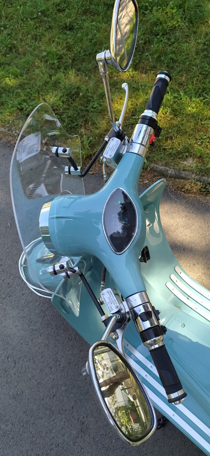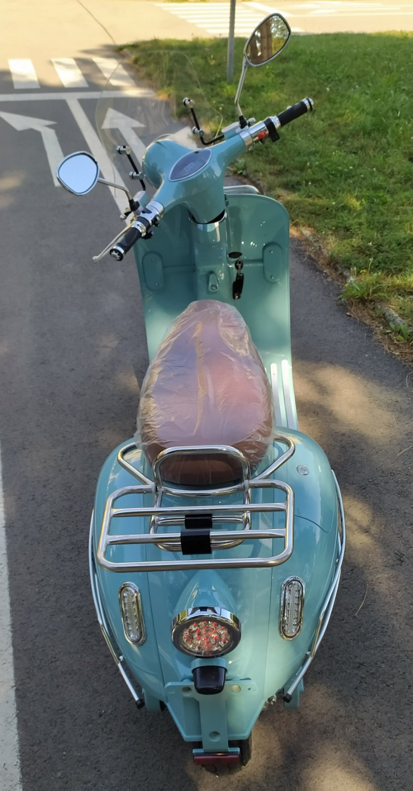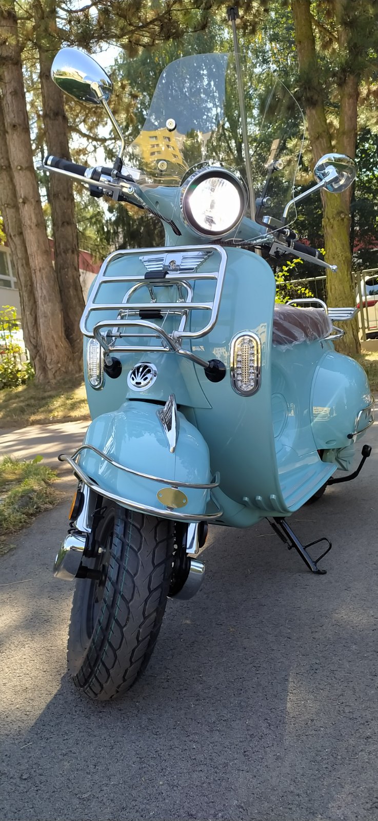 Predám nový, veľmi pekný elektro skúter ViaGo Bologna 2000W Classic so záručným listom, svetlo modrá, Li-ion batéria 60/20Ah, nabíjačka batérie 60V/4Ah, doplnky predný a zadný nosič, veterný plexisklový štít, chrómové dekoratívne prvky, rekuperácia, motorová brzda, hydraulické brzdy, alarm, dojazd 50 km/h, možnosť dokúpenia druhej batérie, max. rýchlosť 45 km/h