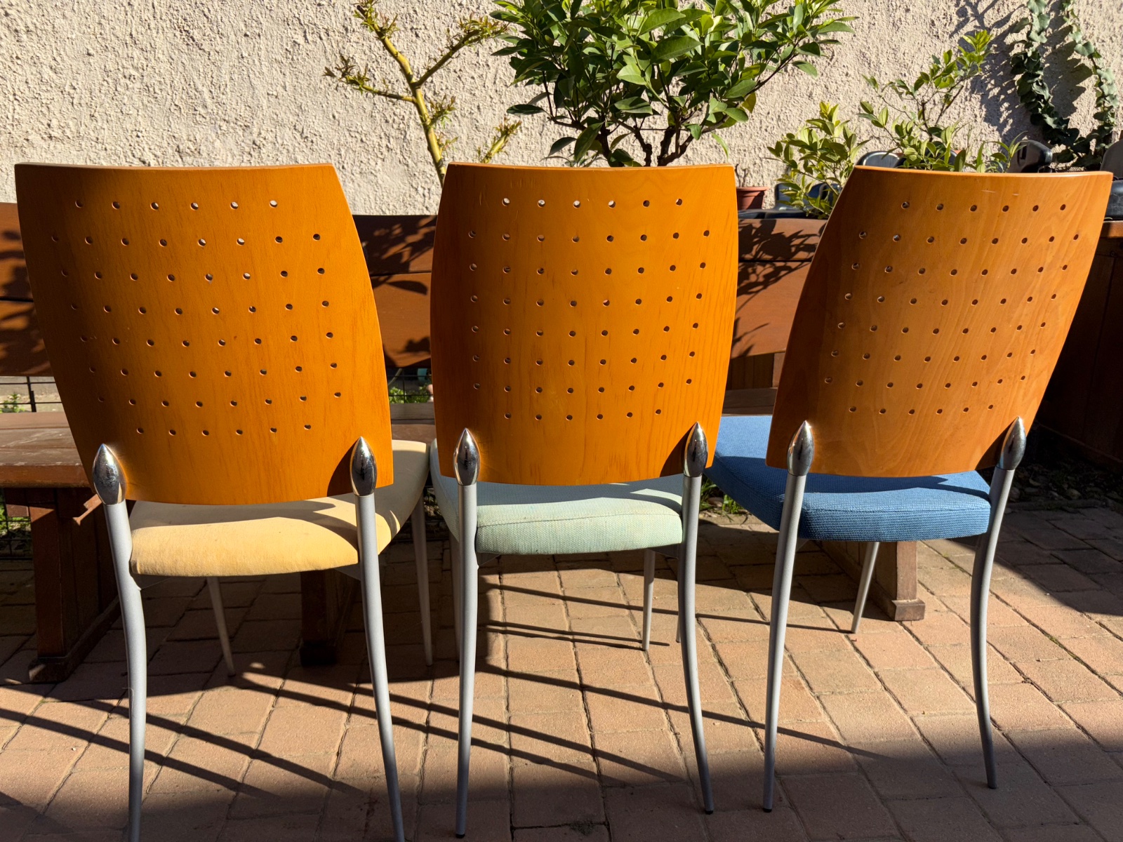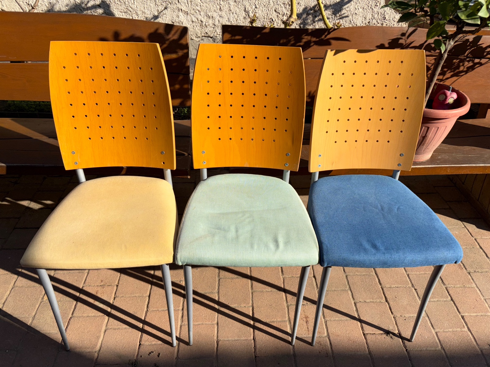 Predám stoličky 6ks farebný poťah kvalitné…ťažké treba len poťah miestami vyčistiť :-).Stoličky mám vo farbe 2x modrý poťah + 2x žltý poťah + 2x zelený poťah.